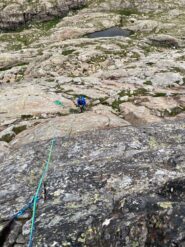 dalla Sosta 4 proseguire in conserva 1° per cresta in direzione Nord poi deviare a destra scendendo nella conca tra i due avancorpi e risalire verso l’attacco del secondo avancorpo, che si trova in un canale ometto alla base