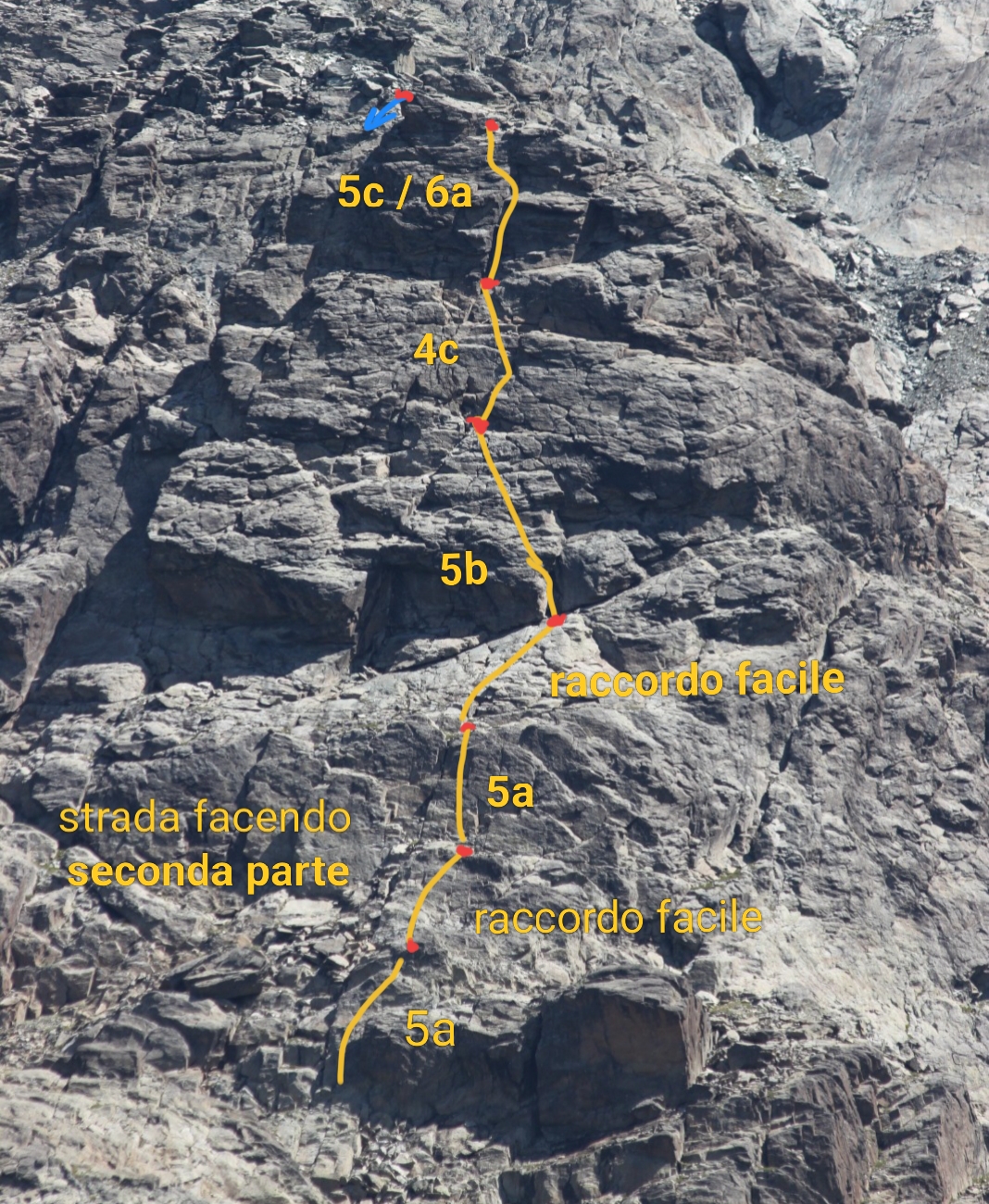 - L11-35 metri, il tiro chiave della via, salire per il diedro 1 fix sopra il primo tettino 5c continuare dritti 1 fix, superare un secondo muretto strapiombante 6a 1 fix + 1 chiodo, proseguire sulla placchetta appoggiata fino a un fix a sx sul diedro, uscire a sinistra in placca 5a e poi 4b e proseguire fino alla sosta (2 fix)