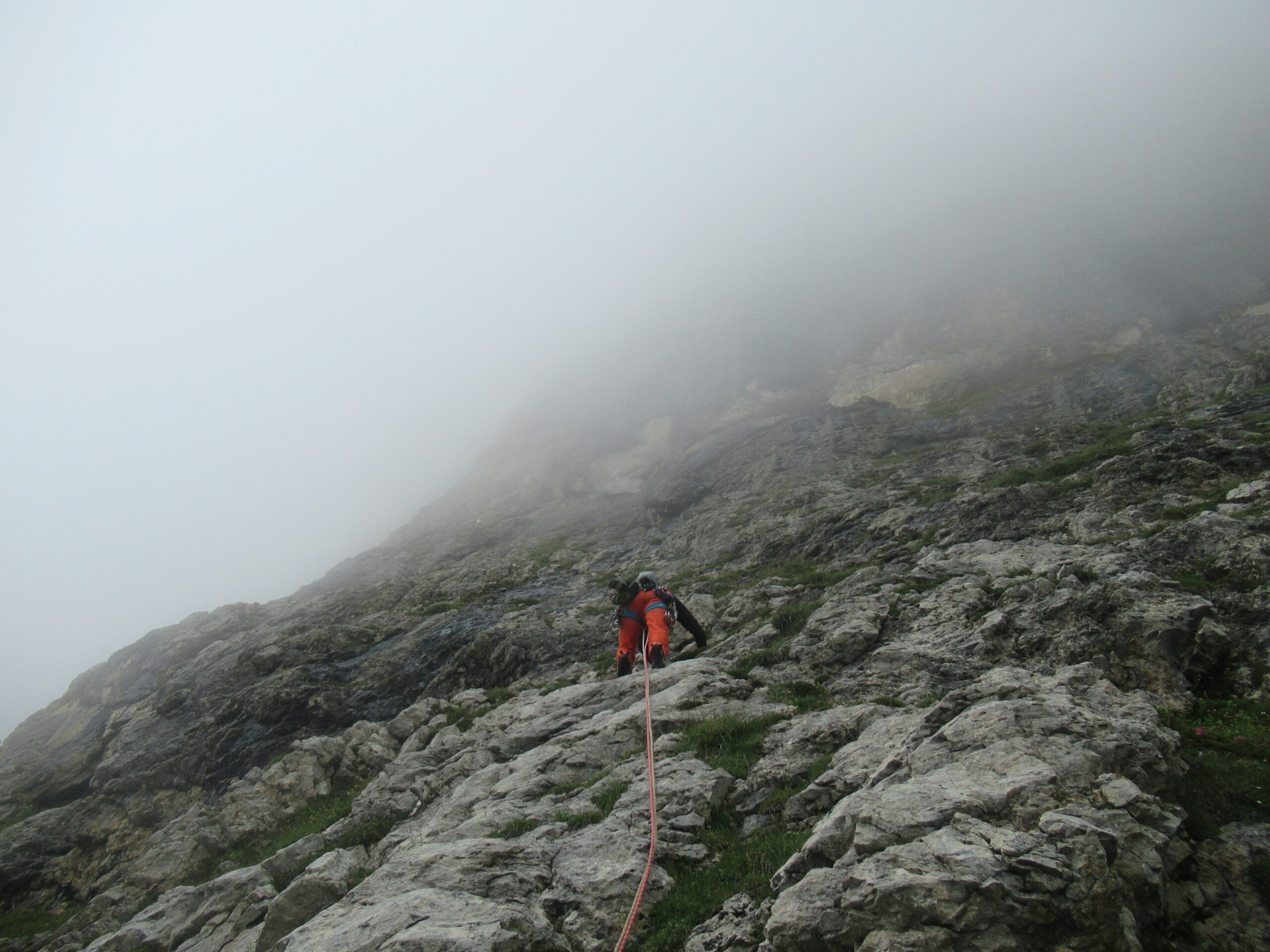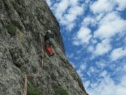 L1: 4b, 50 m, facili placche appoggiate (sosta in una nicchia sotto un ampio arco strapiombante)