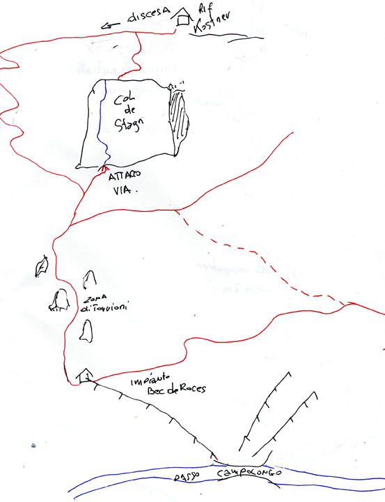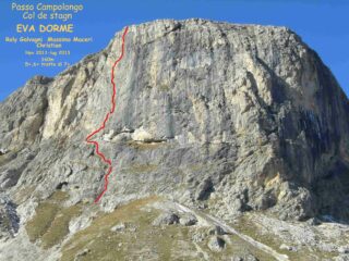 Discesa: dalla fine della via, salire per traccia fino a vedere il rifugio Kostner, poi per sentiero si ritorna alla base