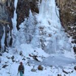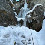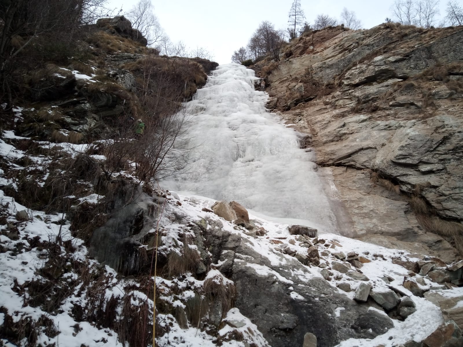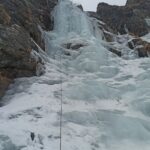 - seguire per circa 60 metri il fondo ghiacciato del torrente arrivando alla base del secondo salto 25 m 70° sosta su pianta;