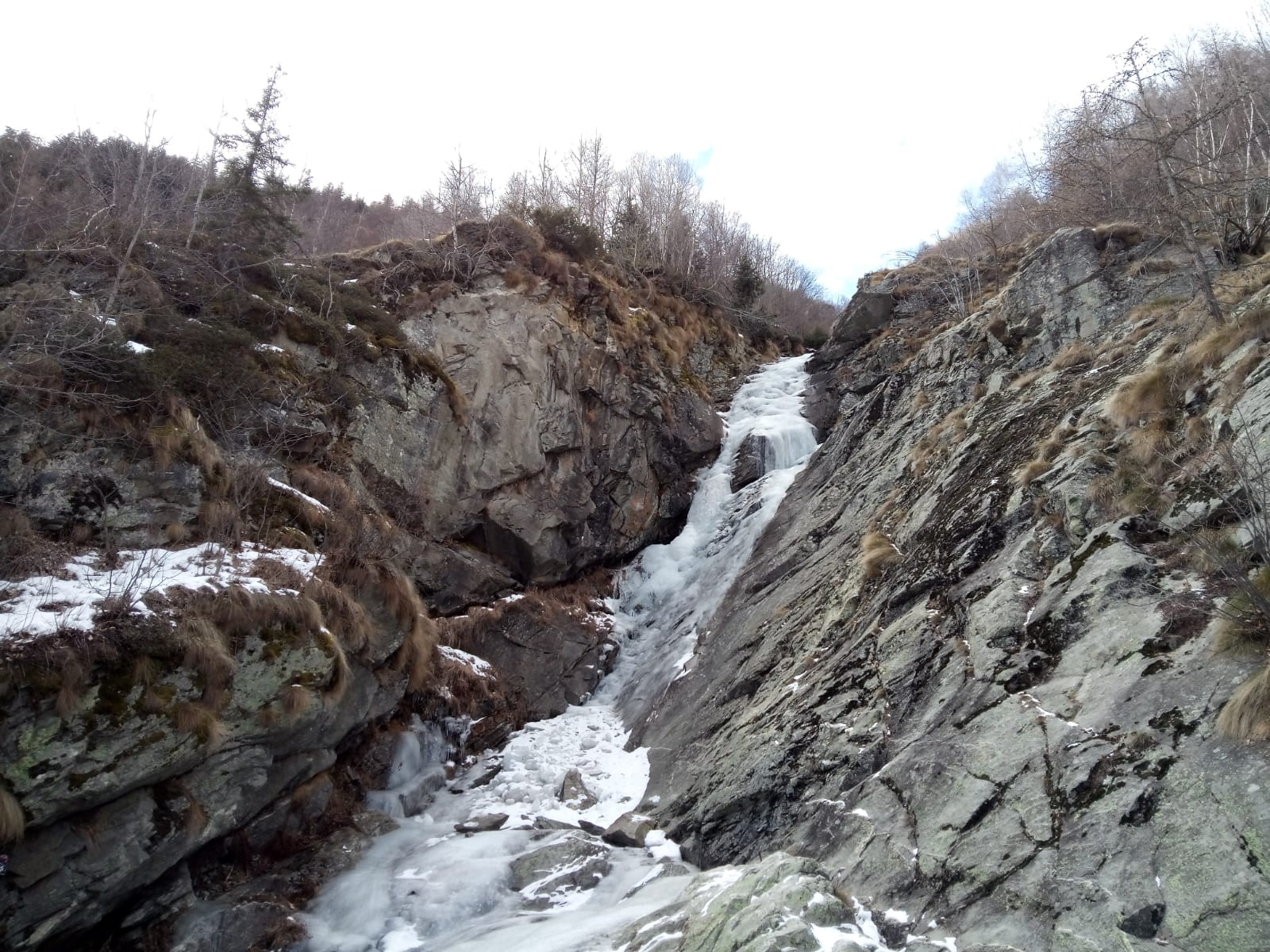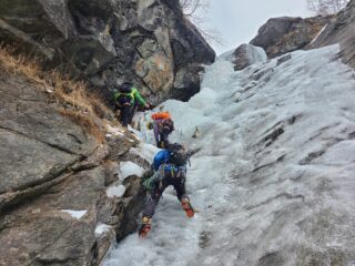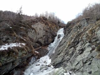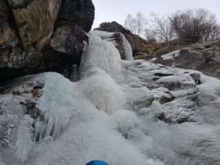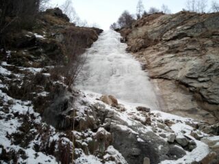 Cascata completa e abbastanza ben formata, un po’ sottile in alcuni tratti ma interamente arrampicabile. l’ultimo tratto, facile, con ghiaccio morbido.