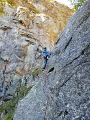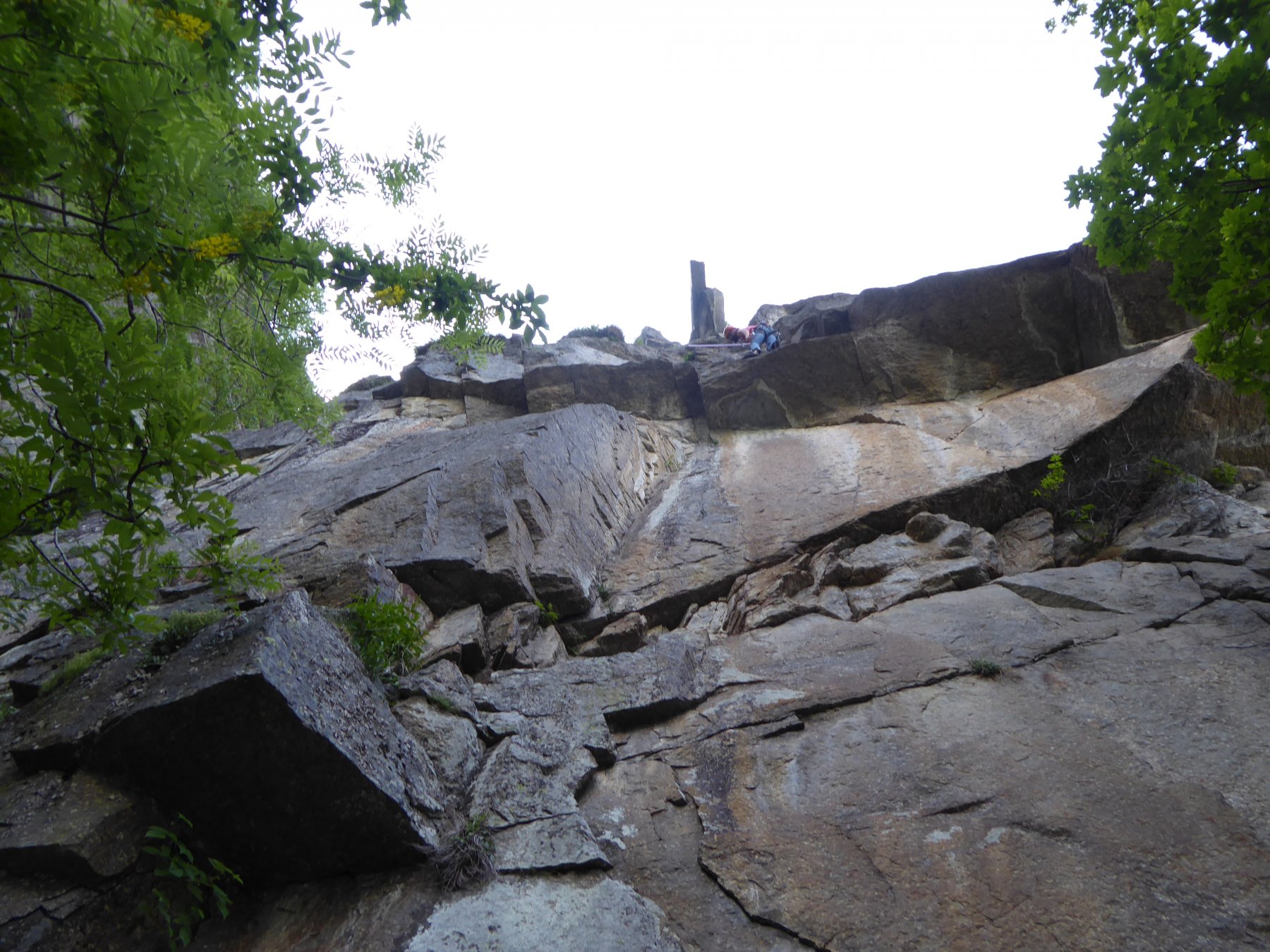 L1: tiro nuovo 2017 – Salire la bella placca fino alla cengia sotto una prua delimitata a destra e sinistra da due diedri. 5 fix. Grado 6a. Sosta di calata con 2 fix e maillon.