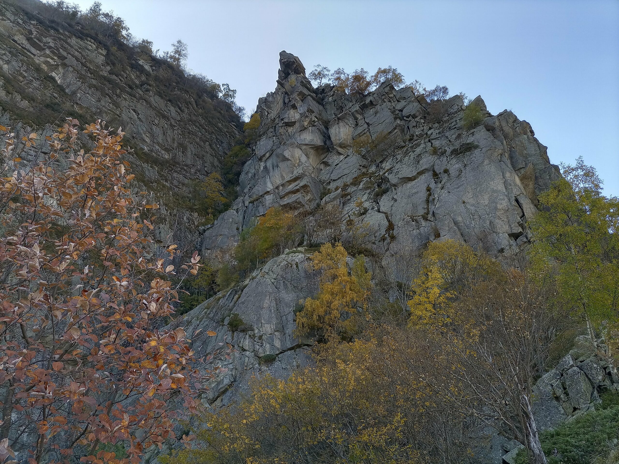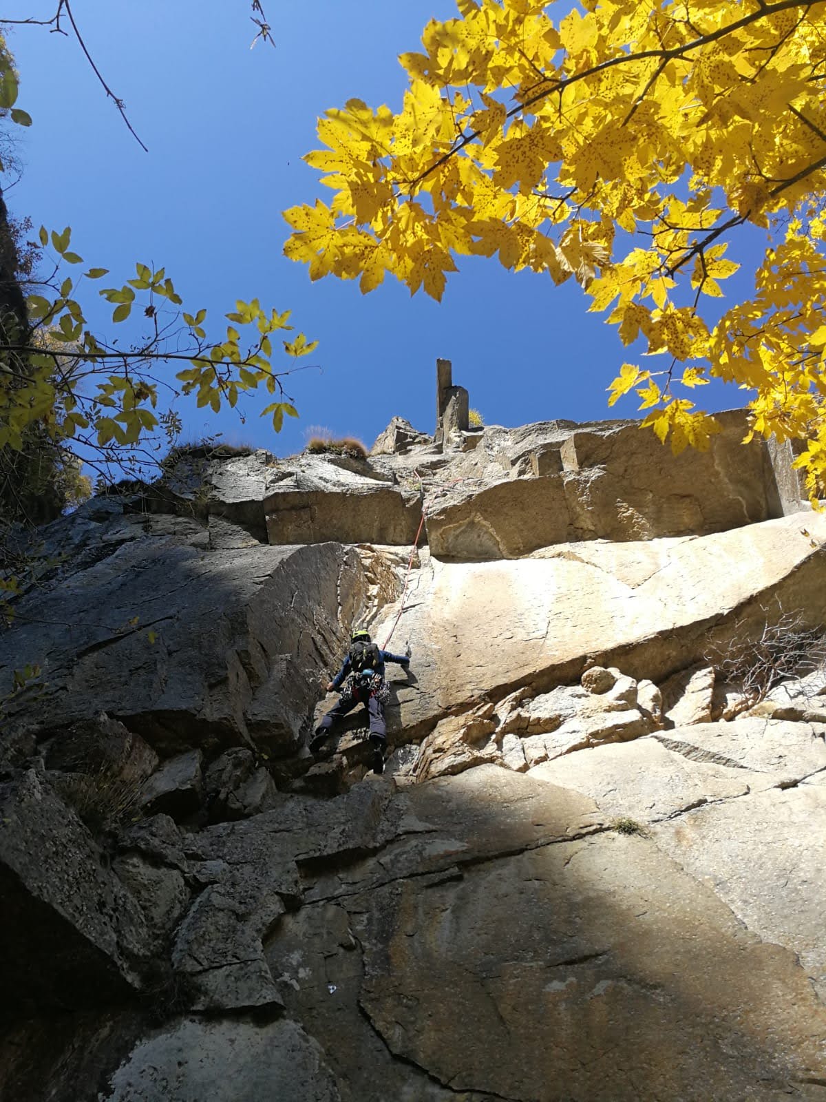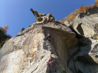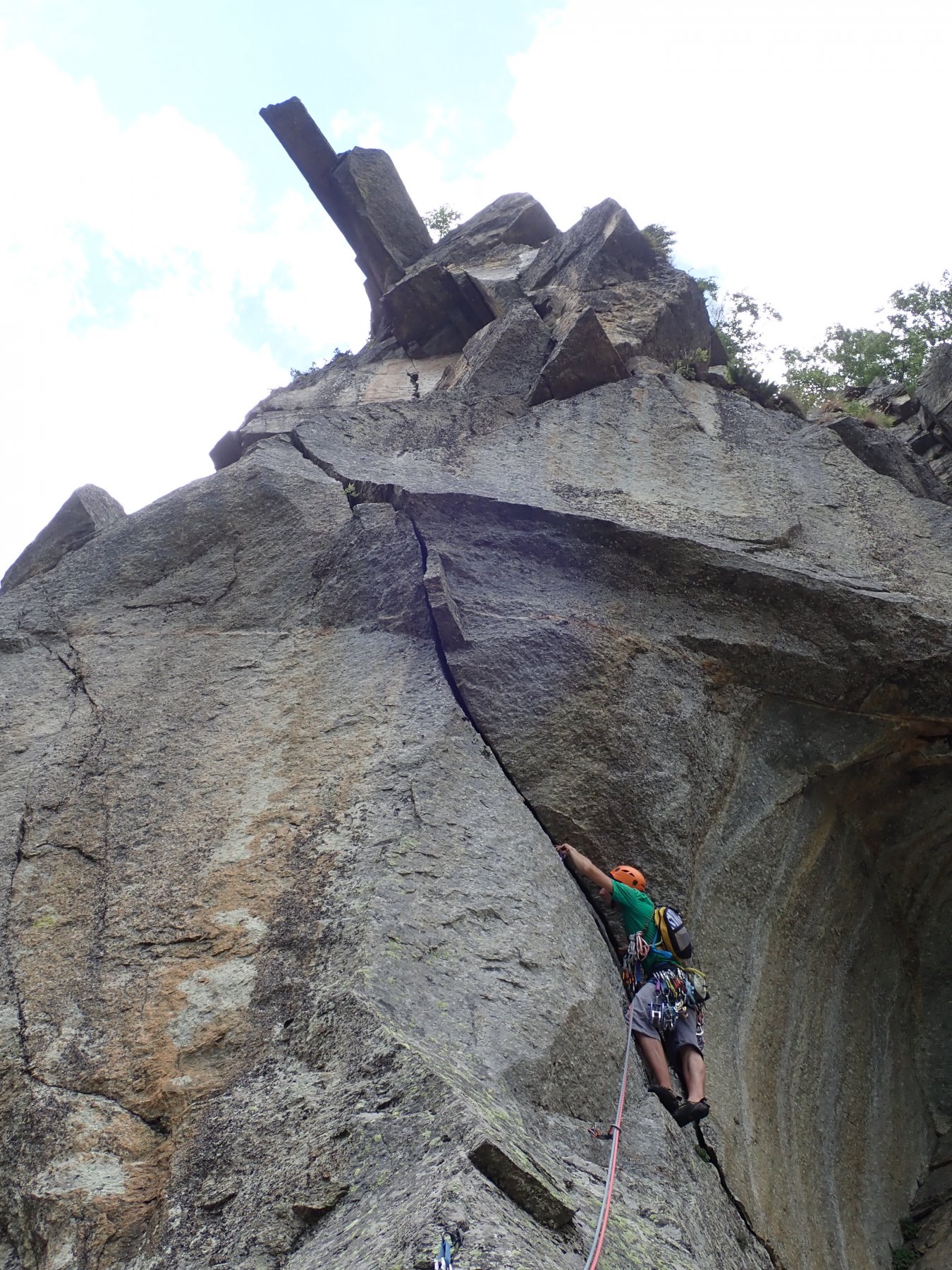 Una guglia molto evidente posta in un angolo di Sea dal microclima particolare che la rende percorribile anche nei mesi autunnali. Nei mesi più caldi porre attenzione alle vipere nel percorso di avvicinamento, anche se noi non ne abbiamo viste. Tutti i tiri sono molto belli e gli incastri non potranno che soddisfare appieno gli amanti del genere, in particolare la bellissima fessura del secondo salto, una delle più belle fessure di Sea!. Scorci inusuali con vista panoramica sul paese di Forno, anche l’uscita in vetta è molto suggestiva e vale la pena arrivare lassù. I nuovi tiri della riattrezzatura hanno conferito continuità alla via eliminando i tratti più erbosi e discontinui dell’originale. Il terzo tiro risulta più difficile della media del resto della via ma è molto estetico e ben chiodato. L’uscita dal tetto probabilmente è fattibile in libera.