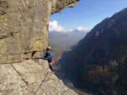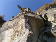 L4: superare la bellissima fessura strapiombante a semicerchio. Grado 6b. Portare un n°5 BD. Sosta di calata con 2 fix e maillon.