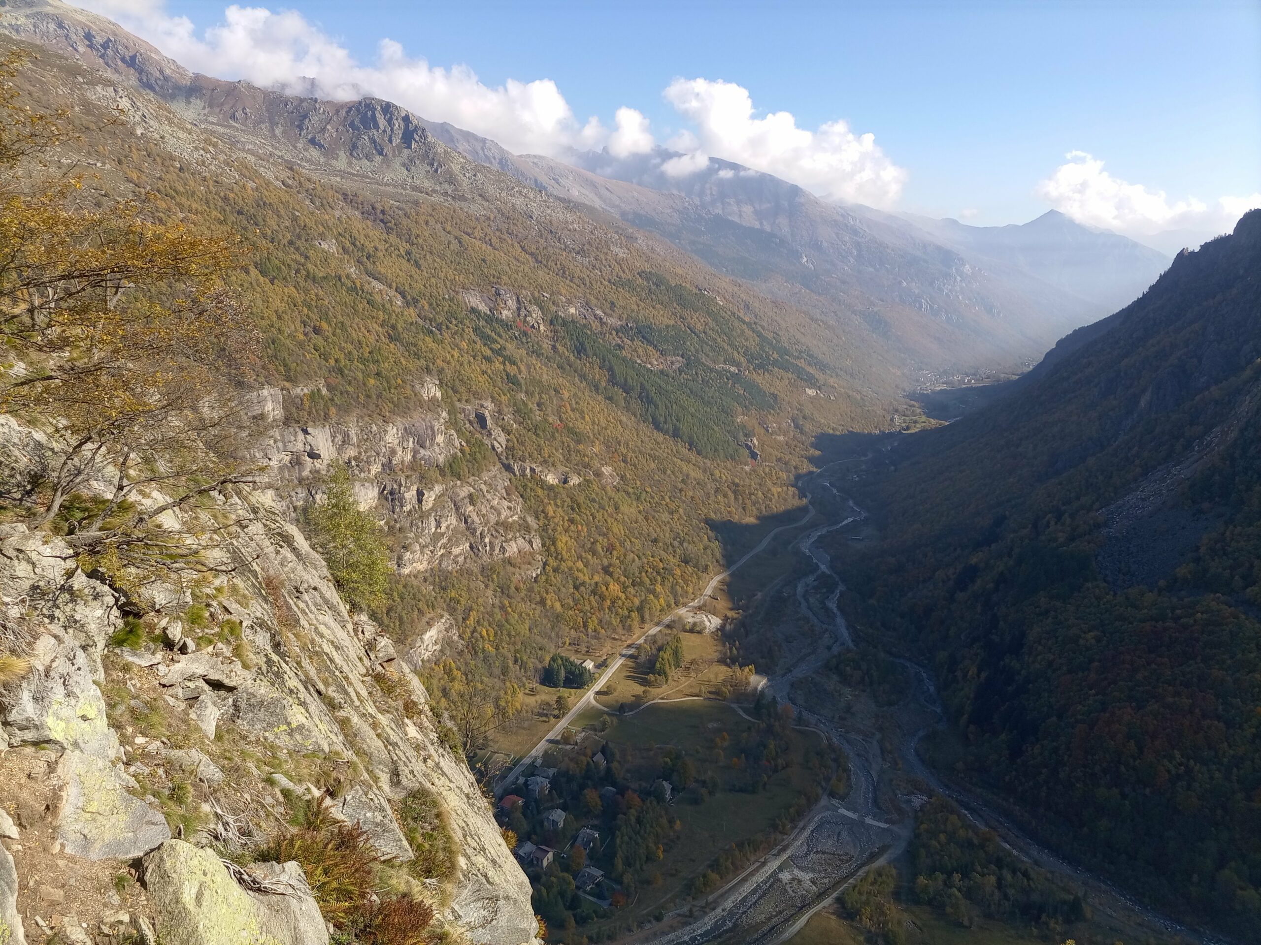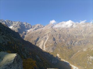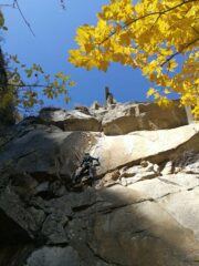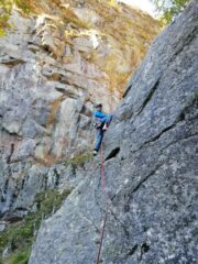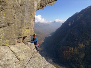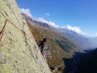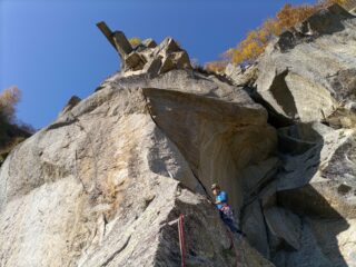 La luce della Stele, in questa stagione, contrasta con il buio del versante opposto. 3,5 ore di sole, per godersi il tepore autunnale. Il sole a fine ottobre arriva verso le 10.15 (con l’ora solare arriverà 1 ora prima, ma durerà sempre meno, però sufficiente per la scalata). Abbiamo rivisto un pò i gradi, finalmente si scala scarichi! 6a/6b/6c+ e 2 spit di AO/6b/6a/6a. Friend 5 non necessario. Basta una serie raddoppiando l’1 ed eventualmente il 3. Portare anche un 4.