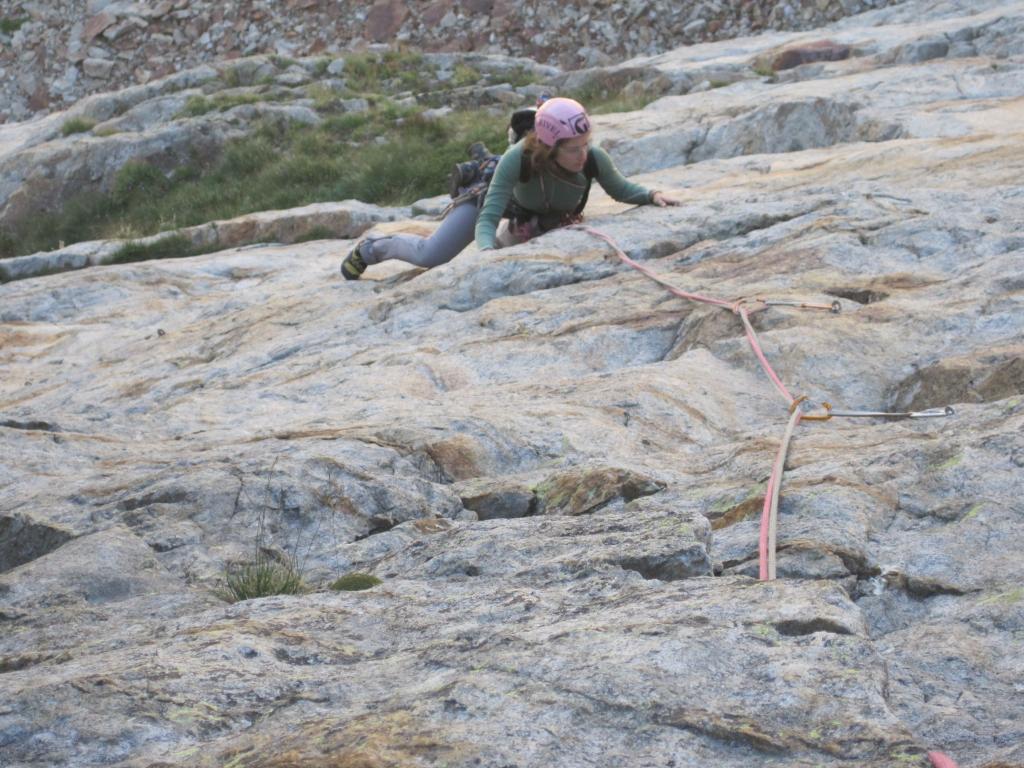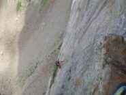 L2) Salire decisamente a sinistra fino a portarsi su una placca sotto un piccolo strapiombo, dove si sosta. (4a, 1 spit, 15m)