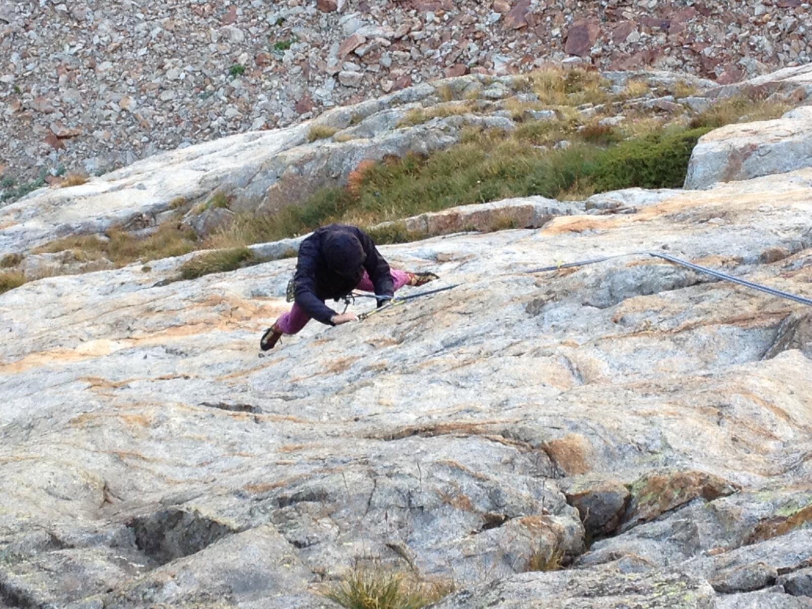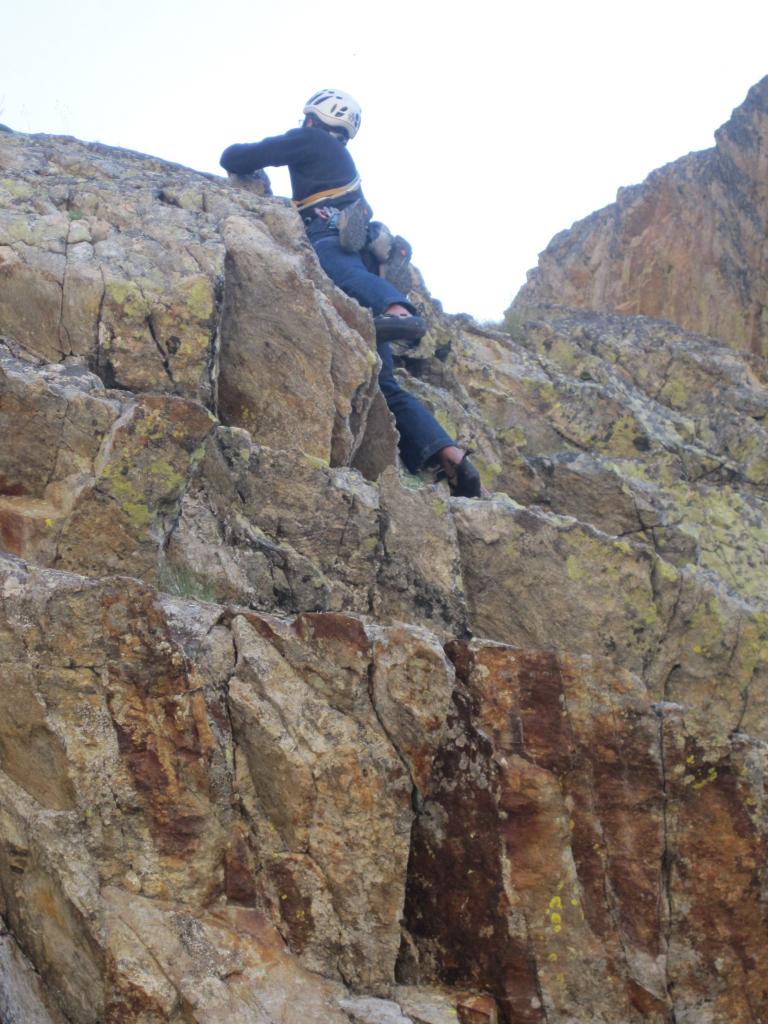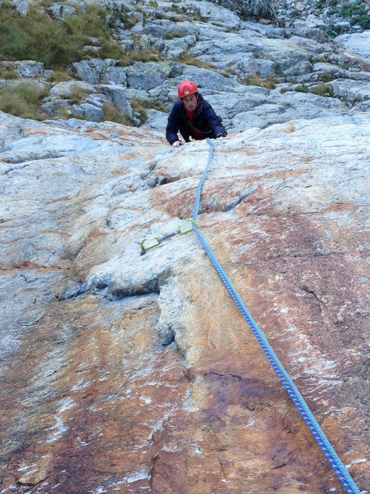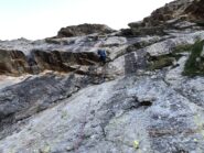 Per raggiungere la cengia mediana, occorre proseguire per facili roccette, senza percorso obbligato. (2-3, 50m)