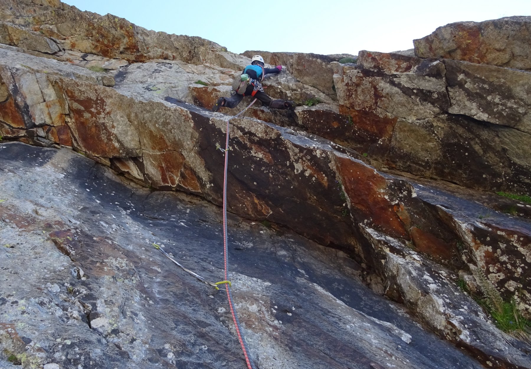 L8) Continuare pressoché dritti per un lungo tiro su roccia articolata (5c, 3 spit, 50m)