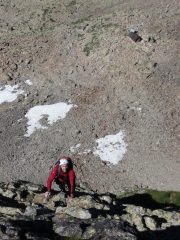 Qua le cose cambiano. ci sono solo qualche chiodo e l’esposizione è notevole. Scesi in doppia sulle soste della Campia.Facendo la cresta NO abbiamo purtroppo evitato sempre il sole e patito abbastanza freddo….