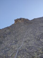 Bellissima via di arrampicata, chiodatura perfetta non richiede assolutamente l’integrazione. Si attacca nel punto più basso della parete dove inizia proprio il pilastro centrale (c’è una targhetta con il nome della via). Non abbiamo unito nessun tiro e ce la siamo goduta tutta. Purtroppo essendo in una cordata da 3 per la prima volta abbiamo dilungato un po’ i tempi e siamo arrivati sulla cengia dopo 3.30 h (iniziato la via per le 08.15, con il senno di poi potevamo attaccarla prima date le temperature estive).