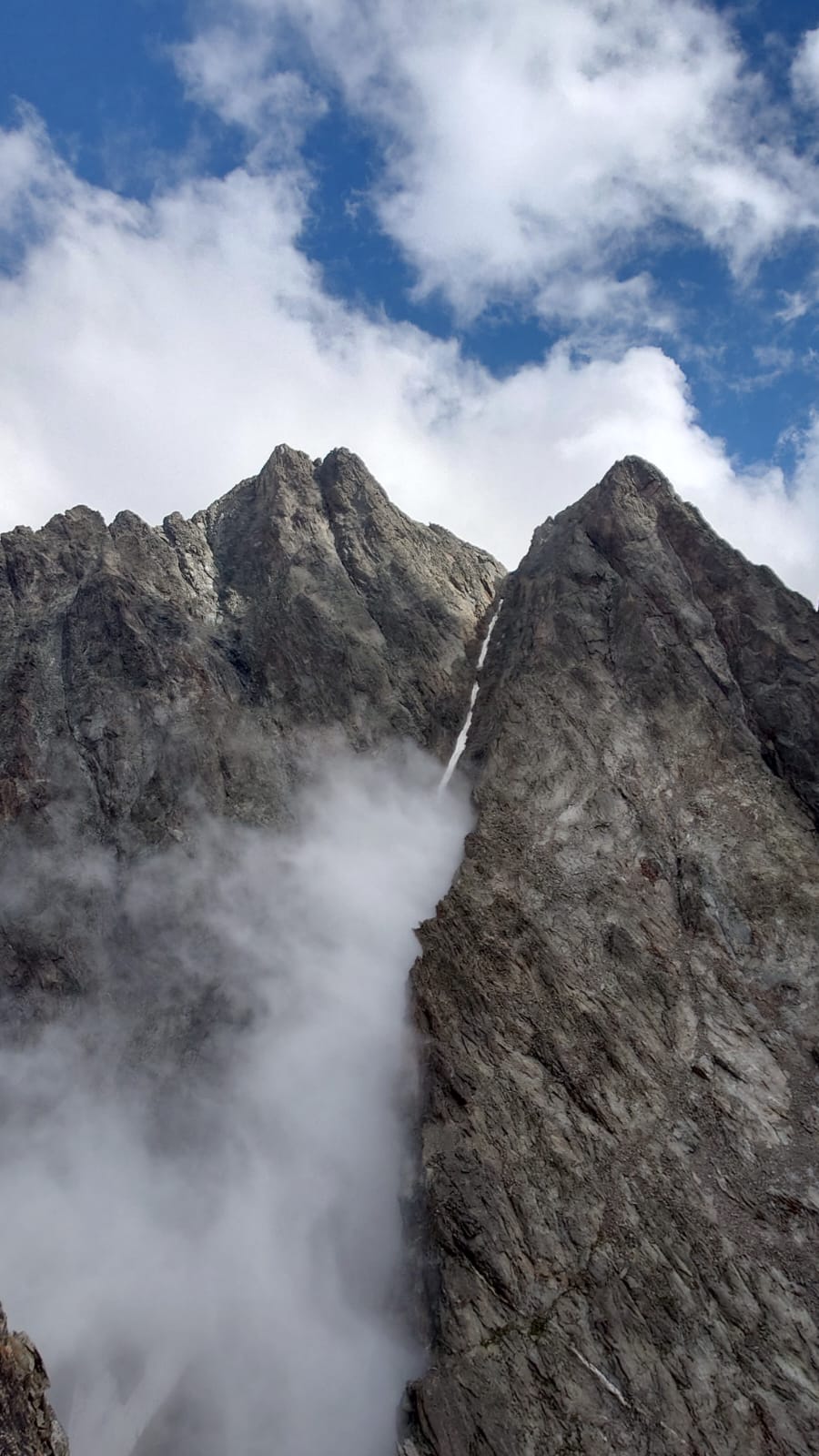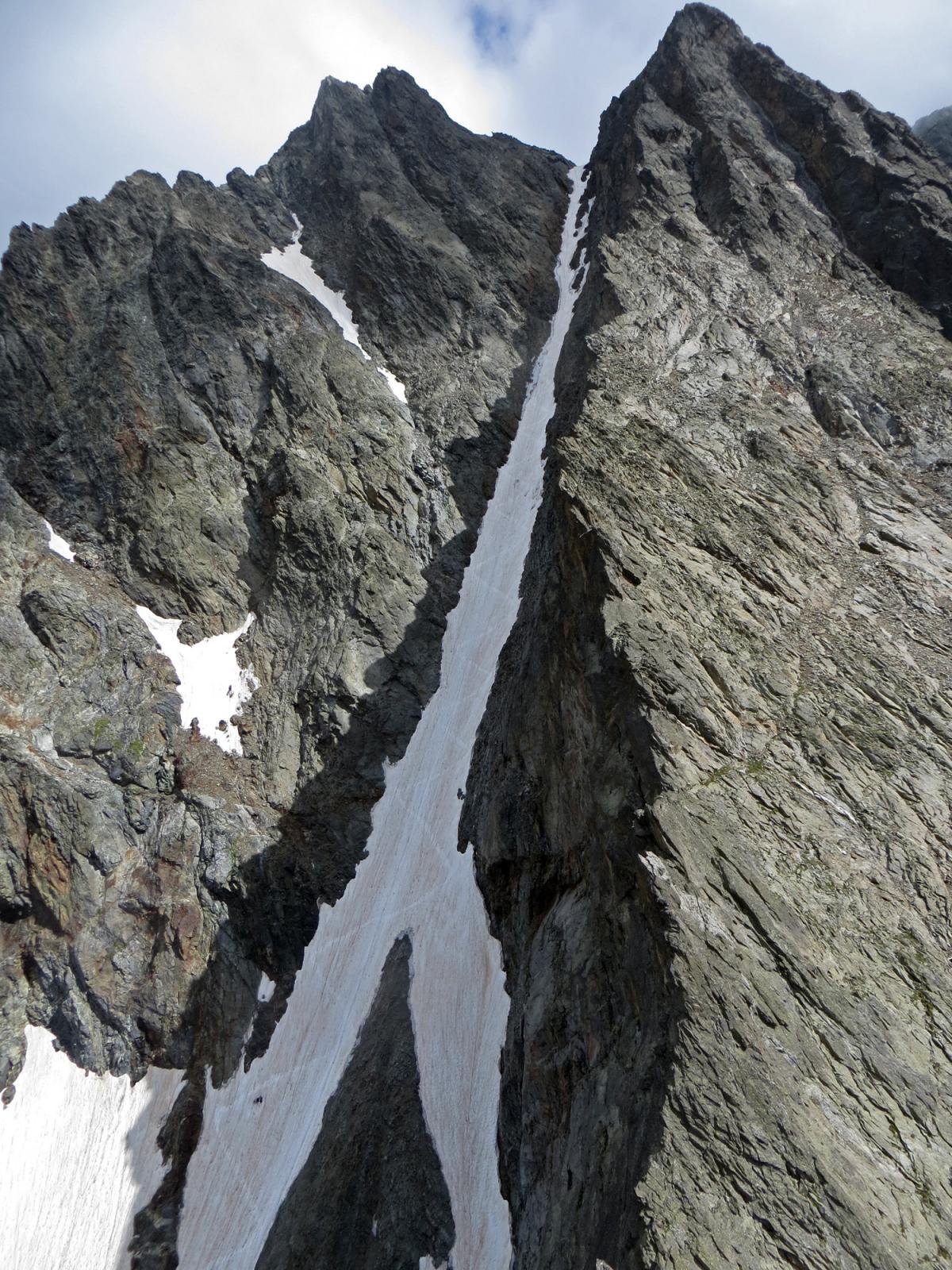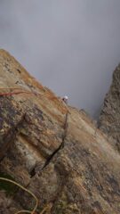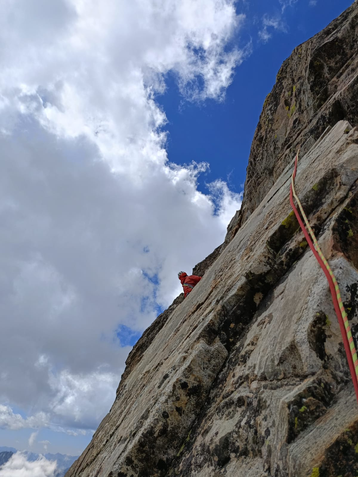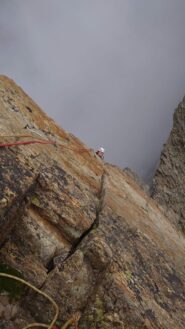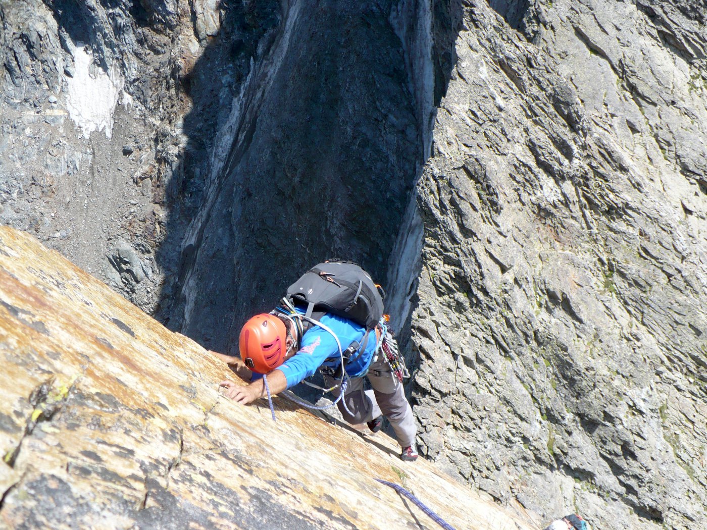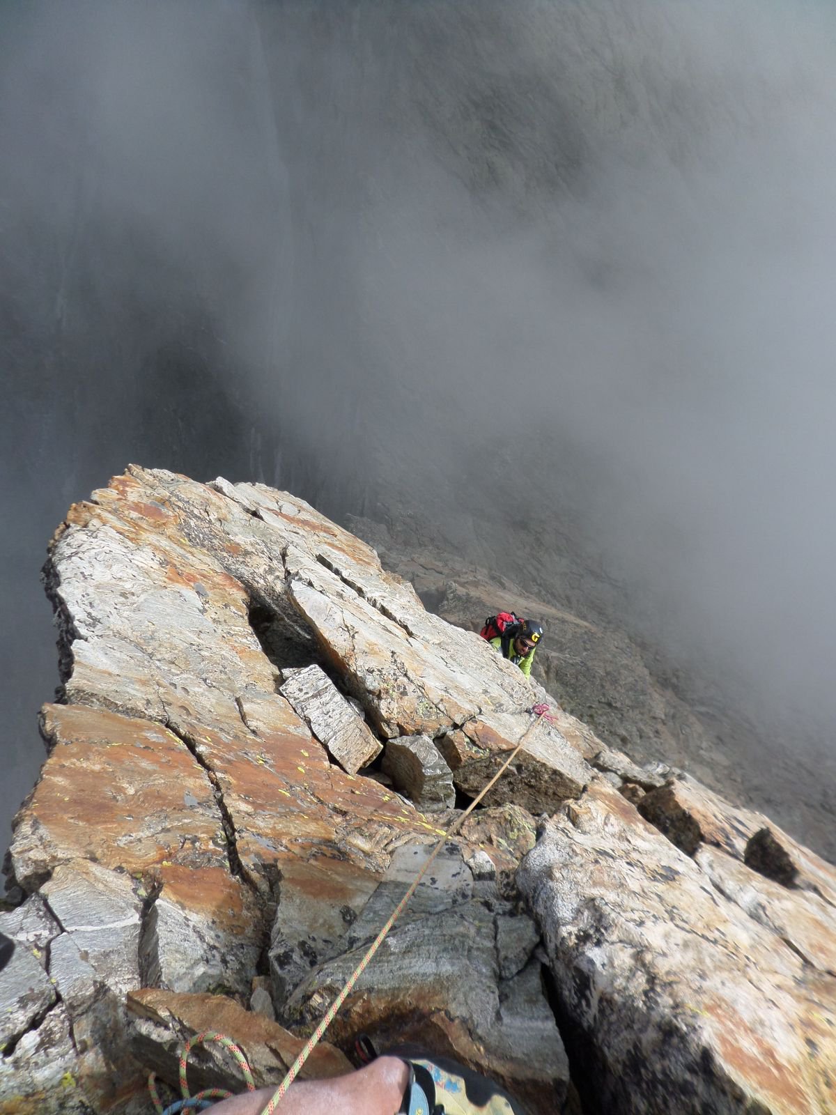 5. Tiro chiave. A dx verso il filo dello spigolo, buon chiodo (bella vista sulla nord e sul Lourusa, impressionante), traversare a sx verso sistema di lame e fessure per raggiungere lo strapiombo, fessura V+/A0 chiodi, continuare per fessura (friend incastrato) fino a un comodo punto di sosta (2 spit da collegare, aereo). (30m)