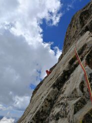 6. Attraversare orizzontalmente a sn. per 10 m (III, 2 chiodi vicini), per aggirare i muretti poco chiodabil sovrastanti, (chiodi), risalire i risalti III, IV.(40 m).