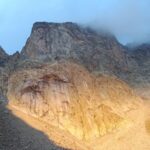 7° Tiro: Supera il grande e caratteristico muro rosso, solcato all’inizio da una fessurina. Sosta scomoda sopra un tettuccio, che si passa a sinistra.