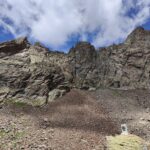 Nel punto più alto del canalone di neve o detriti. Il primo tiro evita il canale passando sulla placca verdastra a sinistra; il secondo sale nel canale (facile) fino all’inizio vero e proprio della via.