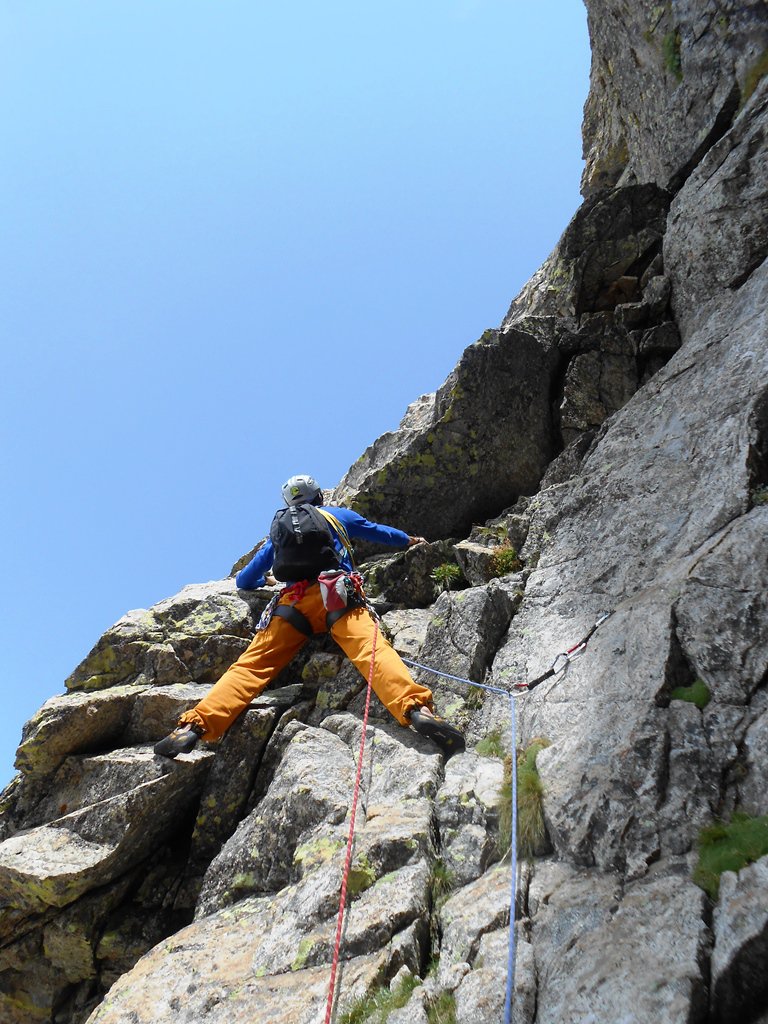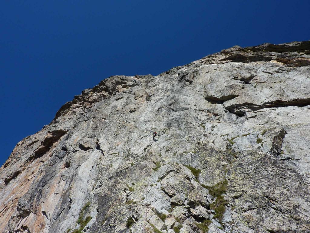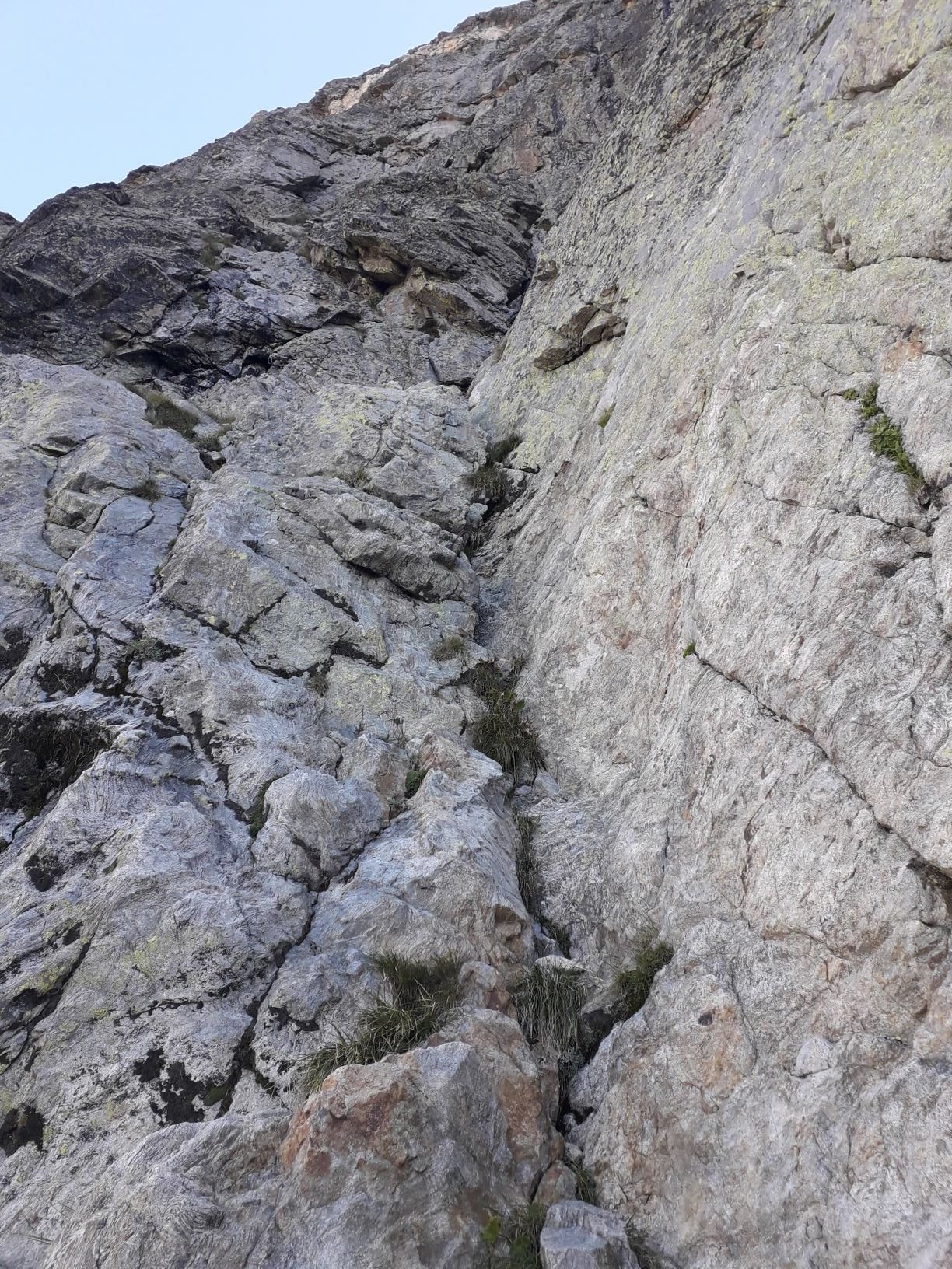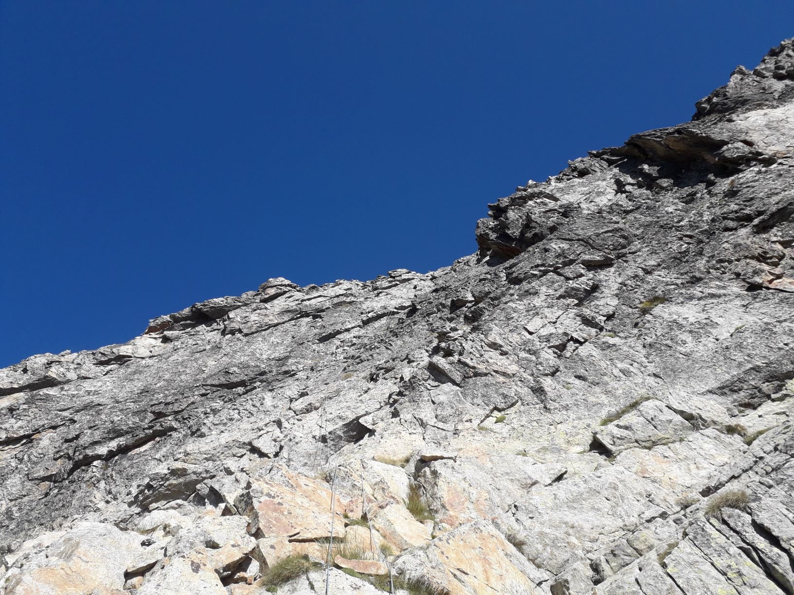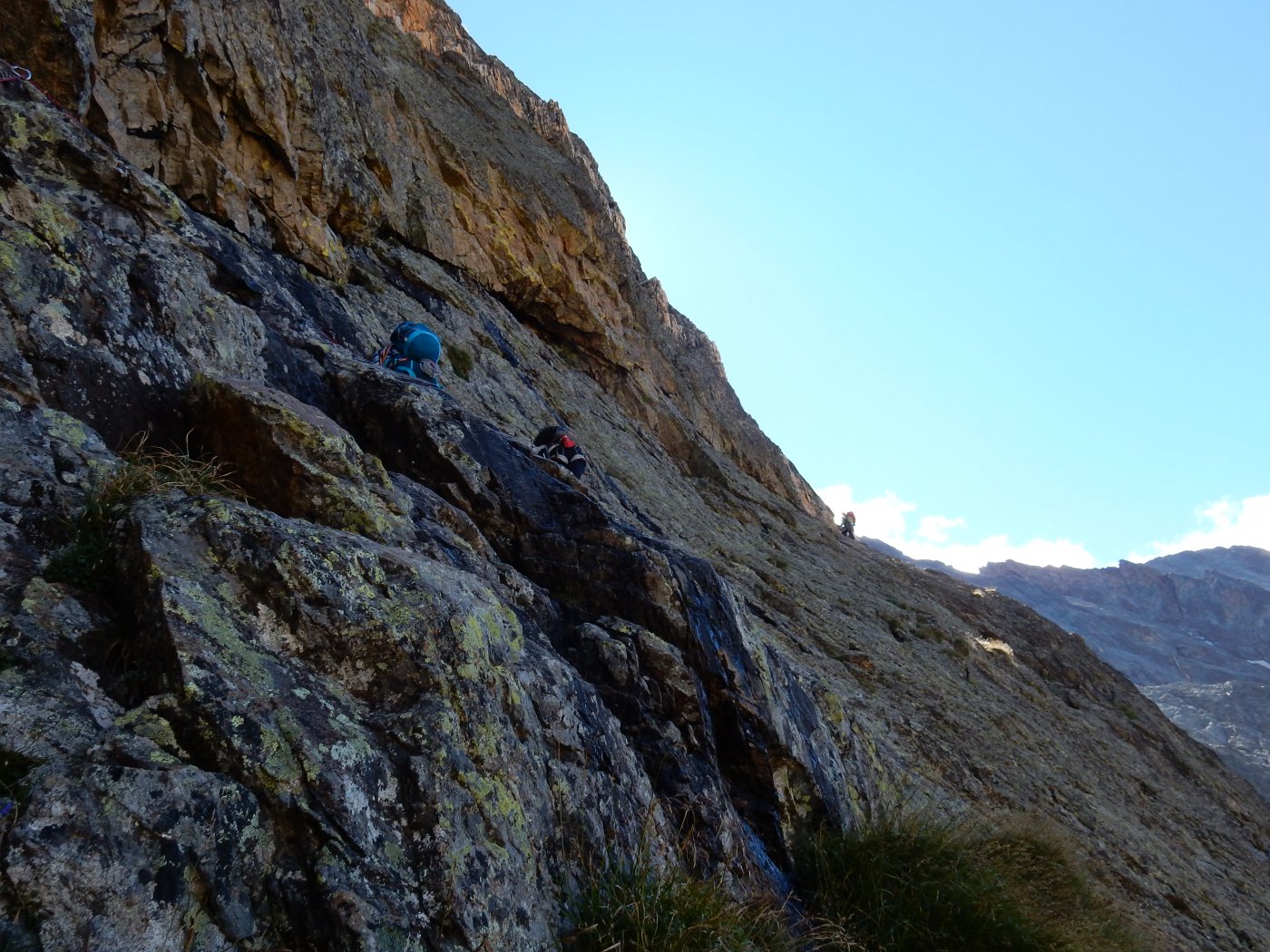 - L6) Salire la parete di rocce biancastre immediatamente a sinistra (il famigerato “mauvais pas”, 22 metri, IV+, ben protetto a fix e chiodi)