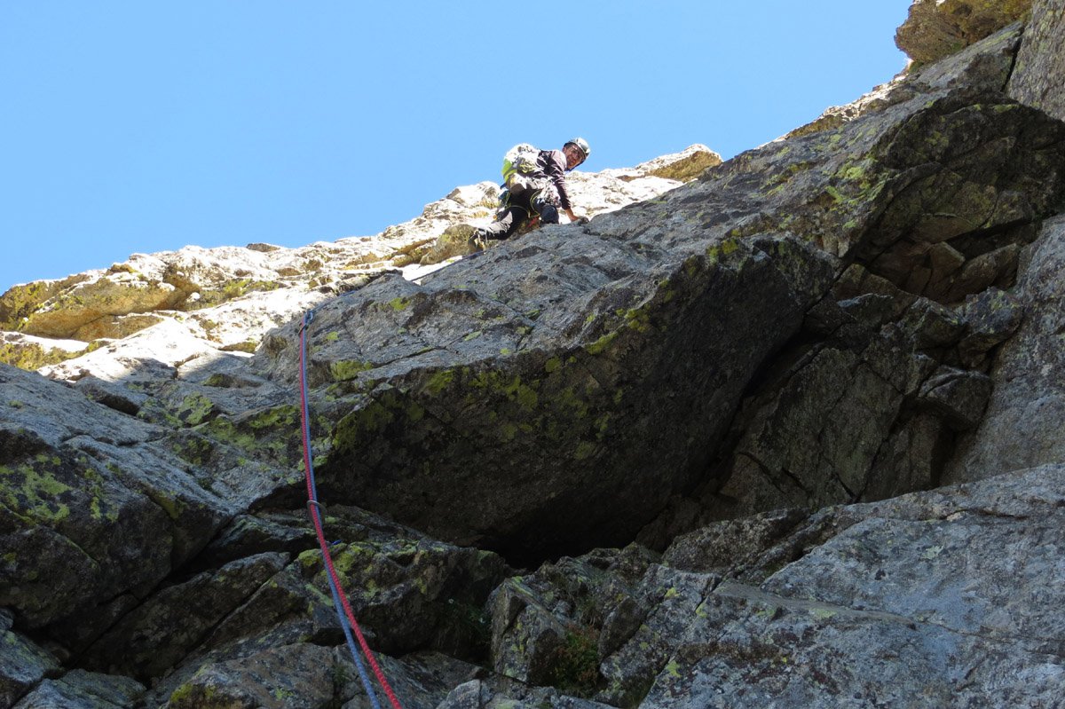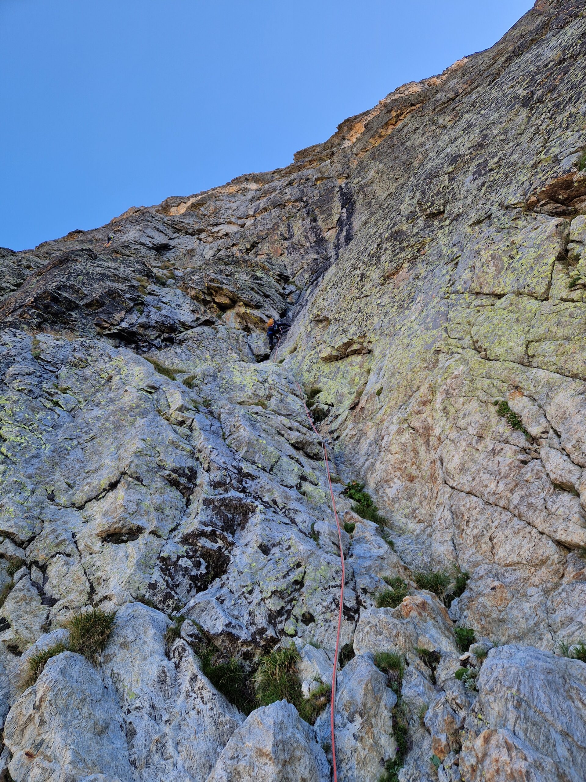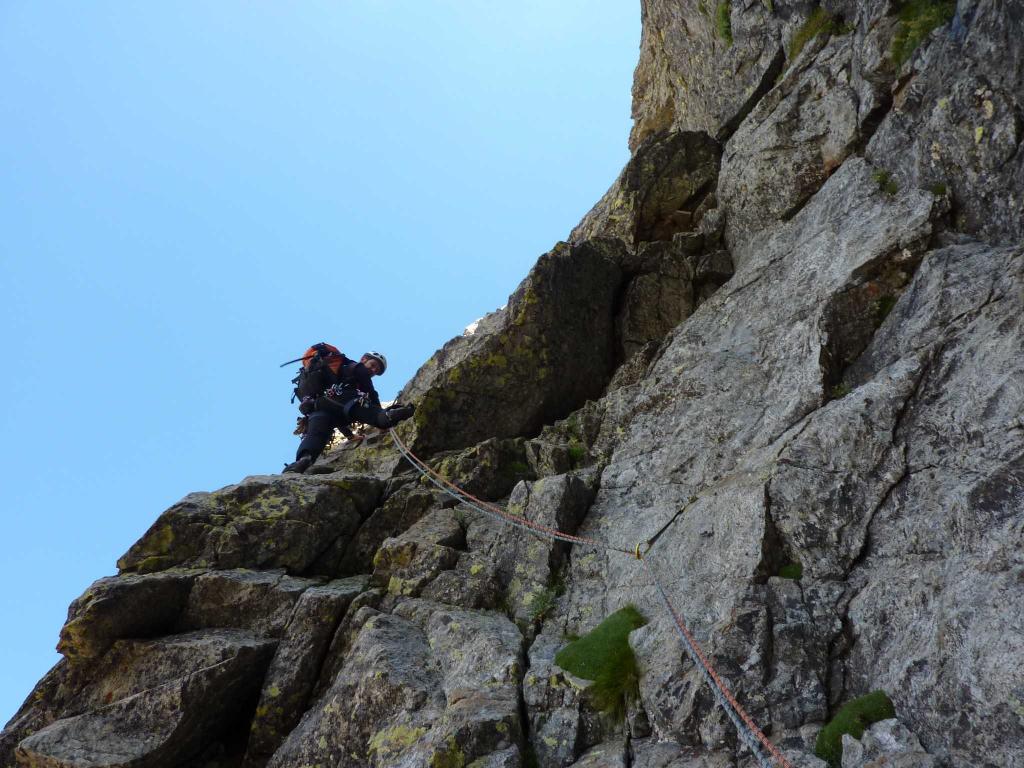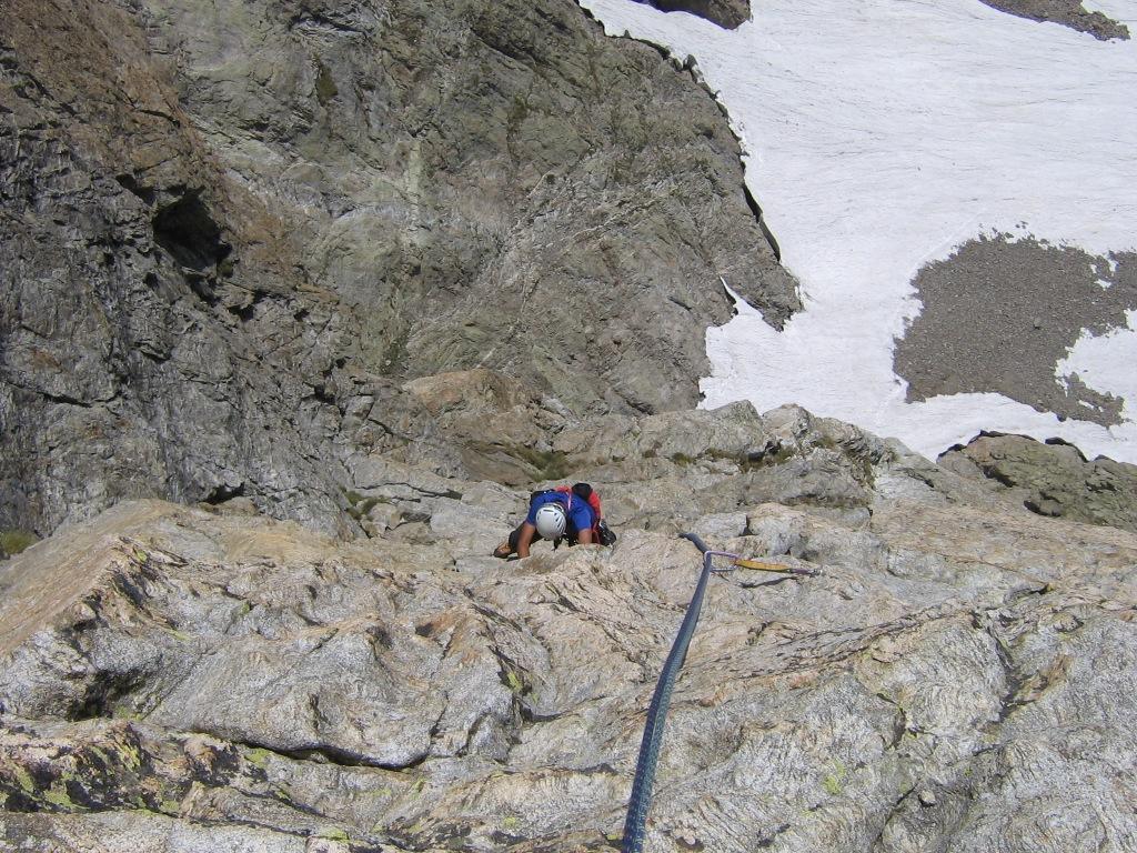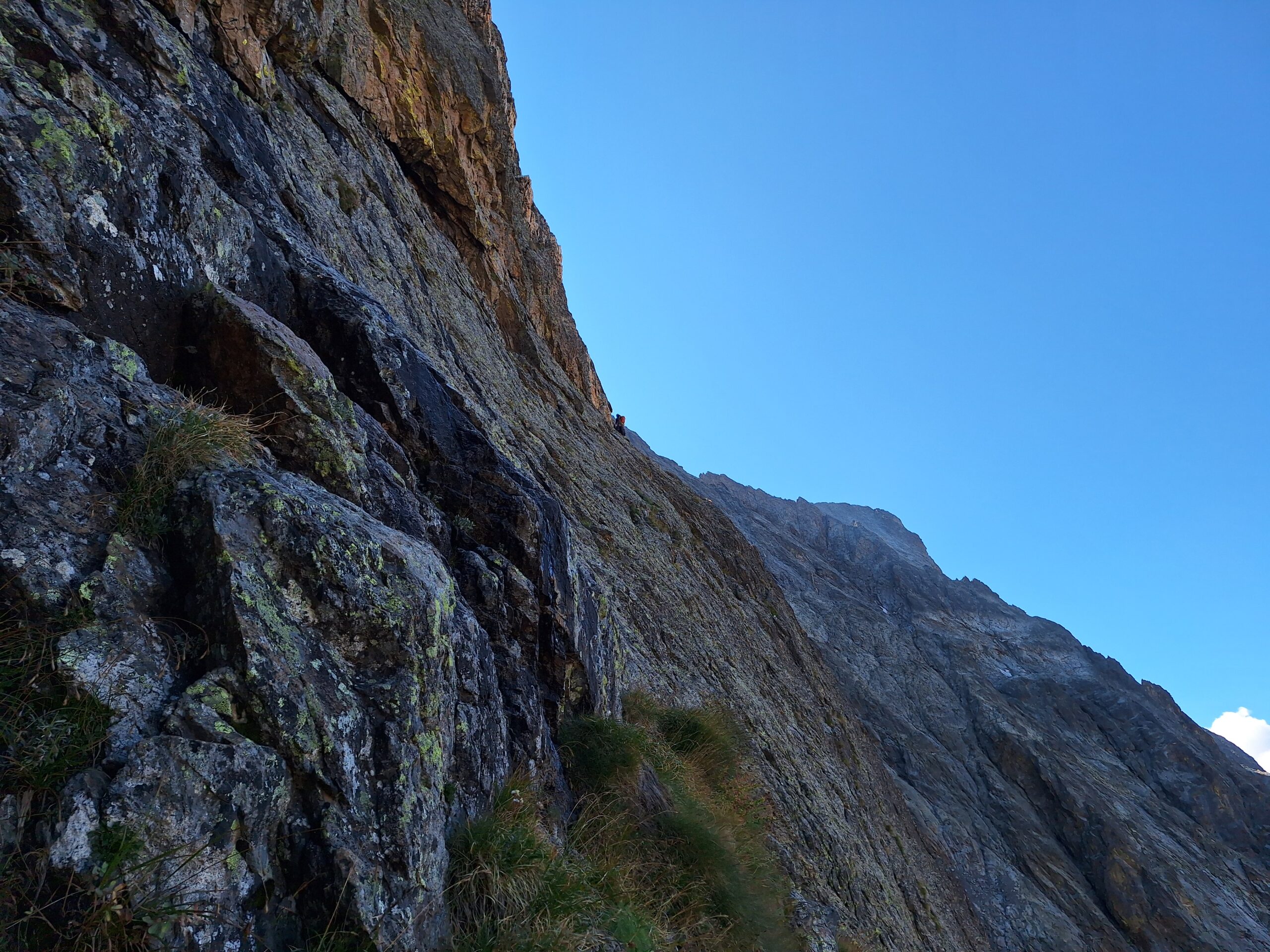 - L6) Salire la parete di rocce biancastre immediatamente a sinistra (il famigerato “mauvais pas”, 22 metri, IV+, ben protetto a fix e chiodi)