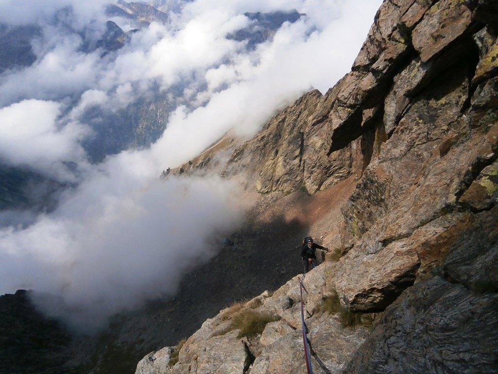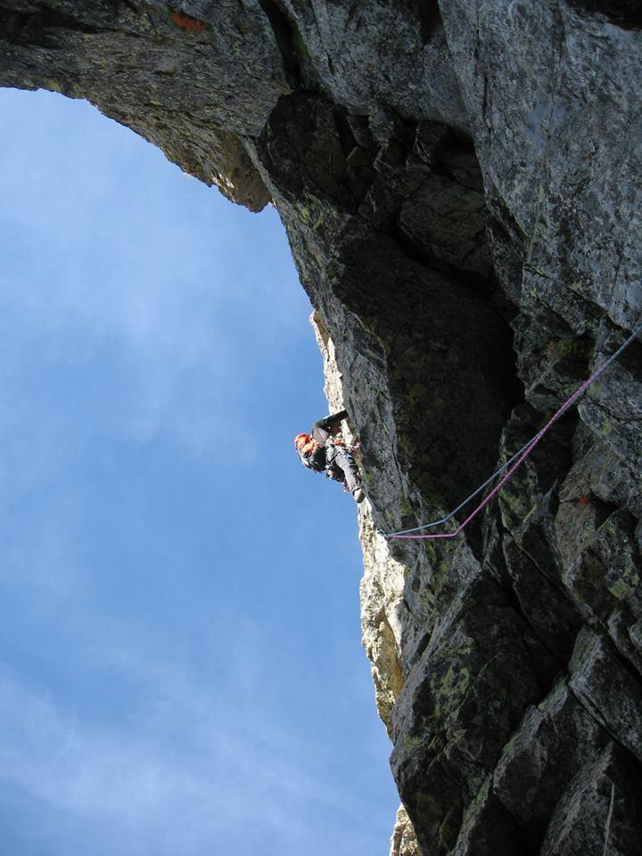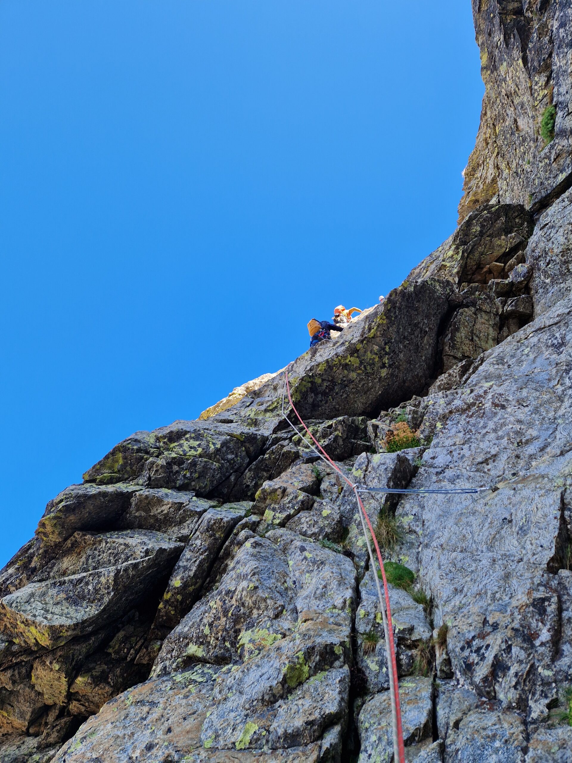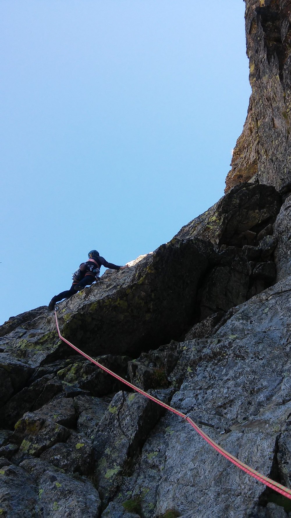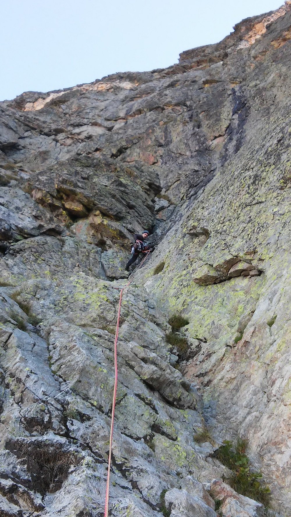 - L6) Salire la parete di rocce biancastre immediatamente a sinistra (il famigerato “mauvais pas”, 22 metri, IV+, ben protetto a fix e chiodi)
