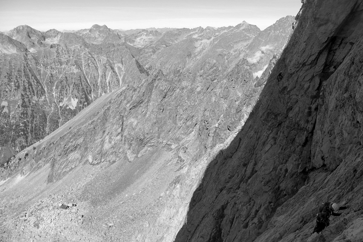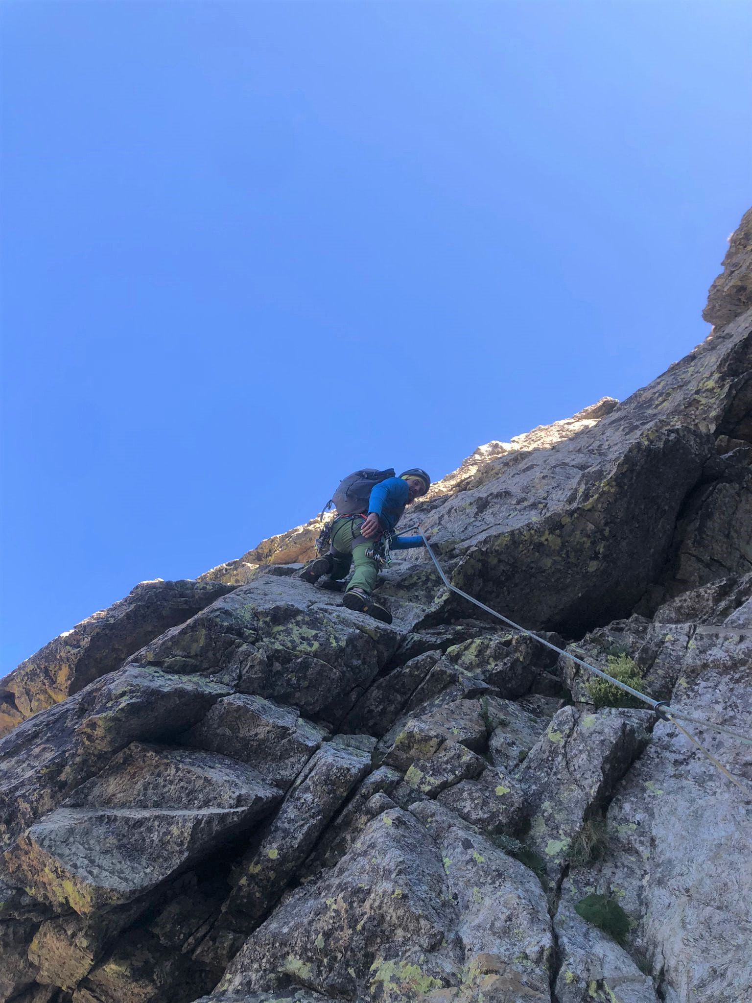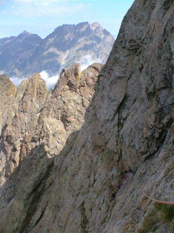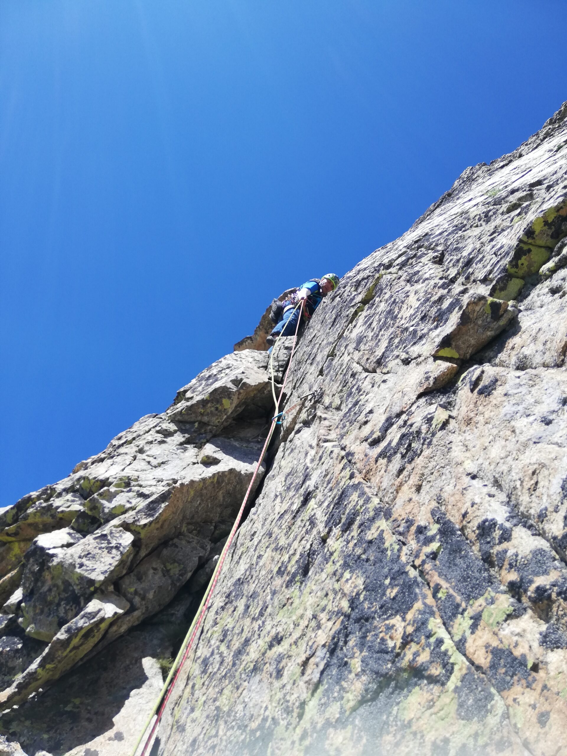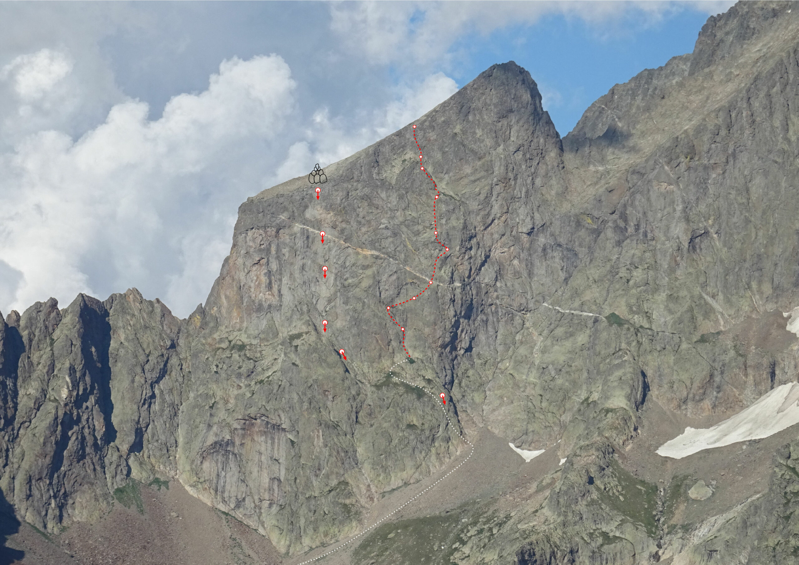 - L6) Salire la parete di rocce biancastre immediatamente a sinistra (il famigerato “mauvais pas”, 22 metri, IV+, ben protetto a fix e chiodi)