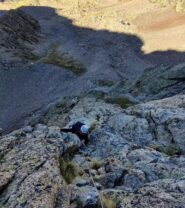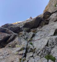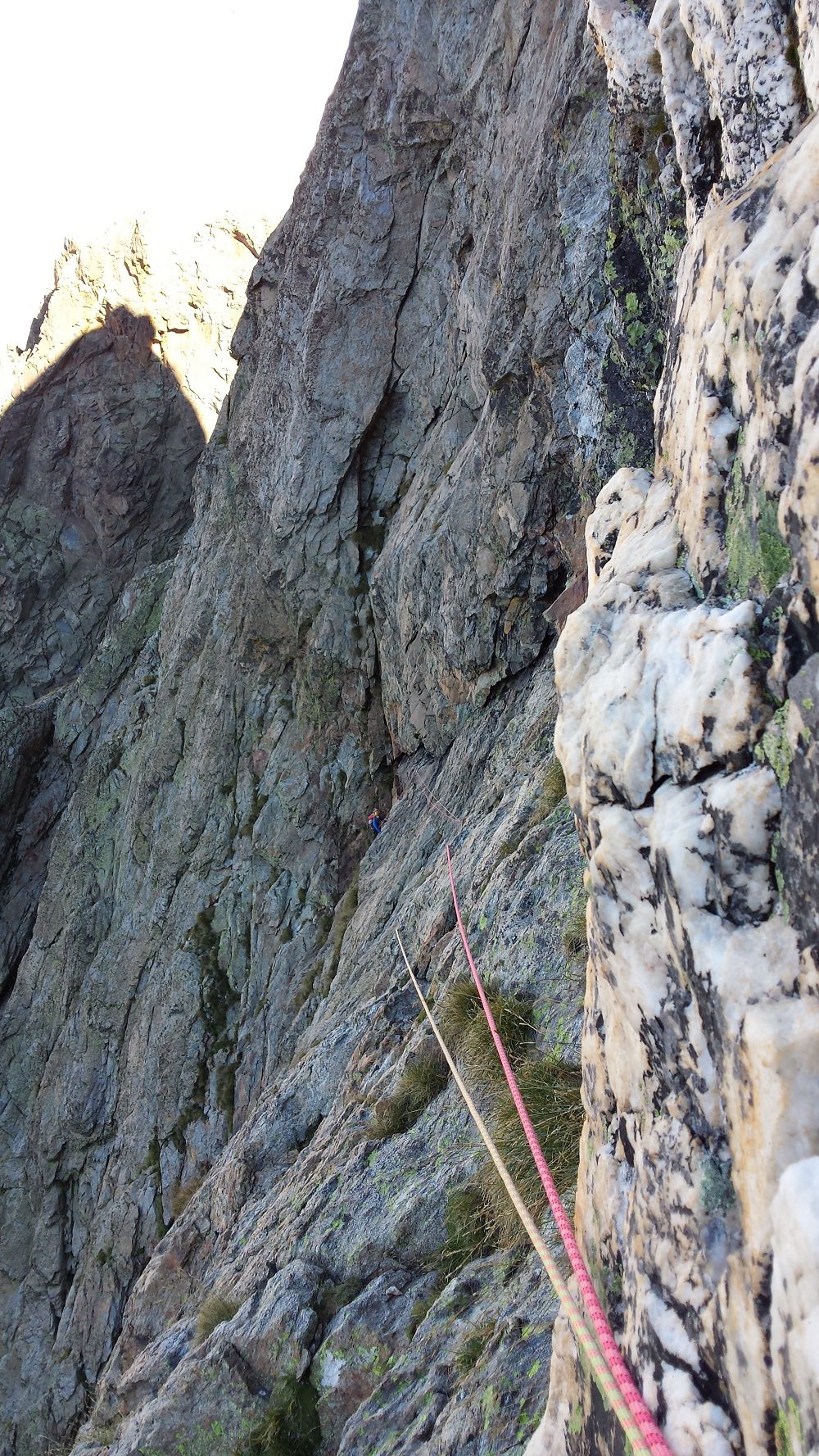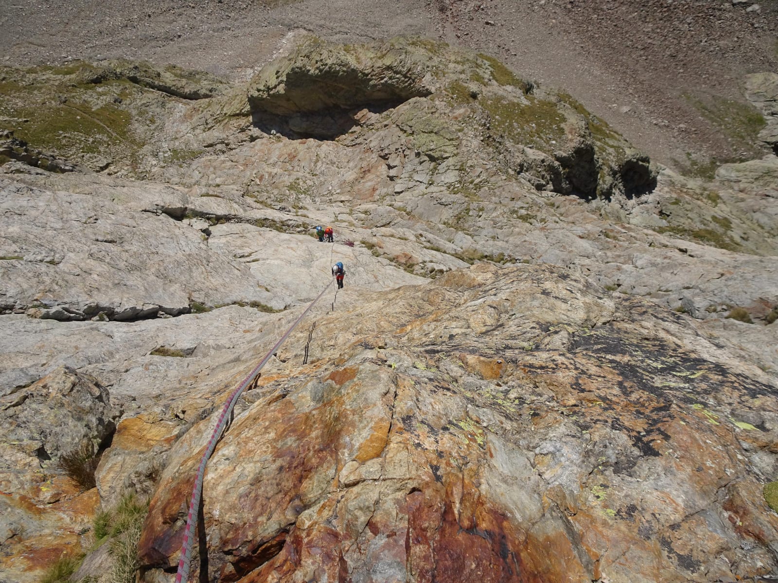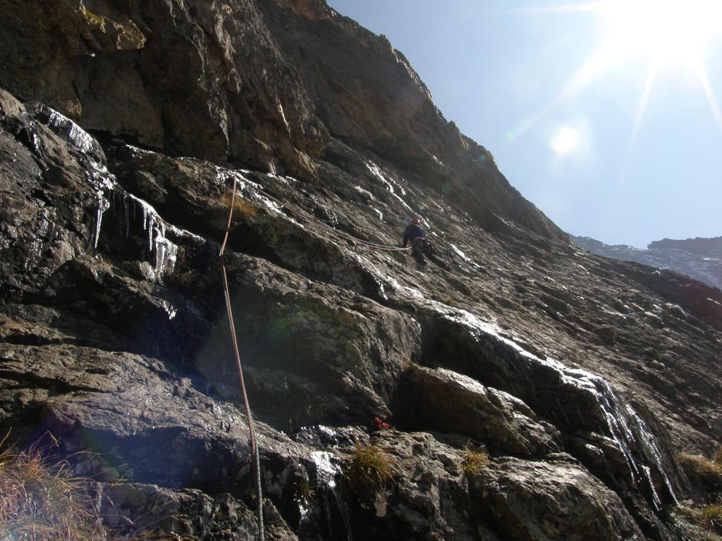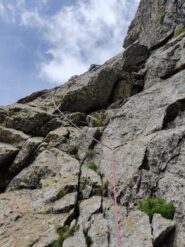 - L2) Proseguire nel canalino-rampa fino alla sosta sotto a strapiombi rossastri (III, 30 m). Tiro unibile con L1 (60m)