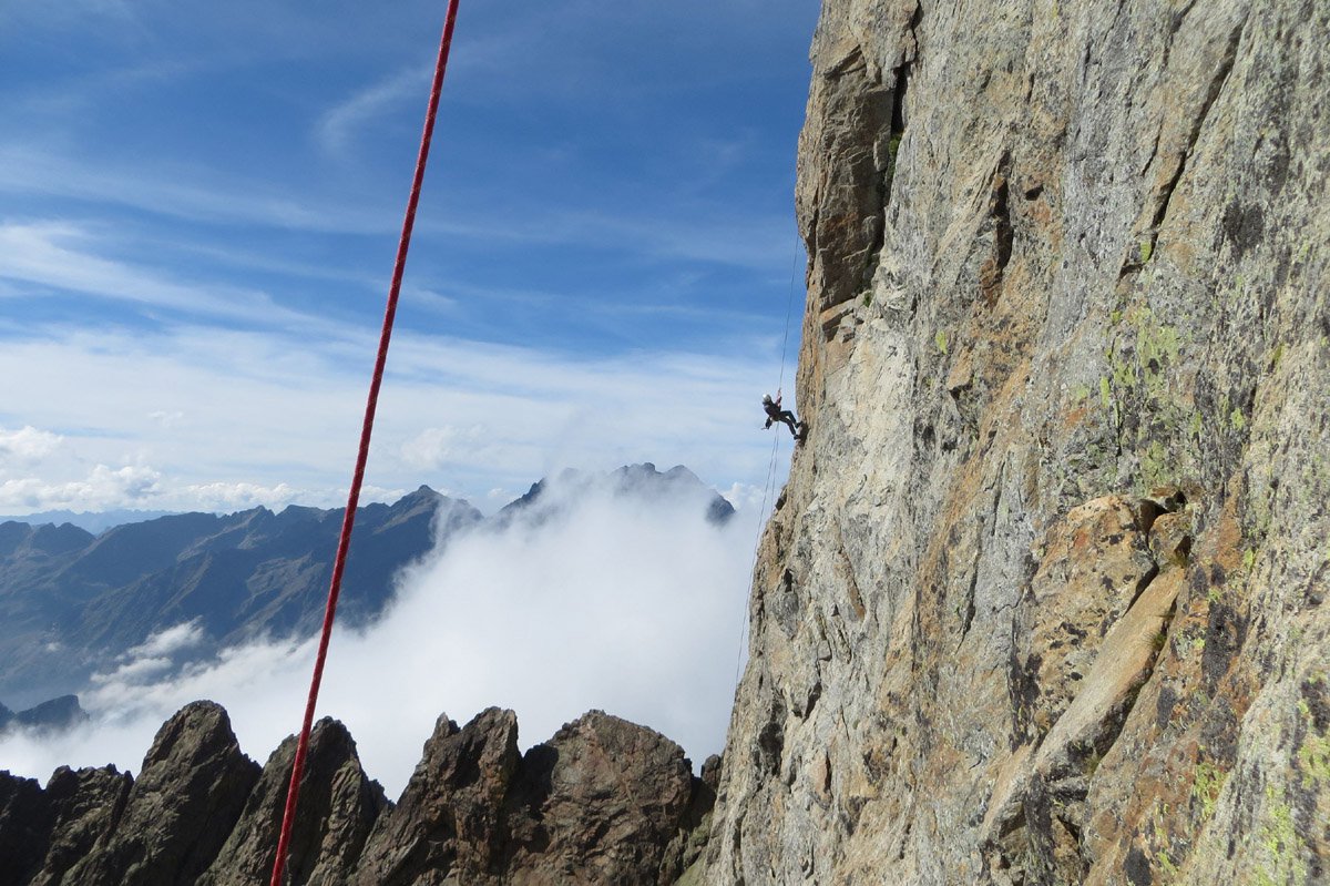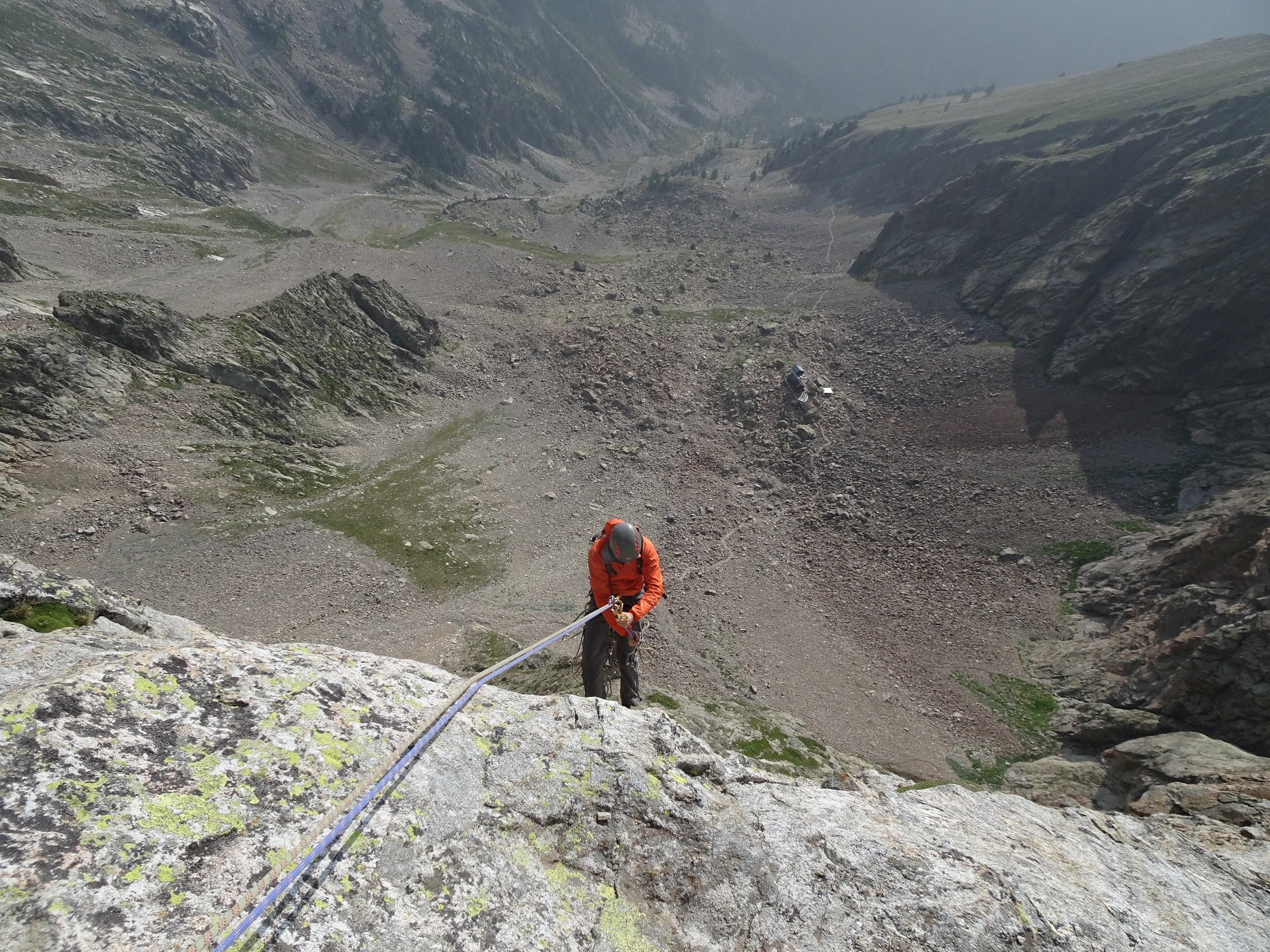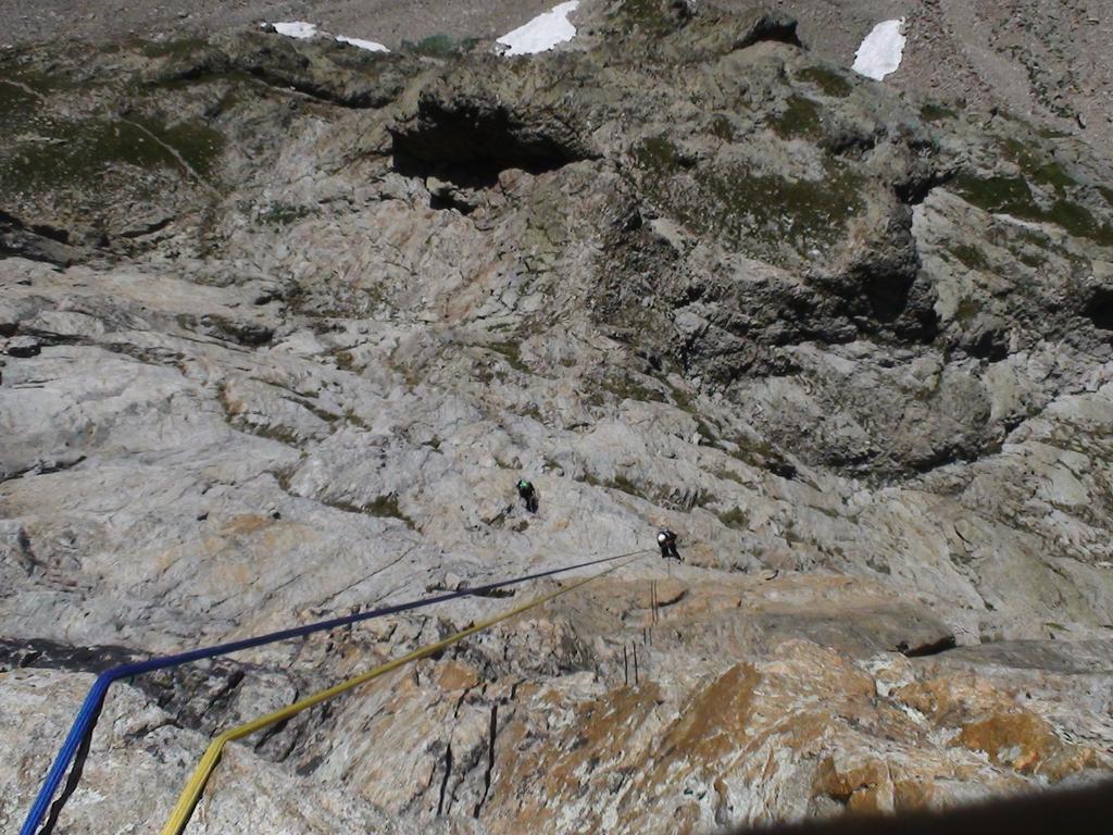 - 1.Doppie della via Campia (3 doppie da 50 metri oppure 6 doppie da 25 metri): scendere verso lo spigolo inferiore; a circa 50 metri dallo spigolo reperire un ometto sotto il quale si trova uno spit con cordone.