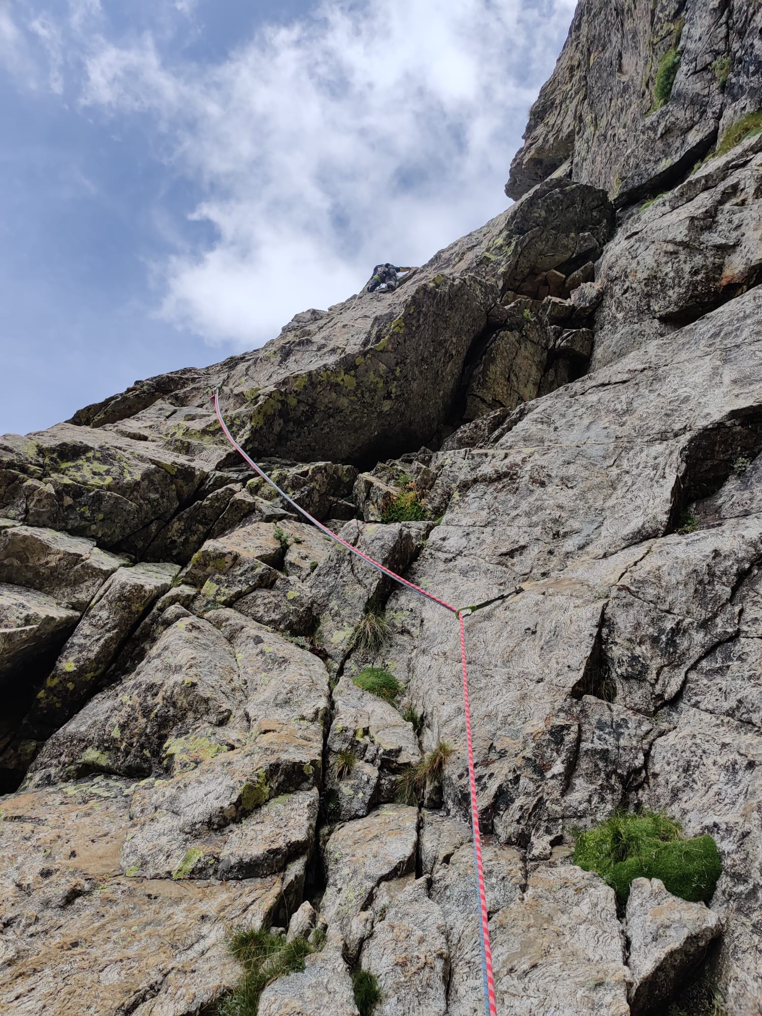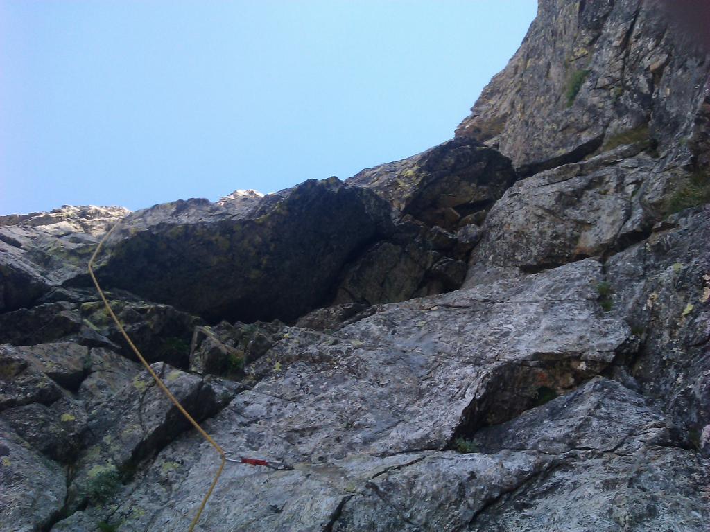 - L1) Salire il diedro-canale (III) fino a una strozzatura, superare la fessura verticale di sinistra (IV+) e continuare nel diedro-camino (30 m)