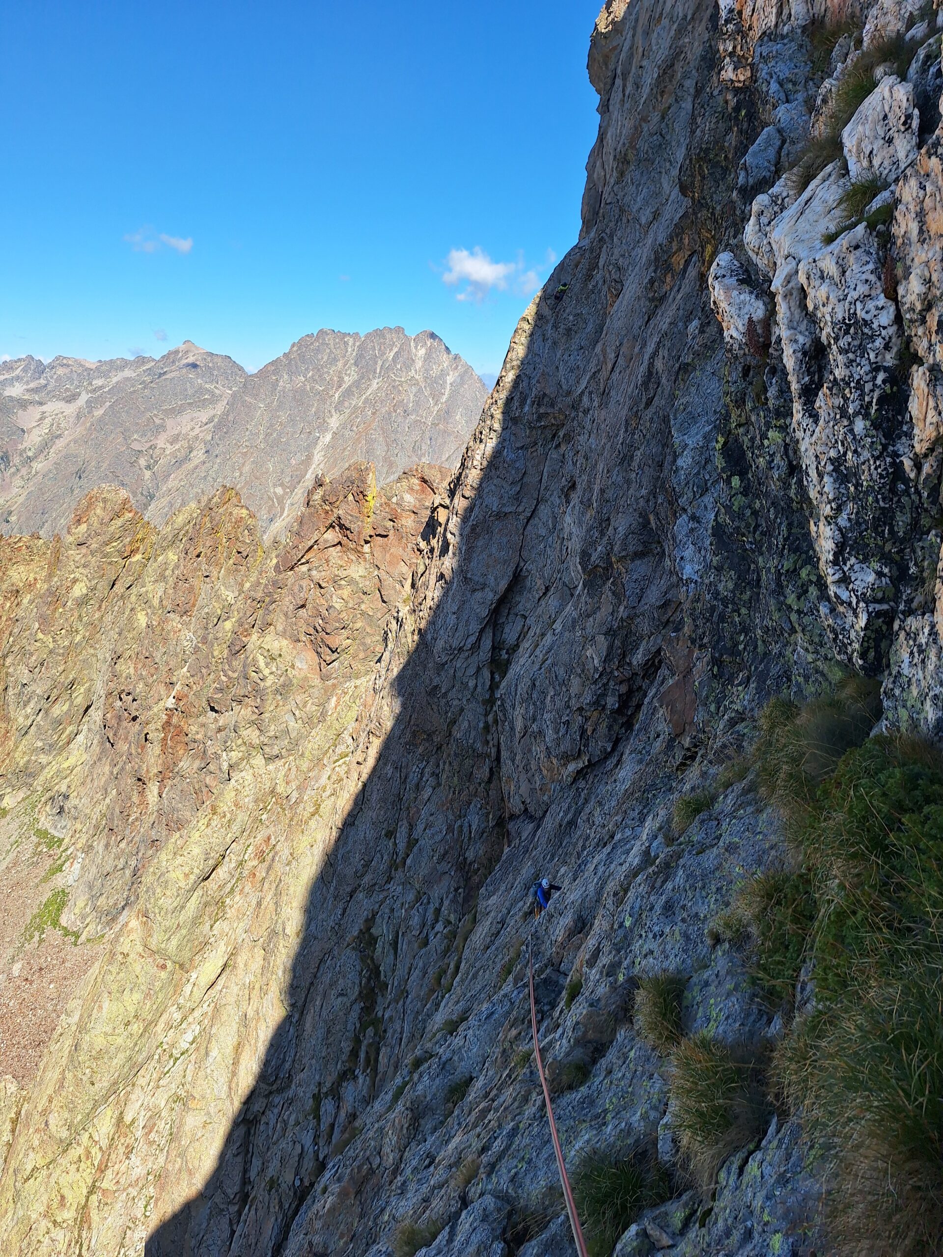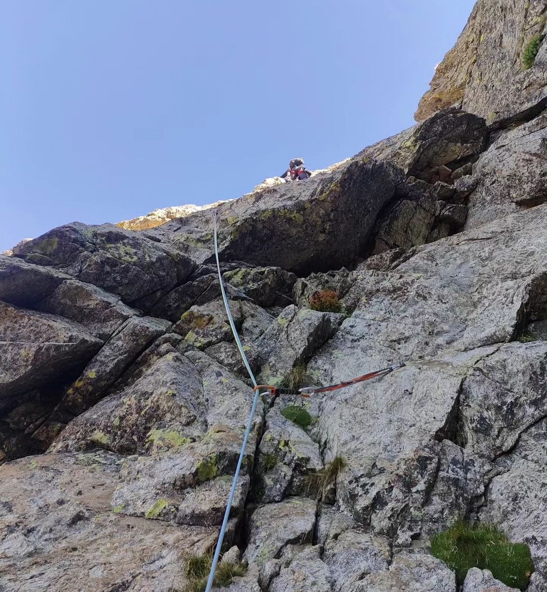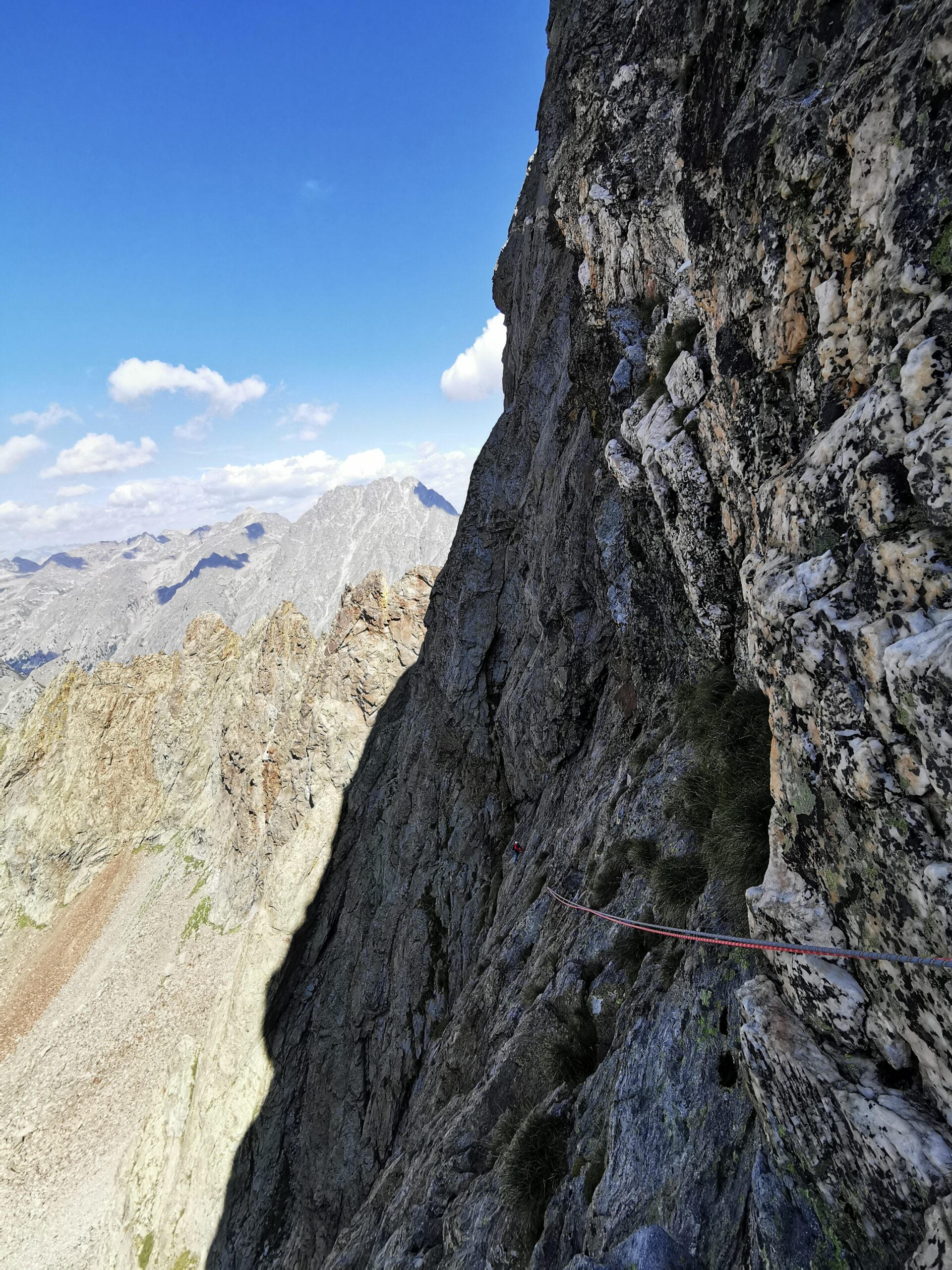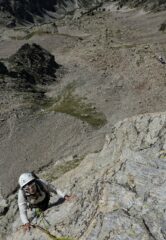 - L7) Continuare per la fessura (IV-), superare uno strapiombetto a destra della grande lama (IV+), salire quindi leggermente a dx su belle placche lavorate (fix/ch. poco visibili) con qualche passo delicato (IV/+). All’ultimo ci si sposta qualche metro a sx raggiungendo un comodo terrazzo di sosta (all’incirca leggermente a sx della verticale della sosta precedente). 40 m