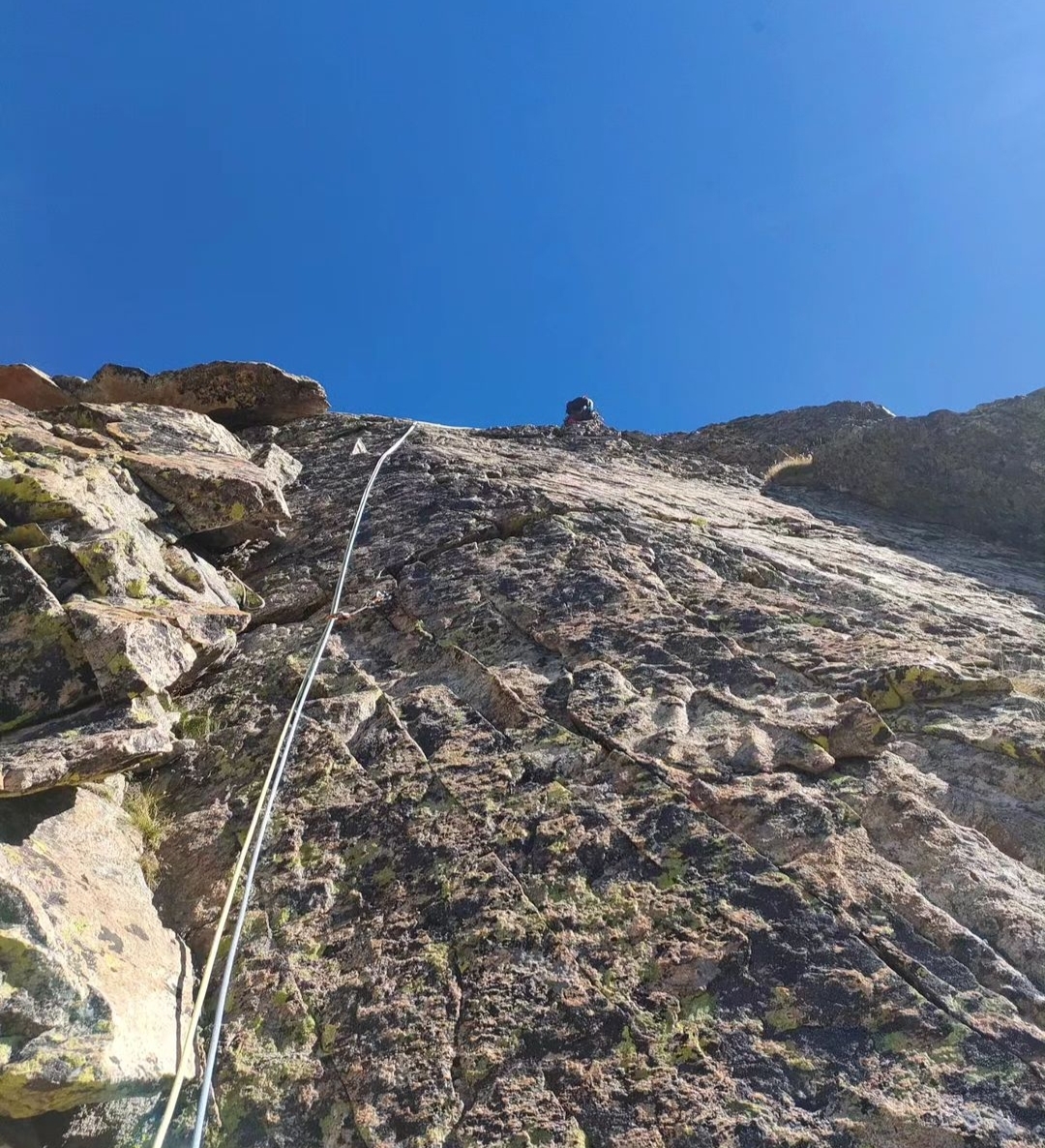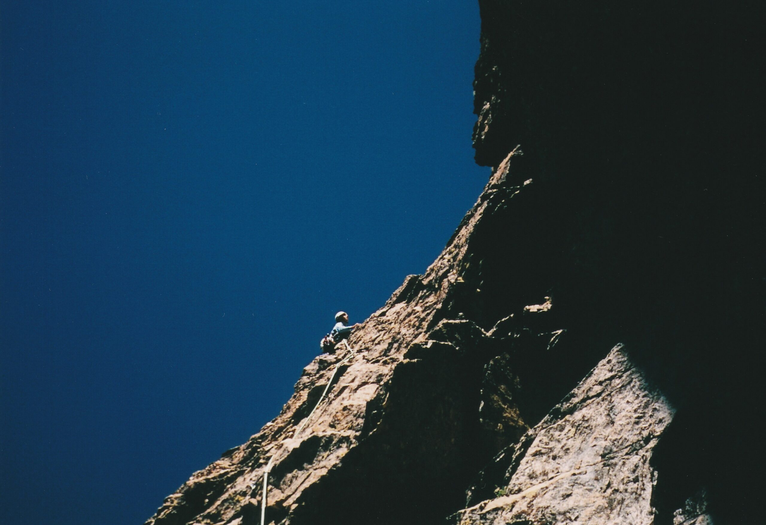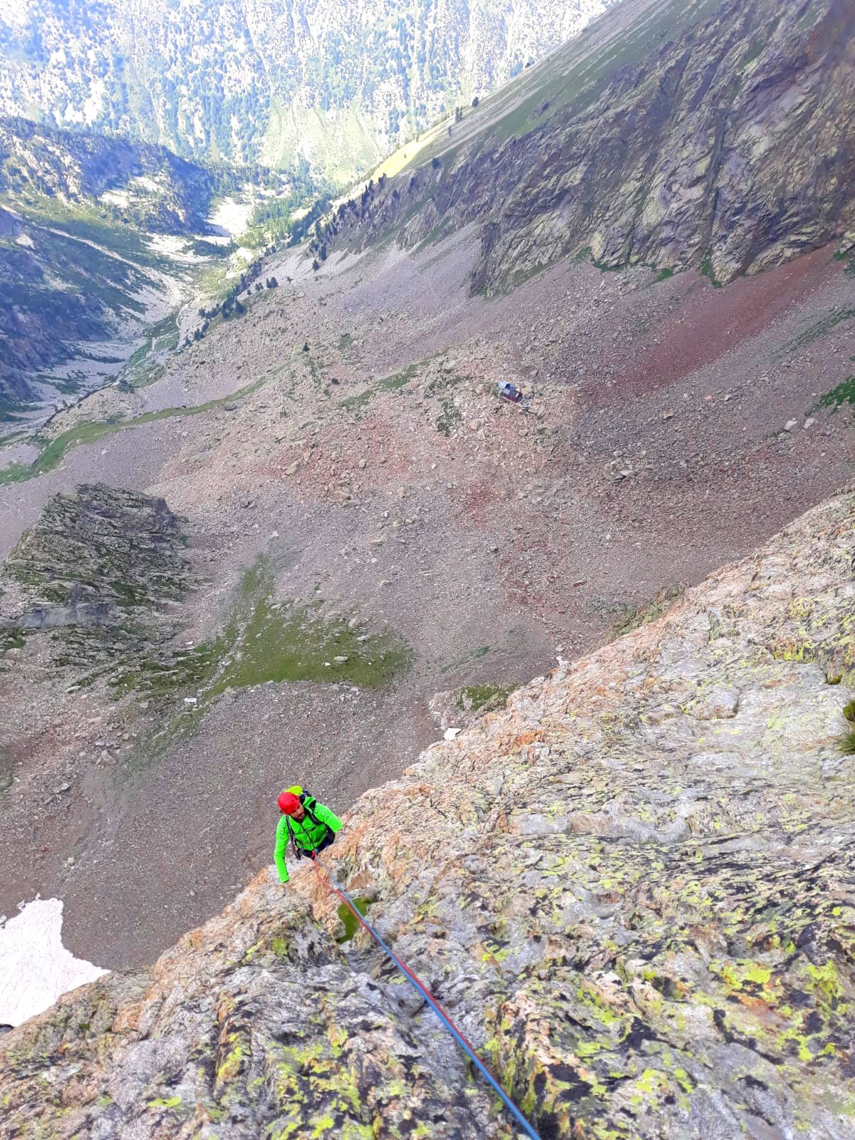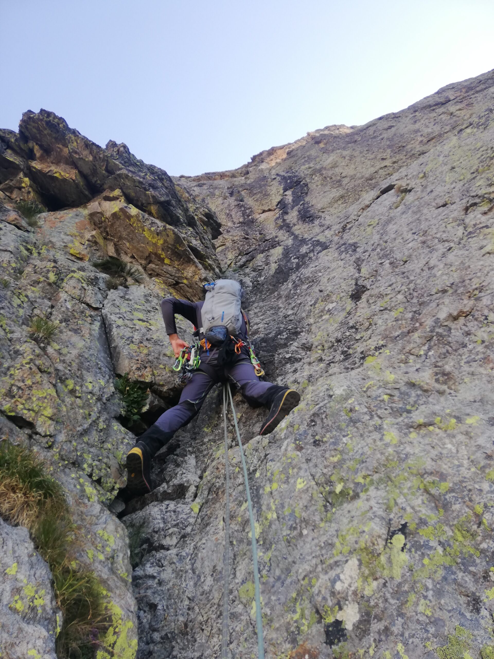 - L7) Continuare per la fessura (IV-), superare uno strapiombetto a destra della grande lama (IV+), salire quindi leggermente a dx su belle placche lavorate (fix/ch. poco visibili) con qualche passo delicato (IV/+). All’ultimo ci si sposta qualche metro a sx raggiungendo un comodo terrazzo di sosta (all’incirca leggermente a sx della verticale della sosta precedente). 40 m