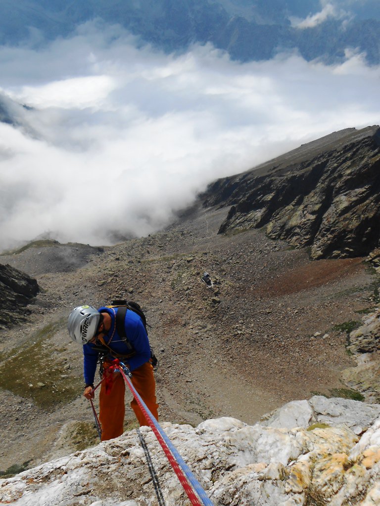 Da qui o disarrampicando o con un’altra calata (sosta vicino alla targhetta di Opinioni di un clown) si scende al sentierino della parte inferiore della cengia. Con un’ultima doppia da 50 metri (o disarrampicando) si scende fino ai ghiaioni.