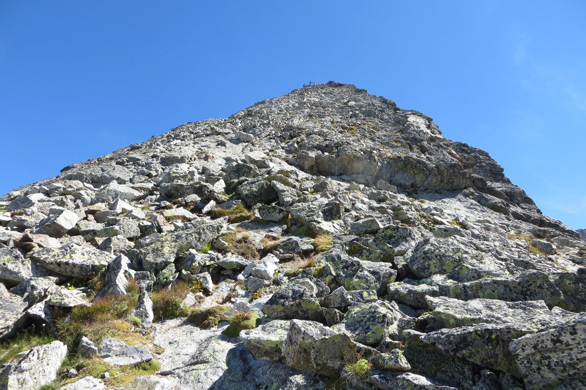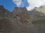 Dal rifugio risalire i ghiaioni (ottimo sentiero lastricato) fino sotto alla verticale della vetta, proseguire su traccia che scontorna lo zoccolo sulla dx e all'ultimo salire a sinistra verso un camino che porta alla cengia mediana (frecce gialle e corda fissa).