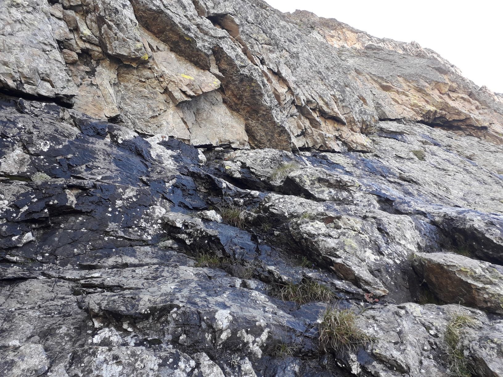 - L5) Superare la vena di quarzo salendo il caminetto di destra (qui si incontra un’altra sosta a spit). Non seguire la facile e invitante rampa erbosa all’estrema destra, ma obliquare a sinistra aggirando una placca liscia e salire poi un canalino obliquo a destra che si restringe a caminetto ingombro di massi; si sbuca quindi su una placchetta inclinata e facilmente si sale alla base di un grande diedro che ha come faccia destra una grande placca di rocce nere (III/+, 1 ps di IV nel camino, 50 m)