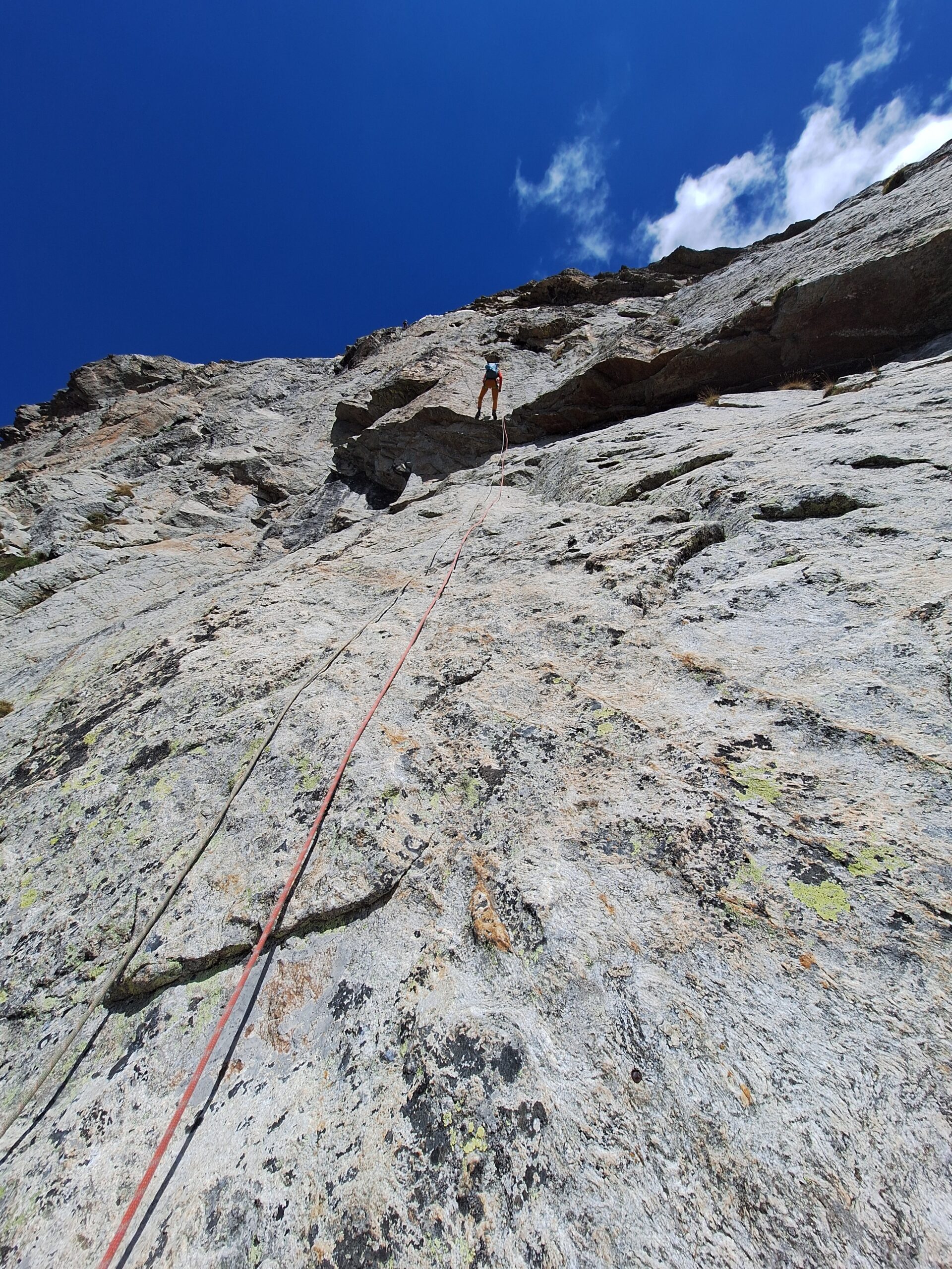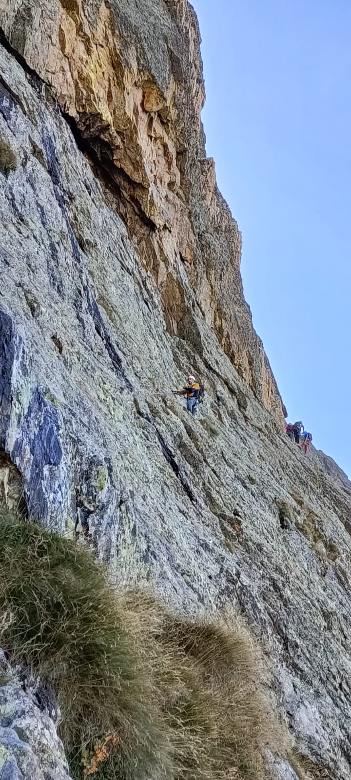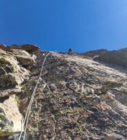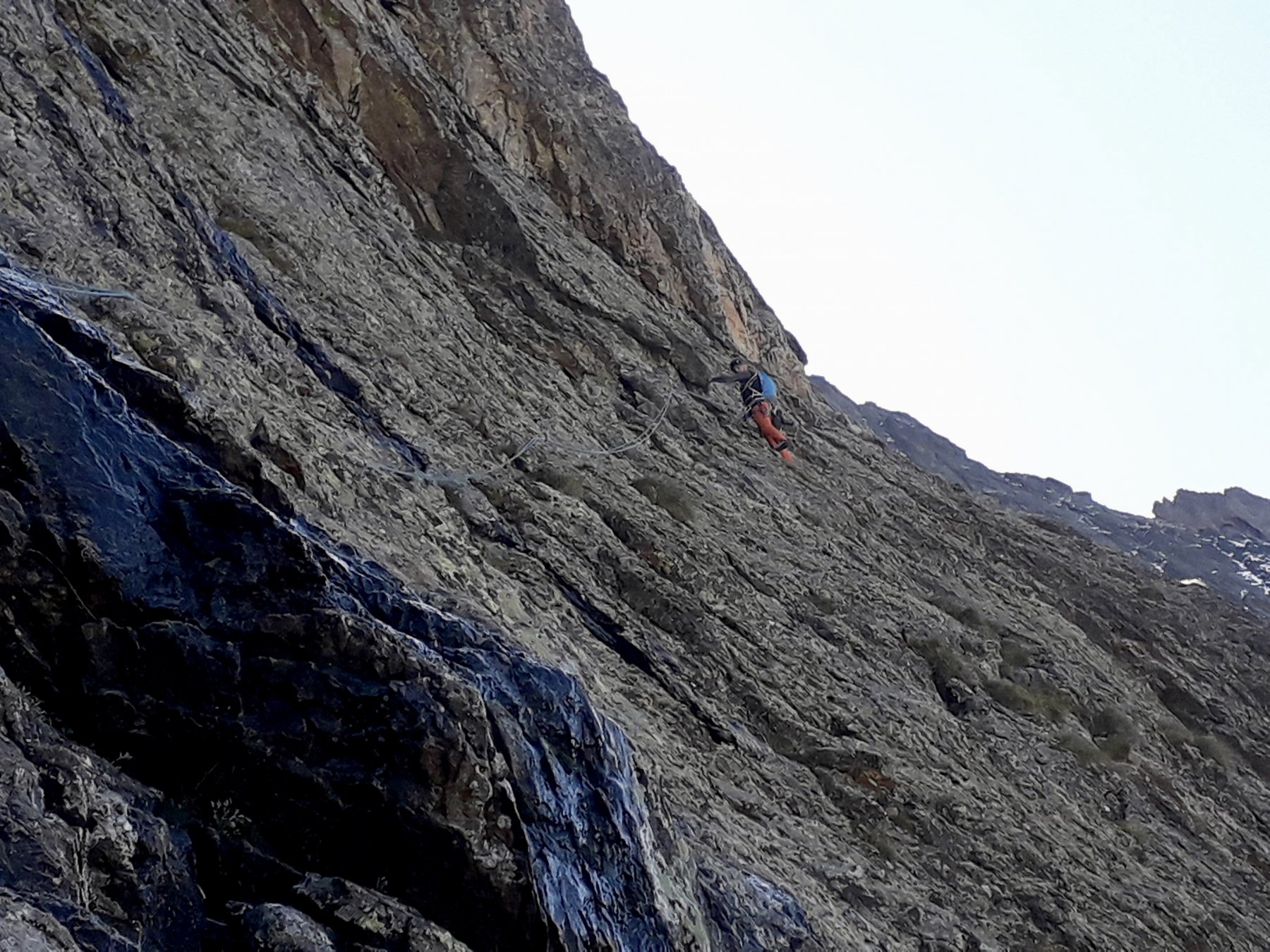 - L3-L4) Salire a un fix sotto lo strapiombo, quindi traversare a destra per 60 metri su una grande placconata inclinata (III, sosta spit + chiodo all’altezza della vena di quarzo). Presente una sosta a fix da collegare anche a metà del traverso. Primissimi metri del traverso spesso bagnati