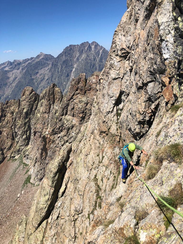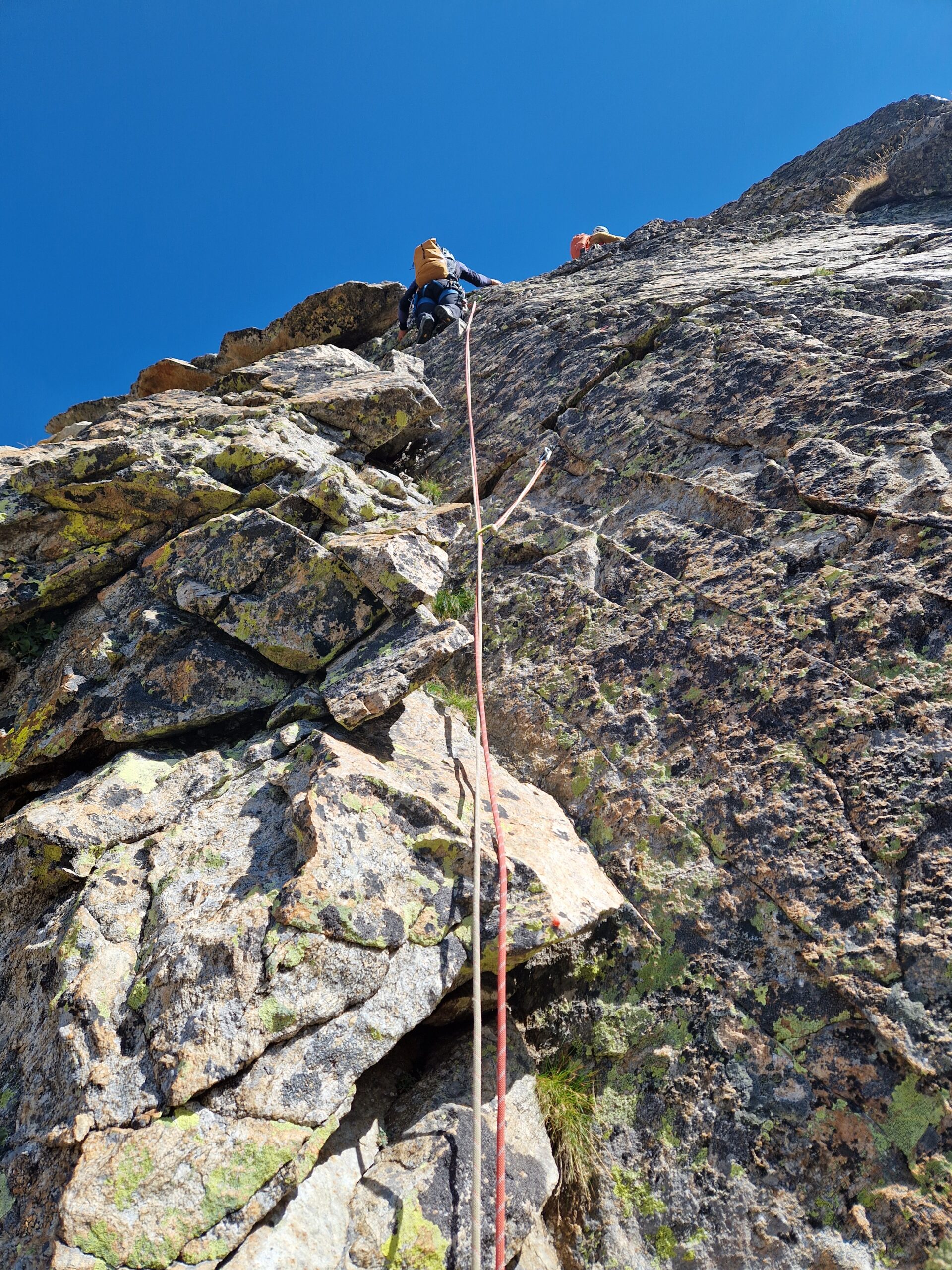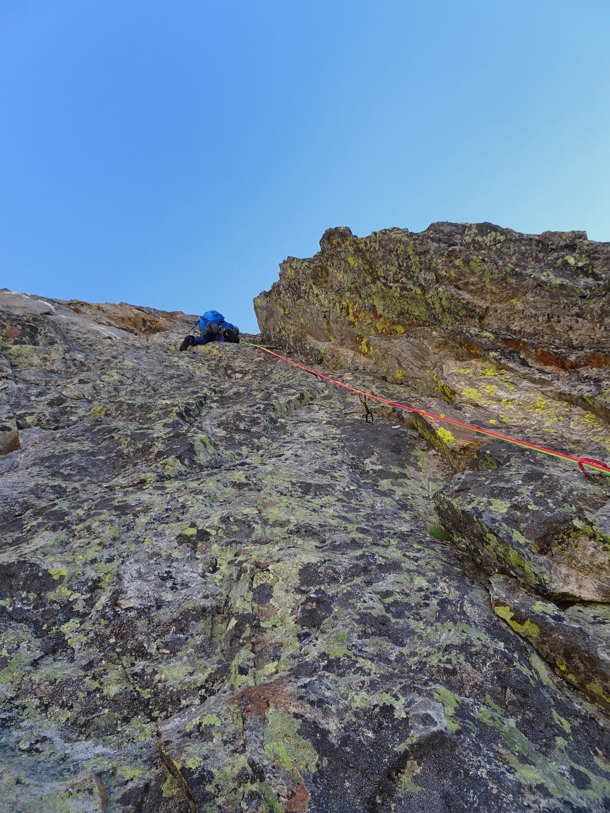- L3-L4) Salire a un fix sotto lo strapiombo, quindi traversare a destra per 60 metri su una grande placconata inclinata (III, sosta spit + chiodo all’altezza della vena di quarzo). Presente una sosta a fix da collegare anche a metà del traverso. Primissimi metri del traverso spesso bagnati