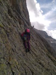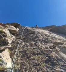 Traversare a sinistra per qualche metro su cengia fino a reperire il primo ancoraggio con catena.