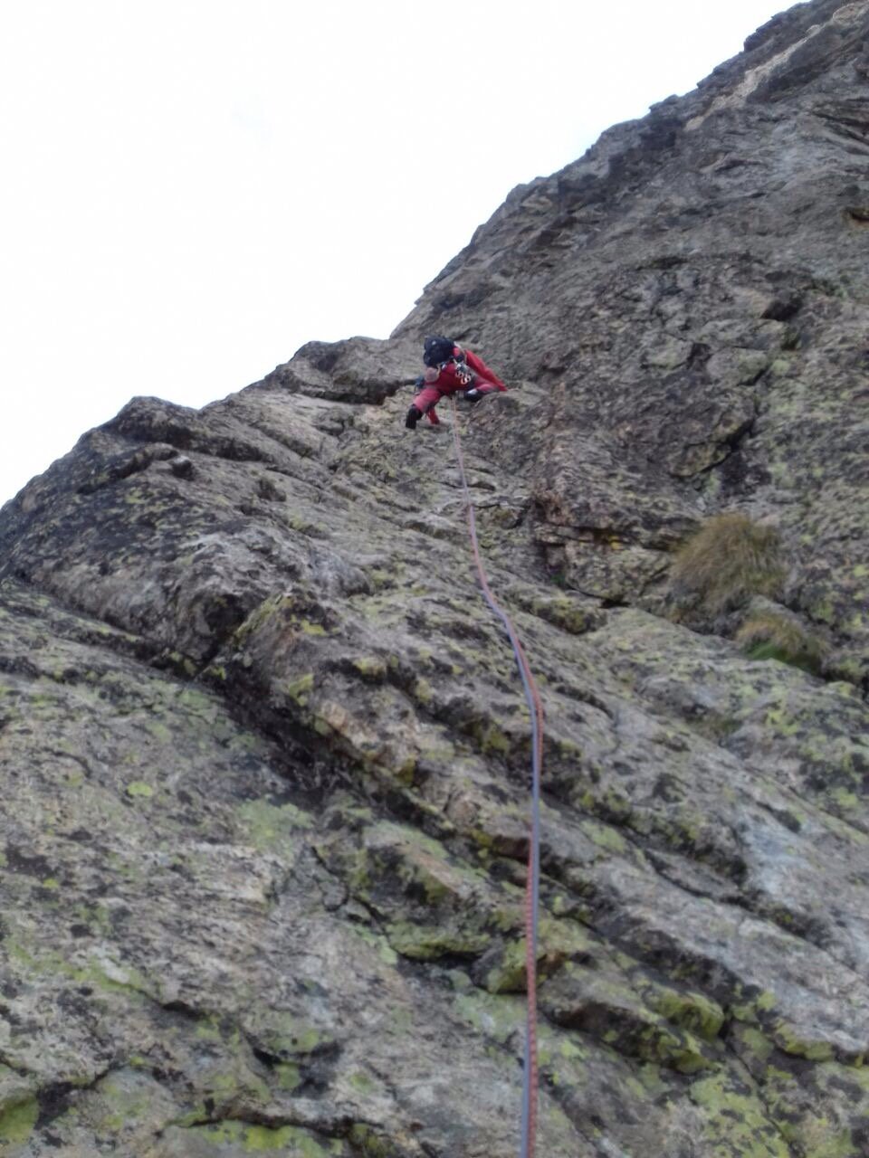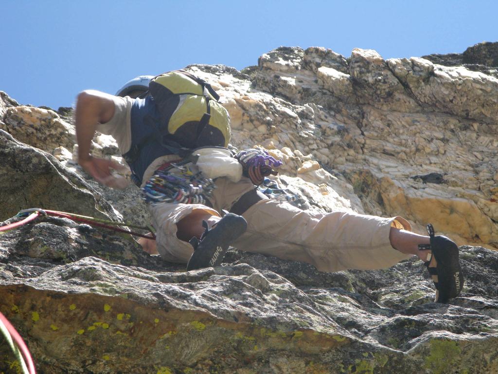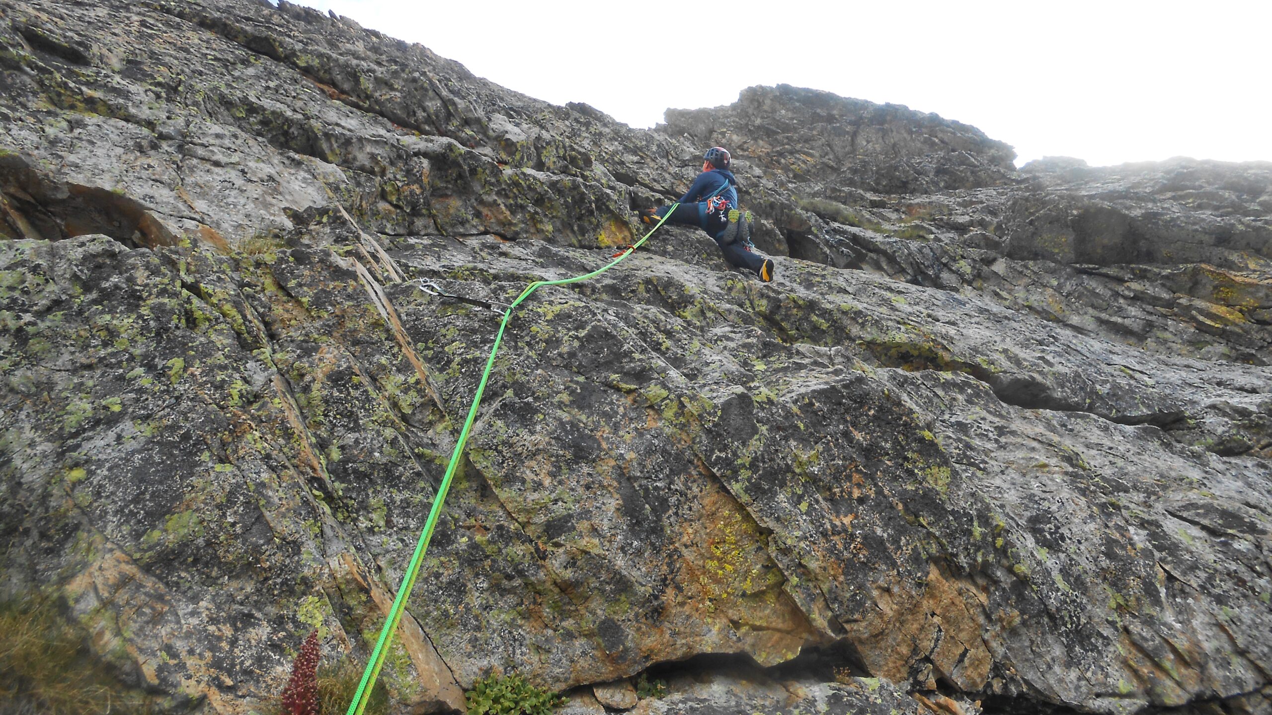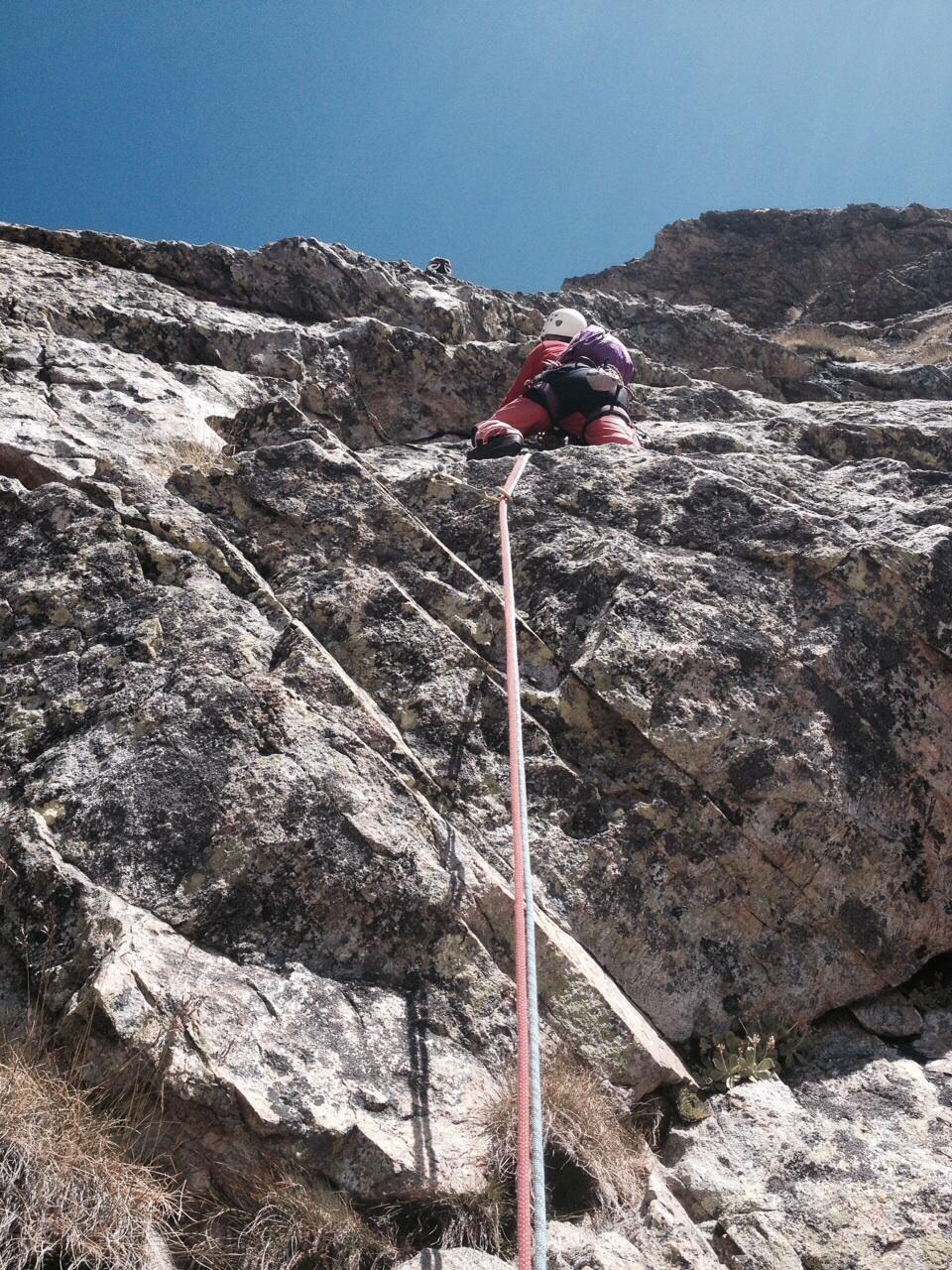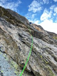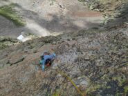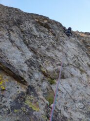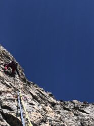 L4: si supera un bel tetto con passaggio di forza, si traversa a destra la caratteristica vena di quarzo che taglia la parete, quindi diritti per placca fino alla sosta (6a, 40 m).
