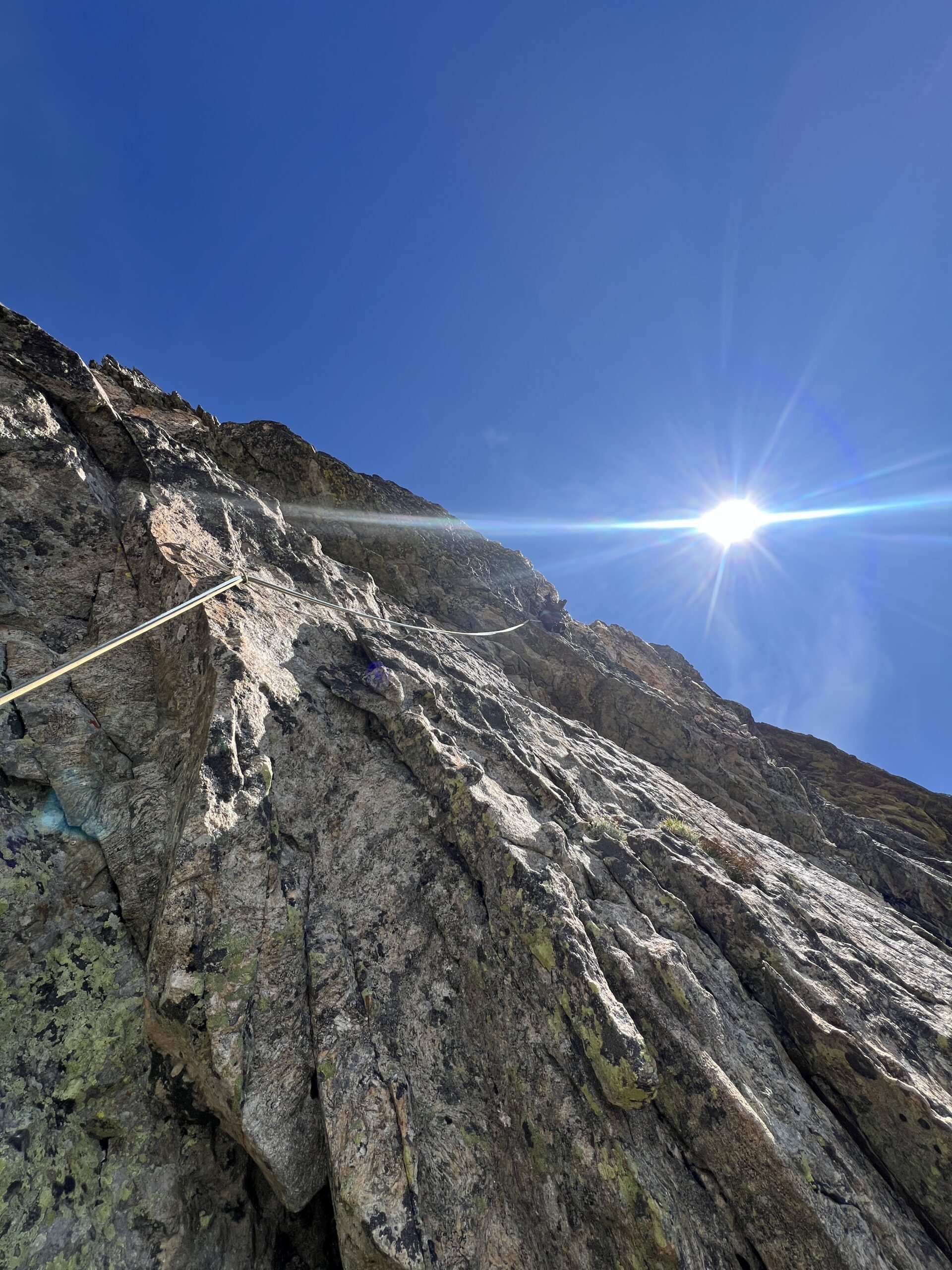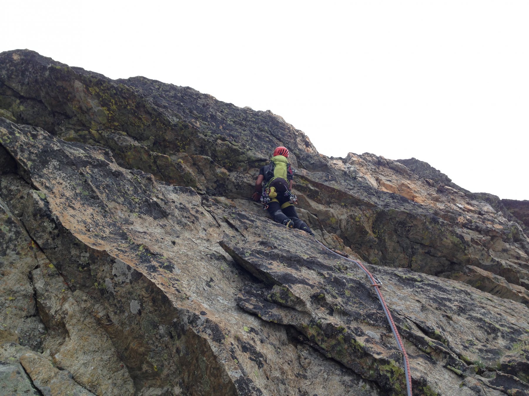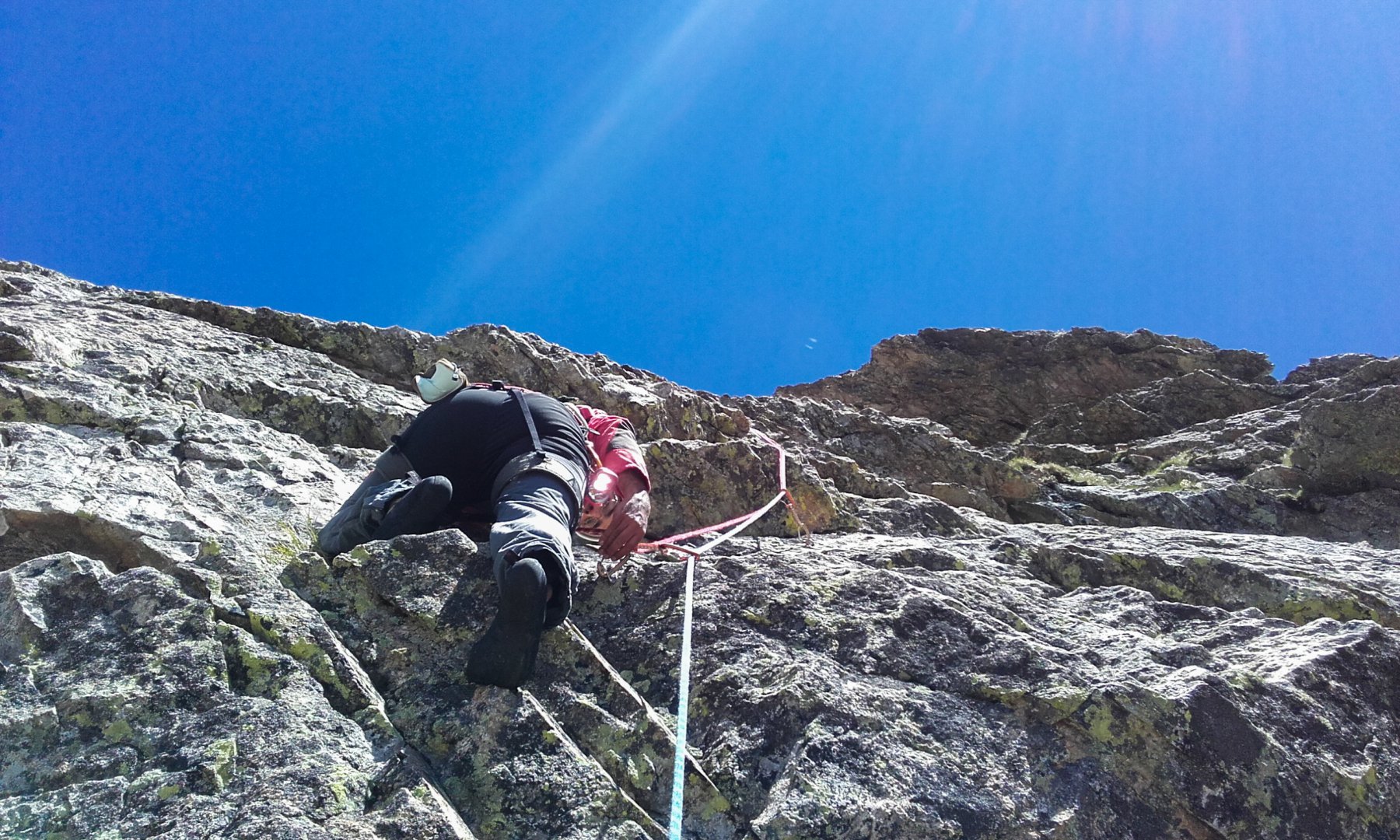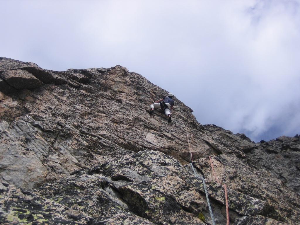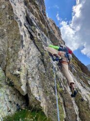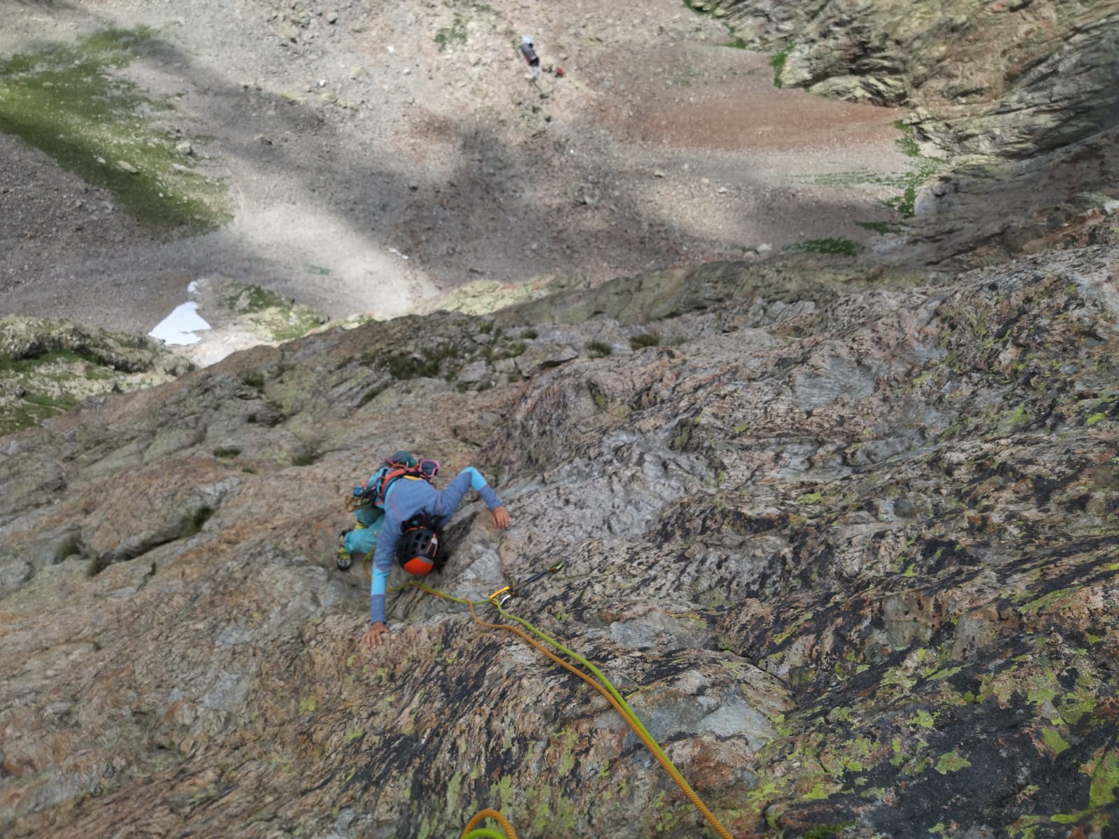 L4: si supera un bel tetto con passaggio di forza, si traversa a destra la caratteristica vena di quarzo che taglia la parete, quindi diritti per placca fino alla sosta (6a, 40 m).