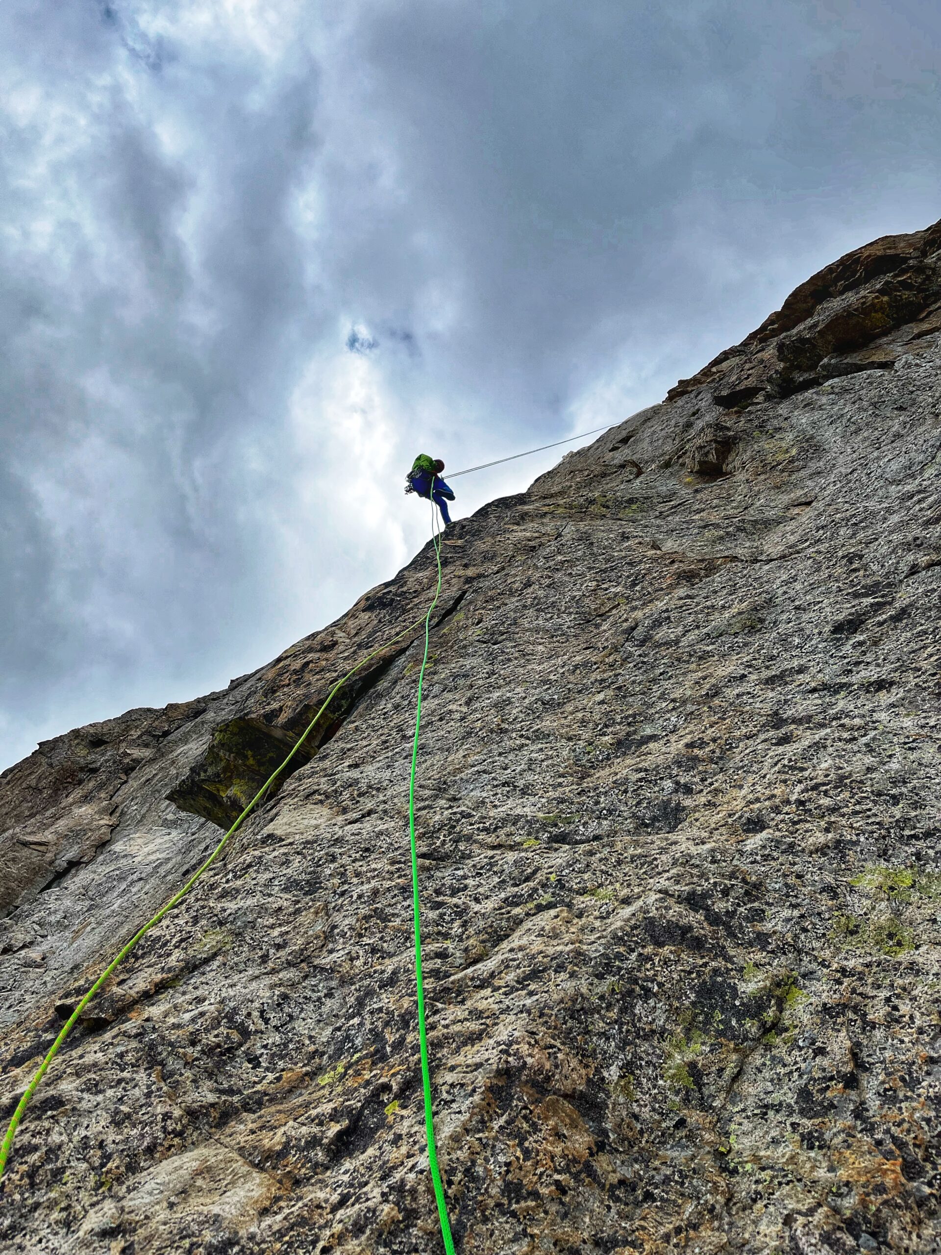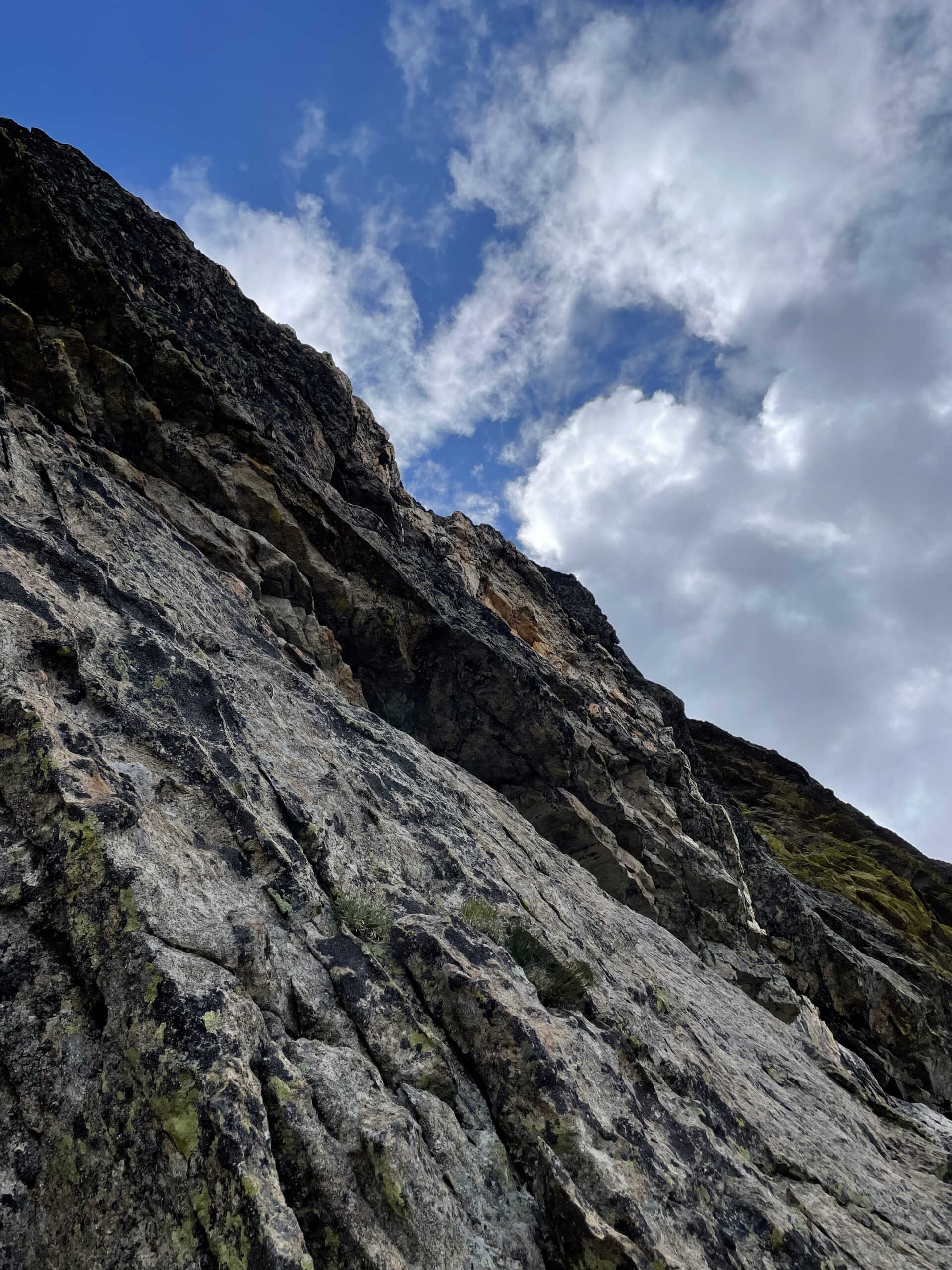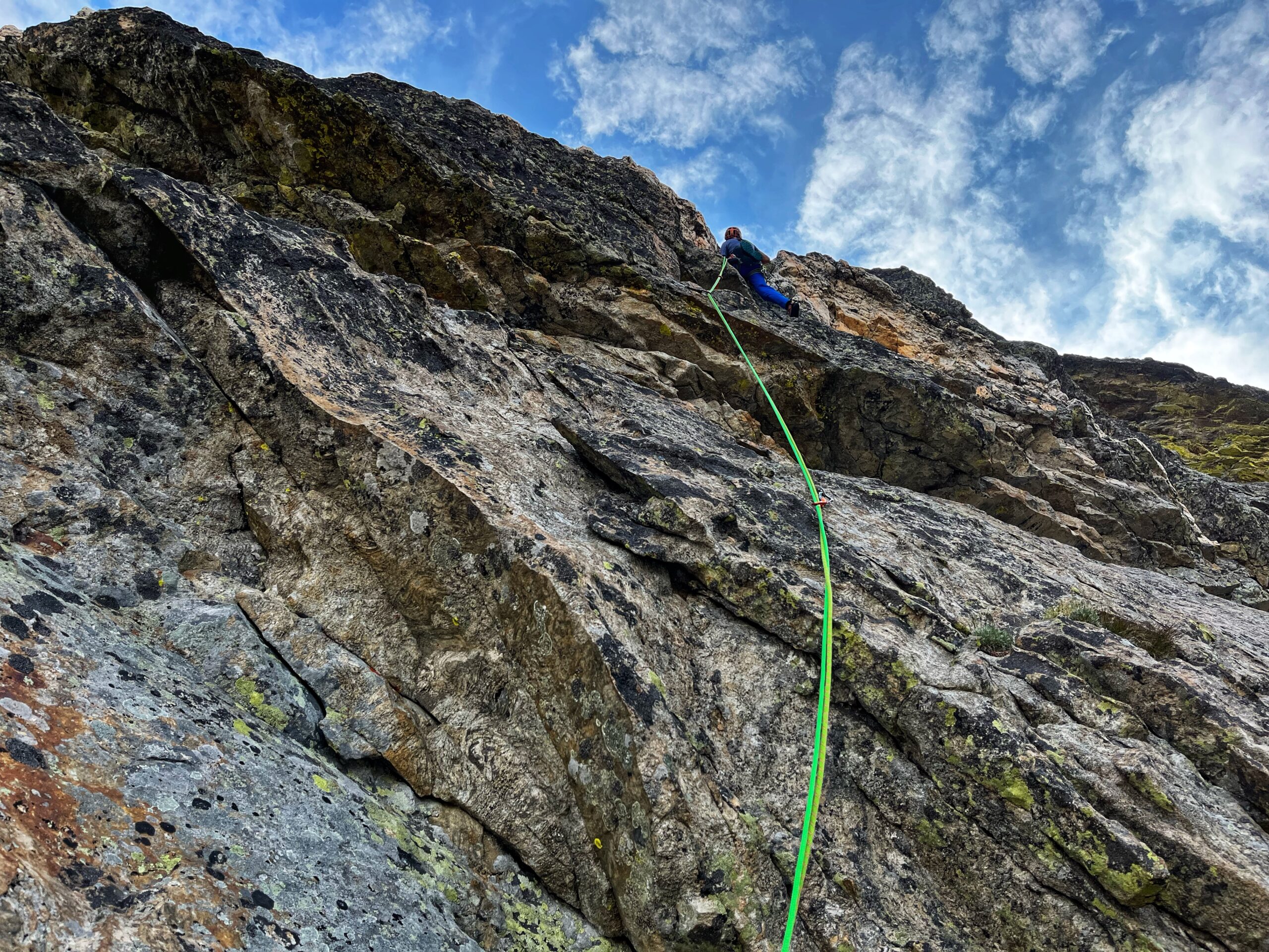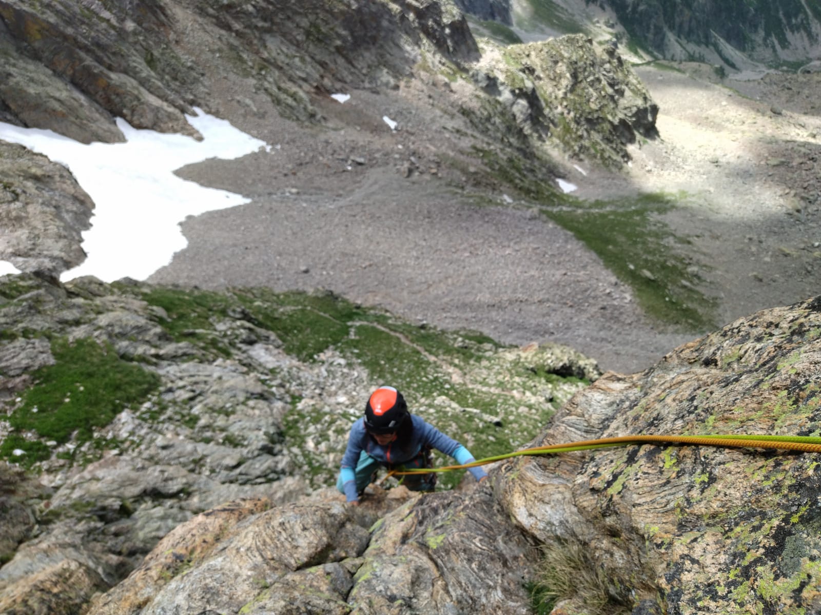 L4: si supera un bel tetto con passaggio di forza, si traversa a destra la caratteristica vena di quarzo che taglia la parete, quindi diritti per placca fino alla sosta (6a, 40 m).