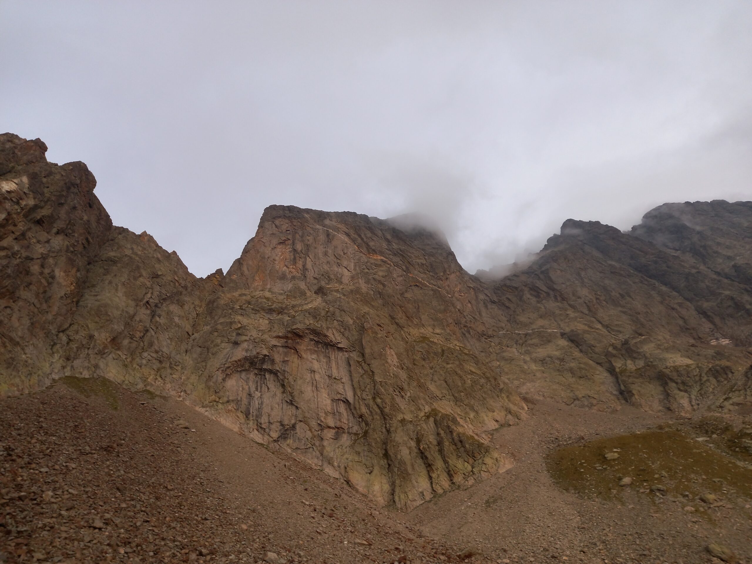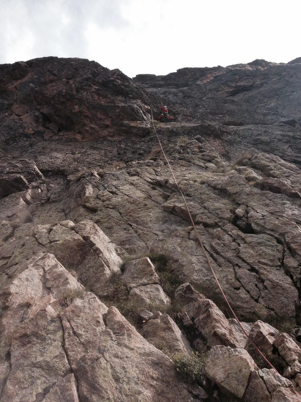 L1: si sale verso un tetto, che si aggira sulla destra; si prosegue lungo un diedro da proteggere, poi dritti per placche (6a, 50 m).