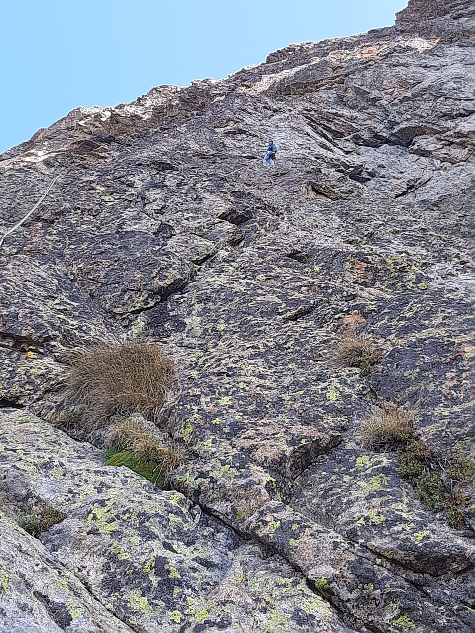 L’idea iniziale era di fare Vecchi Lupi ma giunti sulla cengia mediana vediamo la targhetta dei Lupetti e ci facciamo ingolosire. La via è su roccia stupenda e molto continua sul 6a, grado che bisogna padroneggiare dato che è obbligatorio vista la chiodatura molto distanziata; a mio avviso un paio di spit in più a tiro ci starebbero dato che è molto difficile integrare e in alcuni tratti è proprio meglio non volare. Soste a fix con anello ma non collegate, volendo ci si può calare sulla via. I tiri a mio avviso più duri sono: L1: il primo tettino è difficile da proteggere, meglio non volare.