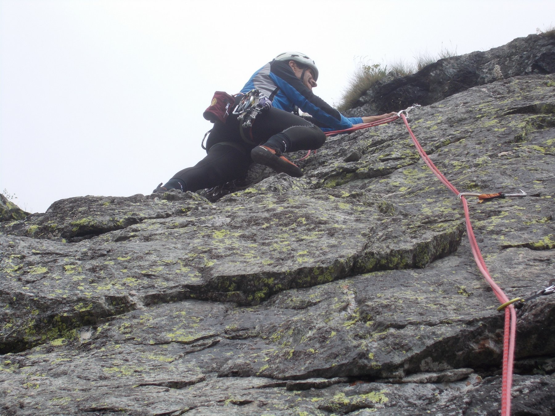 Dopo IL primo tiro della via attraverso il buco, ci siamo trovati costretti a spostarci con un traverso su bagnato sulla Modus Operandi di poco piu’ a dx, che da sotto sembrava tutta ben asciutta fino al termine dei tre tiri. Unica via salibile su roccia divertente,con prese piccole ma nette. ben protetta ma sopratutto all’asciutto. Altrove sulle altre vie adiacenti specie quella del tetto, oltre a quella attraverso il buco e non solo, colava giu’ acqua un po’ ovunque. Il temporale di ieri a fatto di questa parete altrimenti carina di roccia compatta pen spittata e con un bel panorama sulla sottostante conca di Scalaro, un unica colata d’acqua oggi con tanto di rivoletto a centro parete. Scesi con due doppie, una da 60m, l’altra direttamente su uno spit per giunta ballerino, che con altri 50 metri ci ha ridepositati alla base. Scelta di proposito questa zona con avvicinamento tutto sommato breve, giusto per occupare l’arco della mattinata. Sul mezzogiorno nebbie e minaccia di temporale gia’ la facevano da padrone, .Ma ormai noi gia’ eravamo giu al sicuro.