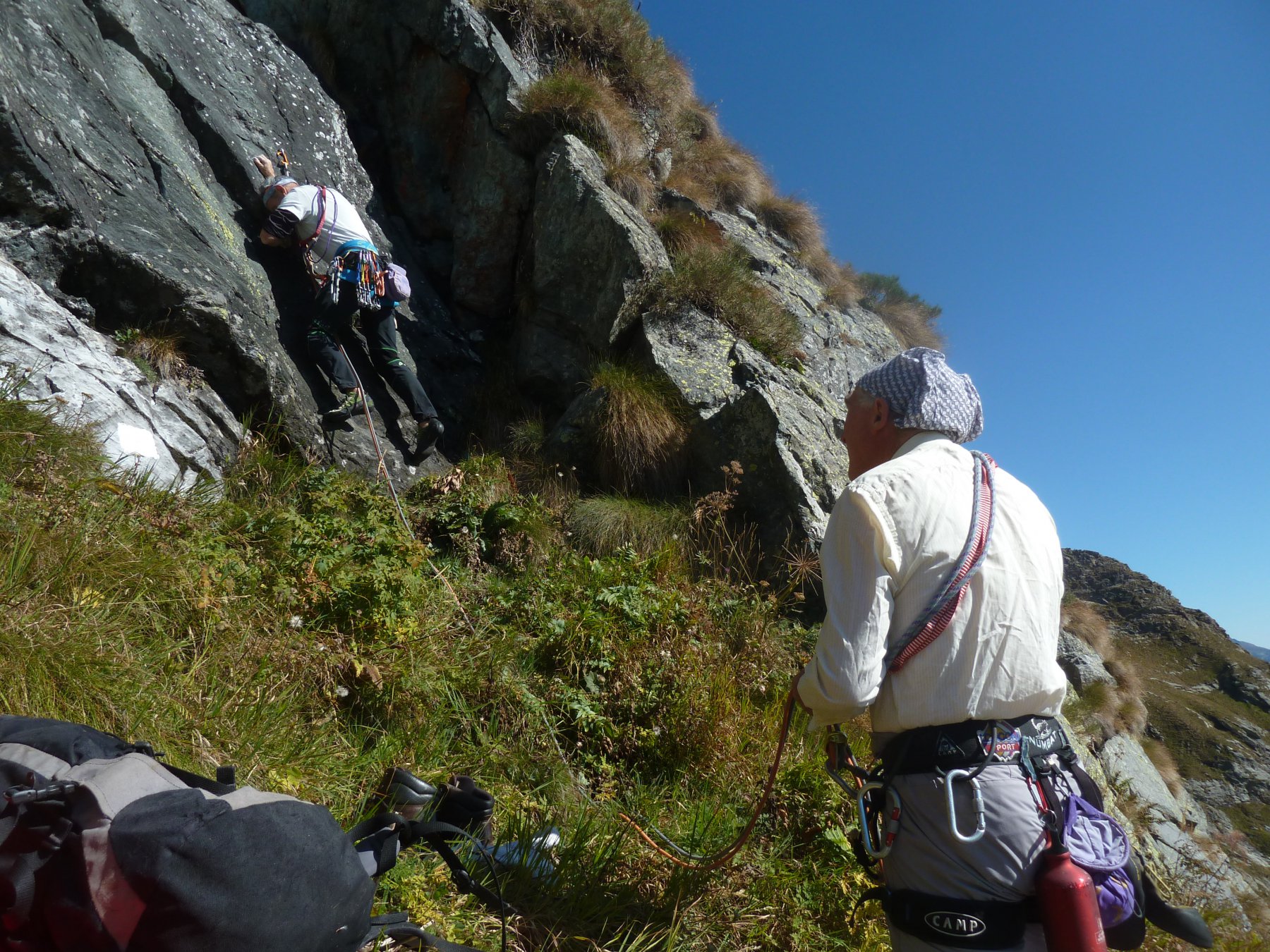 bella scalata in ambiente tranquillo, solo i campani delle mucche! La via ampiamente protetta a fix, anche se qualcuno mal posizionato, non necessitano integrazioni. La gradazione riportata sulla guida “statale26” ci pare corretta al di fuori dell’obbligatorio, in quanto il passo di 6c è nel moschettonaggio, poi bene; A0 possibile solo per giganti!!! Scesi con tre doppie : 60-60-30.