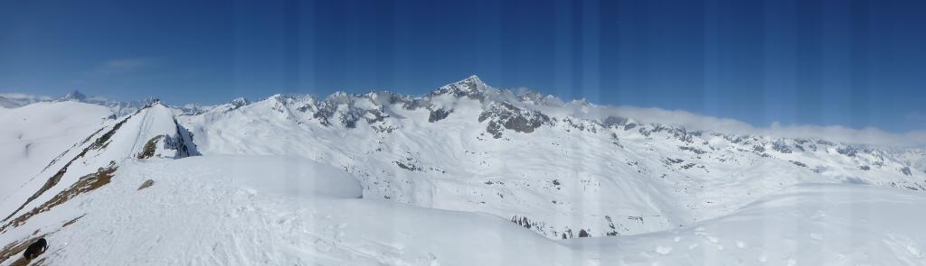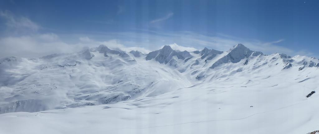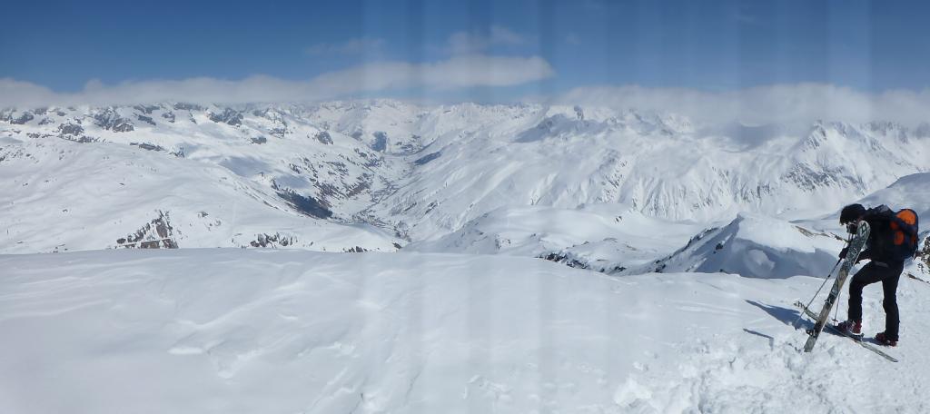 Erano sicuramente ***** per chi è sceso prestino, con pendii immacolati coperti anche da una decina di centimetri di neve freschissima e impalpabile. Essendo scesi praticamente per ultimi c’era già una leggera crosticina sui pendii laterali rivolti maggiormente a sud (lato sx scendendo) e tutte le tracce precedenti avevano in parte scoperto il fondo duro precedente. Giornata stupenda, con nubi solo all’orizzonte.