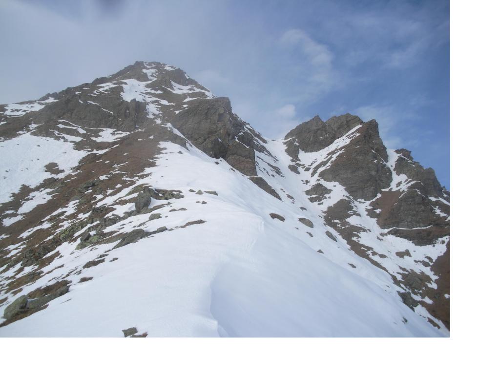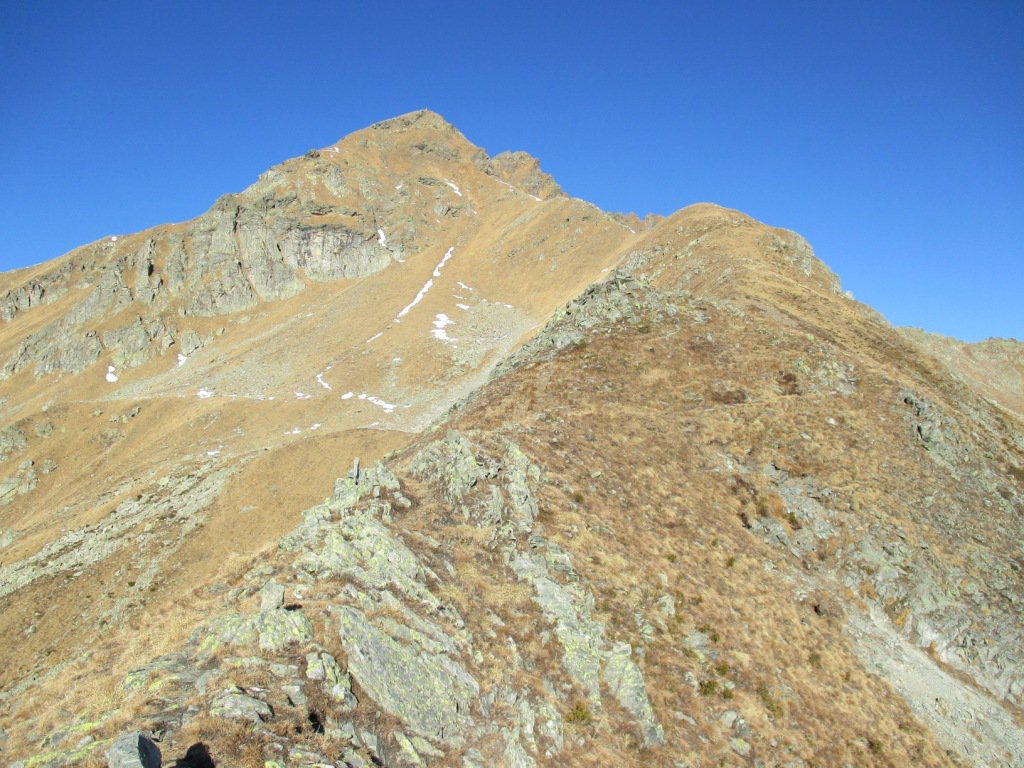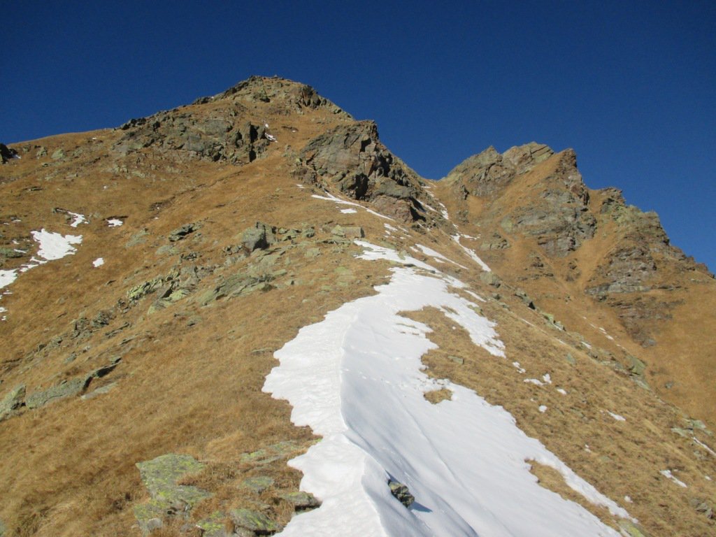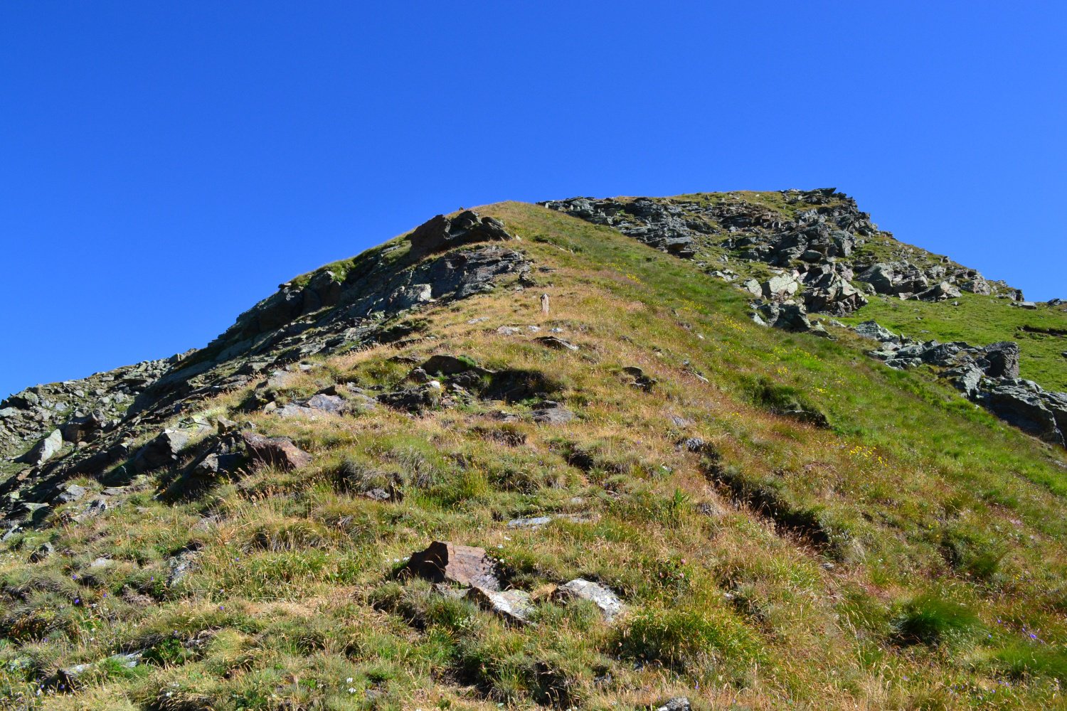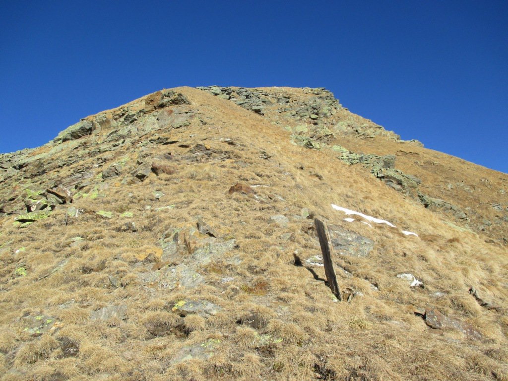 A questo punto lasciare la cresta ed attraversare a sinistra sulle due frane per circa cento metri fino a raggiungere un crestone secondario, risalire quest’ultimo su blocchi e zolle erbose sino sulla cima a m. 2712, dove sotto il segnale è posto il libro di vetta