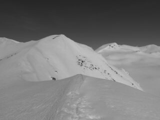 Strada fino al colle poi tracciato con neve compatta, buone condizioni per il traverso e l uscita in cresta, superbo il pendio a seguire per tenuta pelli fino alla cimetta.