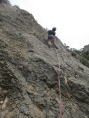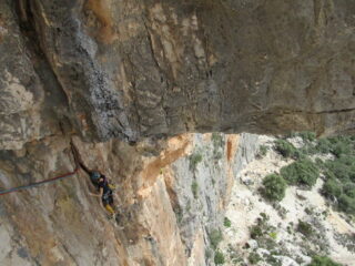 - L1 salire per evidente diedro rossastro fino a un albero di fico, proseguire fino alla sosta (scomoda) su due fix da attrezzare 5c chiodatura distanziata e roccia che richiede cautela