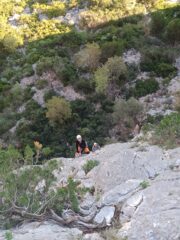Purtroppo dopo le piogge di ieri mattina alcune porzioni di parete erano ancora bagnate e hanno reso la scalata un po’ più impegnativa e psicologica. Roccia bella che diventa fantastica nella parte superiore della via. In prossimità delle cenge invece valutare quel che si tira e fare attenzione a non fare cadere pietre. Nei tiri più lunghi allungare bene le protezioni o sfalsare le corde. Materiale in parete ottimo e chiodatura giusta. Soste con catena e doppio moschettone???? A parte la prima su 2 spit da collegare.