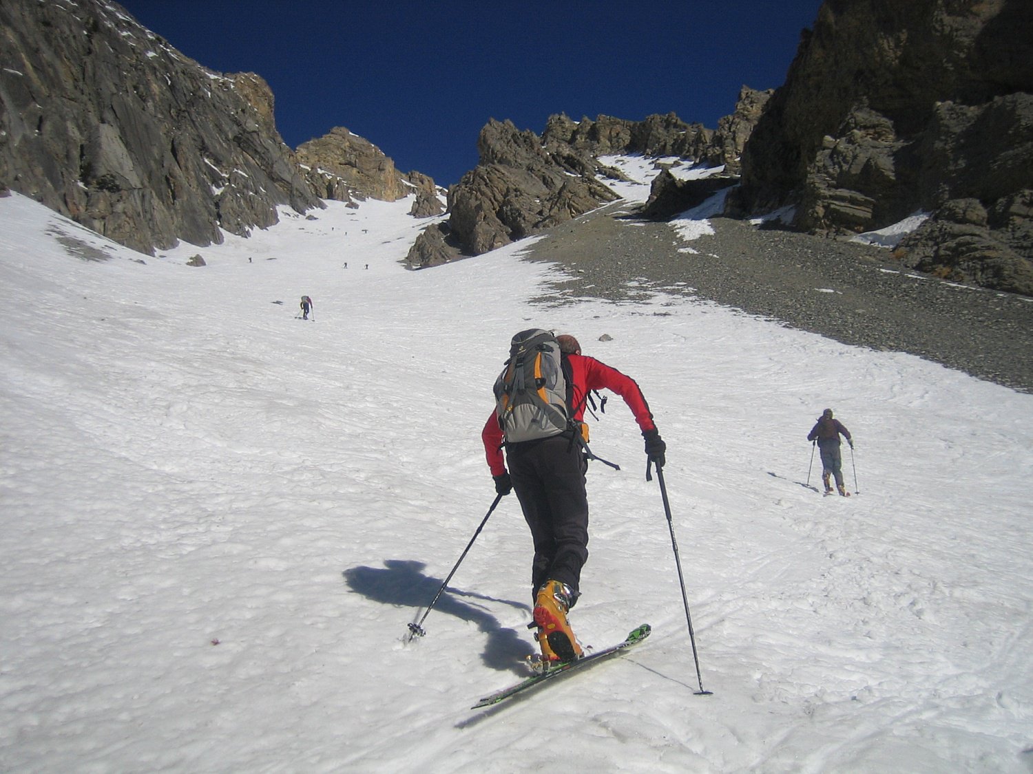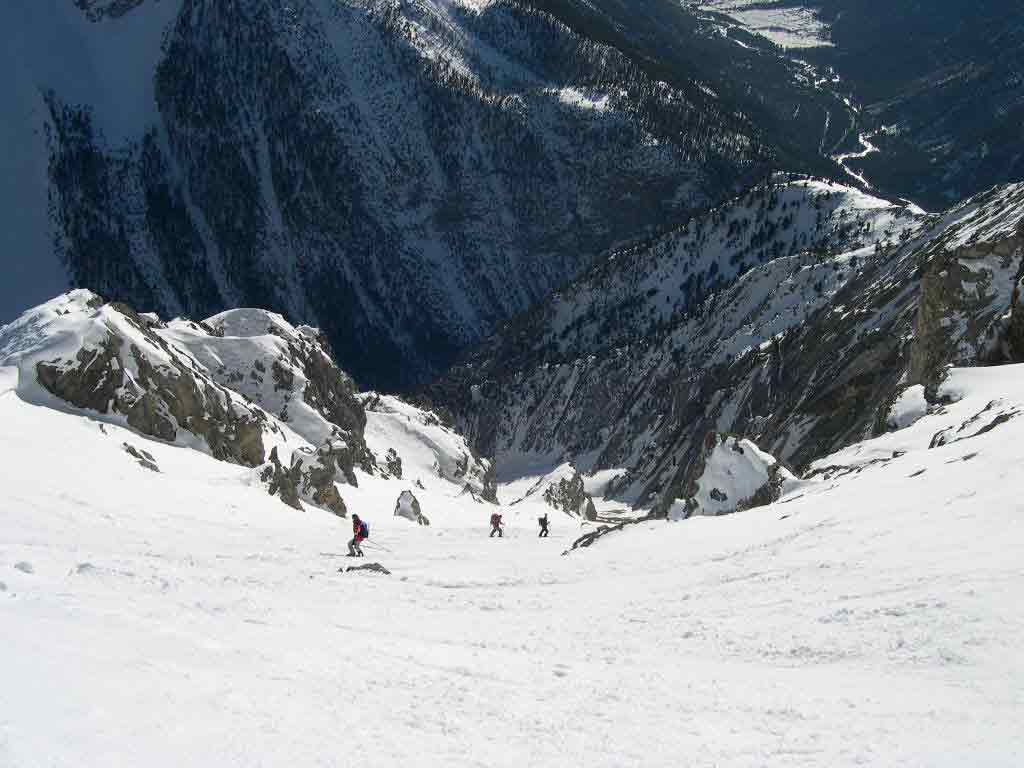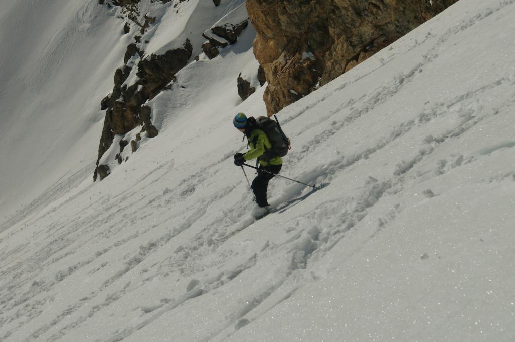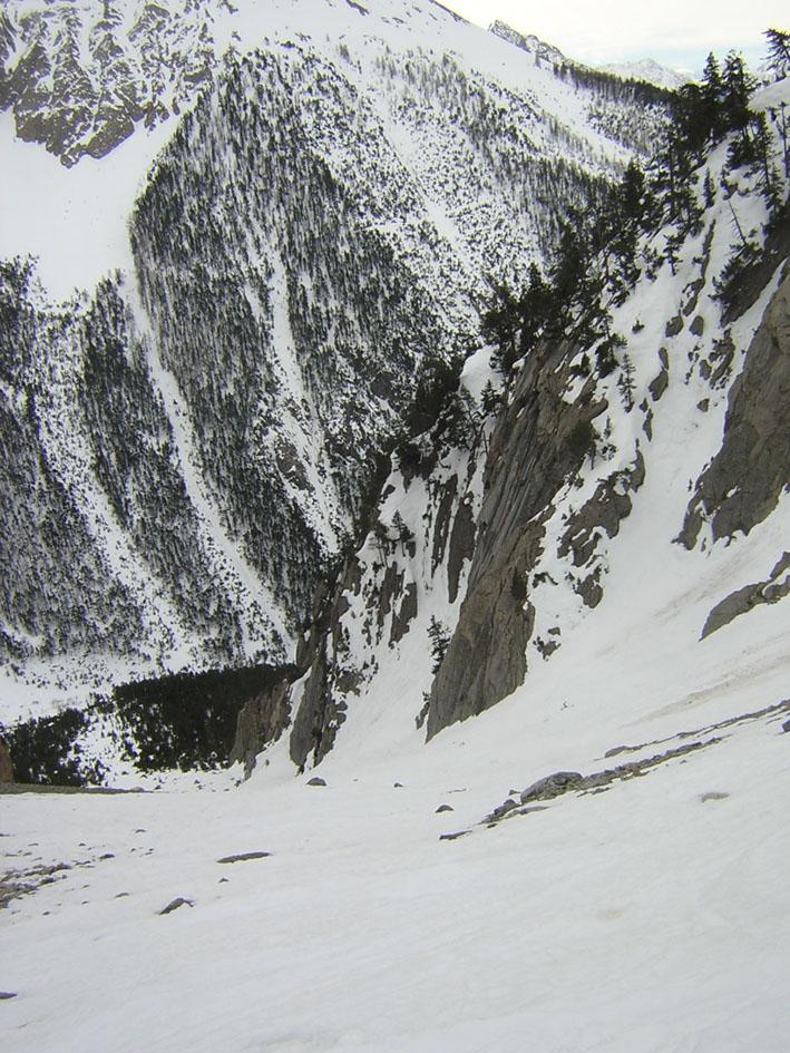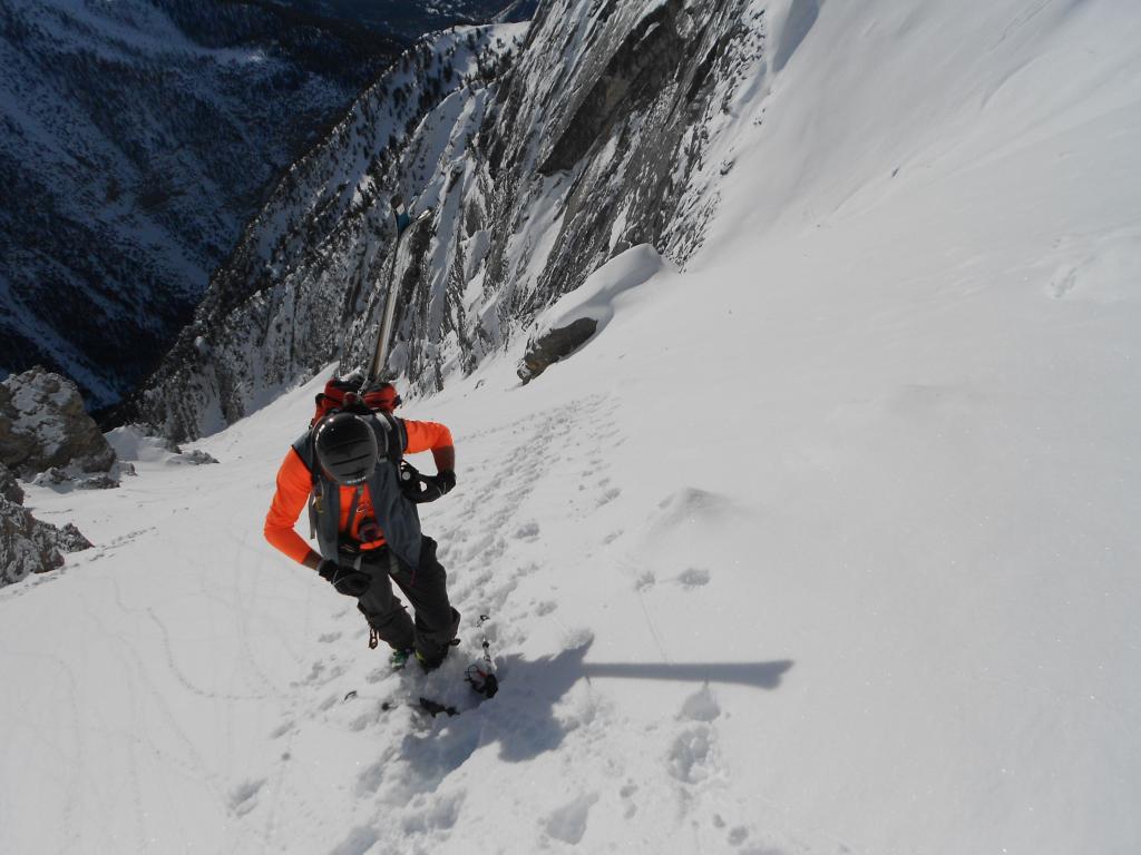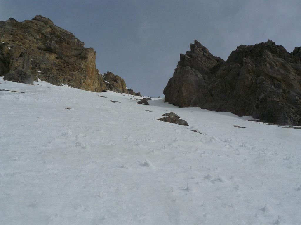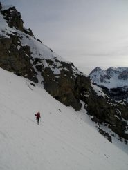 Risalire il canalone, dapprima inclinato intorno a 30°, ma che gradualmente diventa più ripido fino a sfiorare i 40° per un breve tratto, nella strettoia a 150 m. dall’uscita.