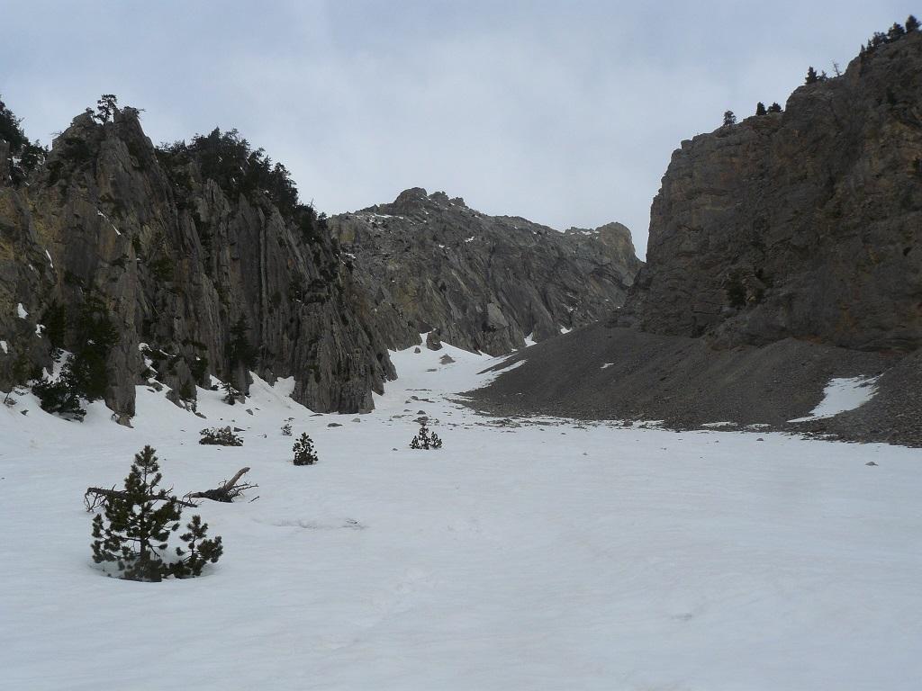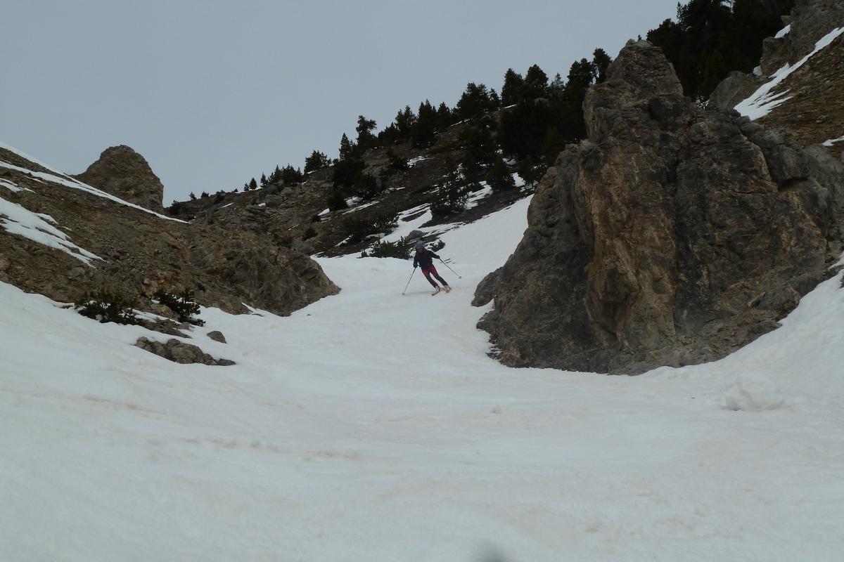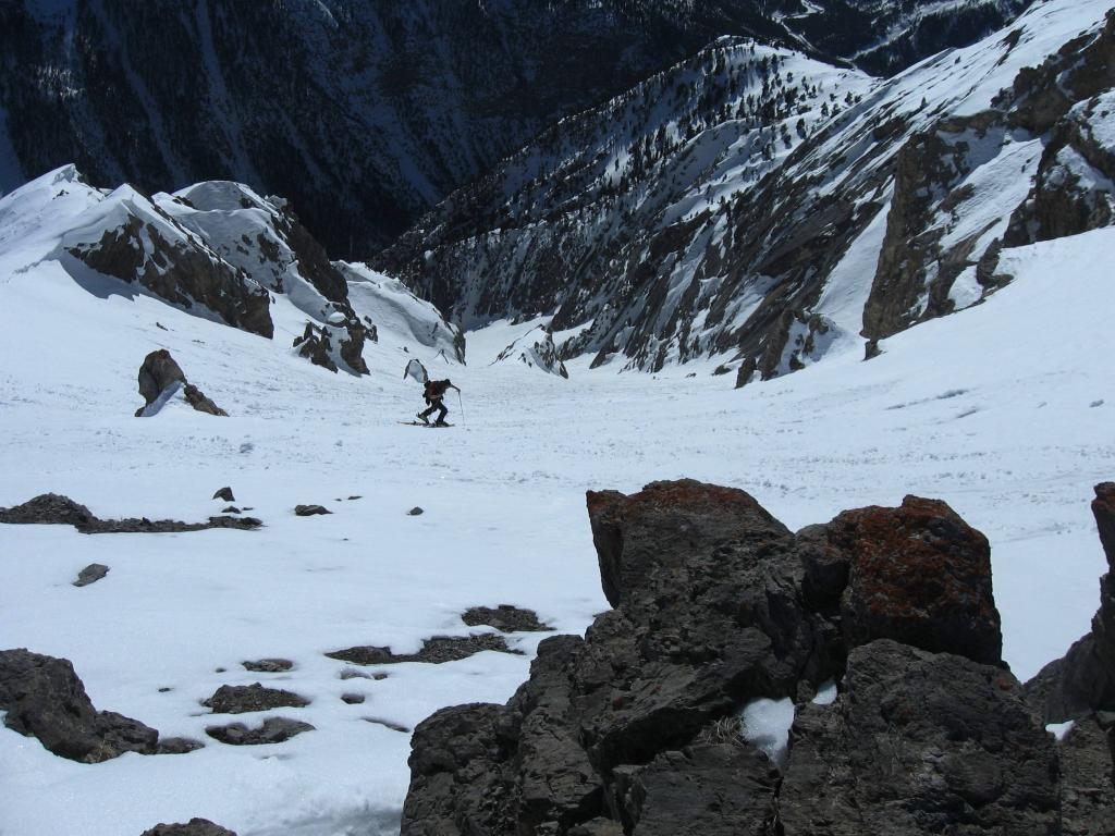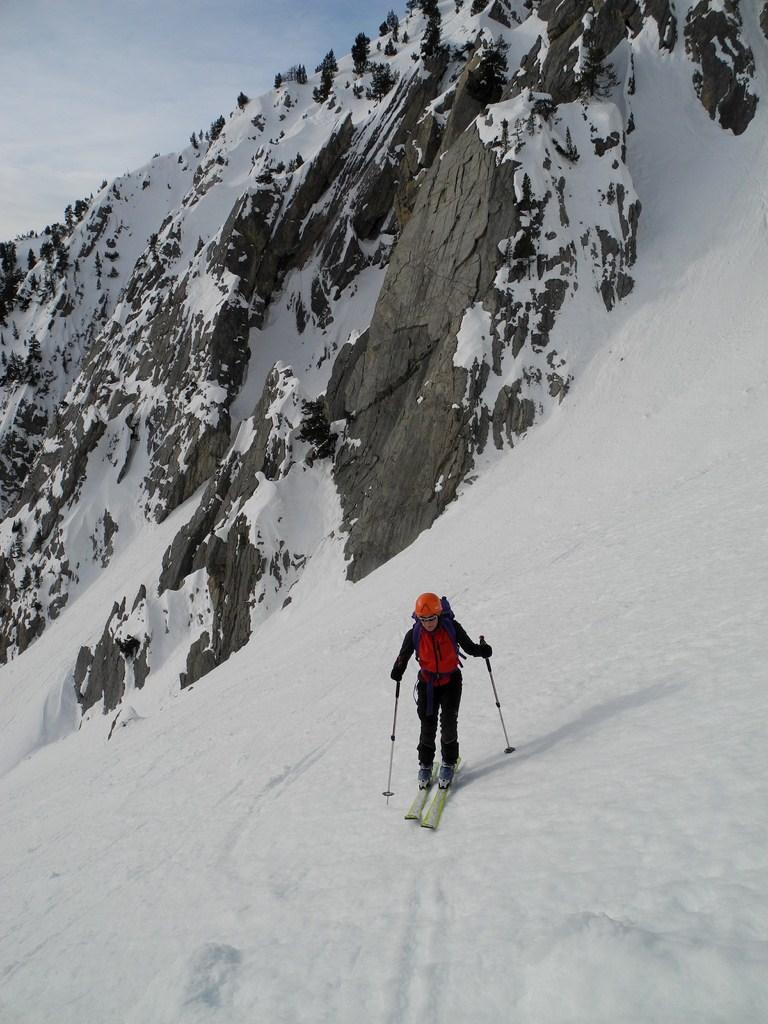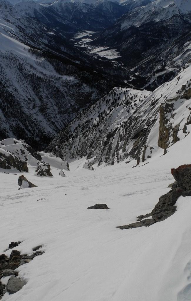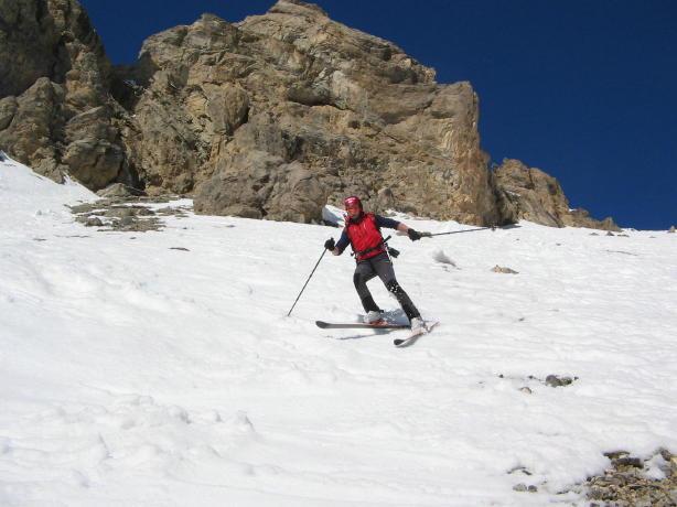 Risalire il canalone, dapprima inclinato intorno a 30°, ma che gradualmente diventa più ripido fino a sfiorare i 40° per un breve tratto, nella strettoia a 150 m. dall’uscita.
