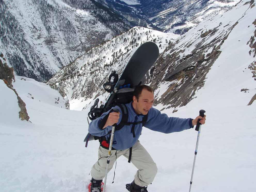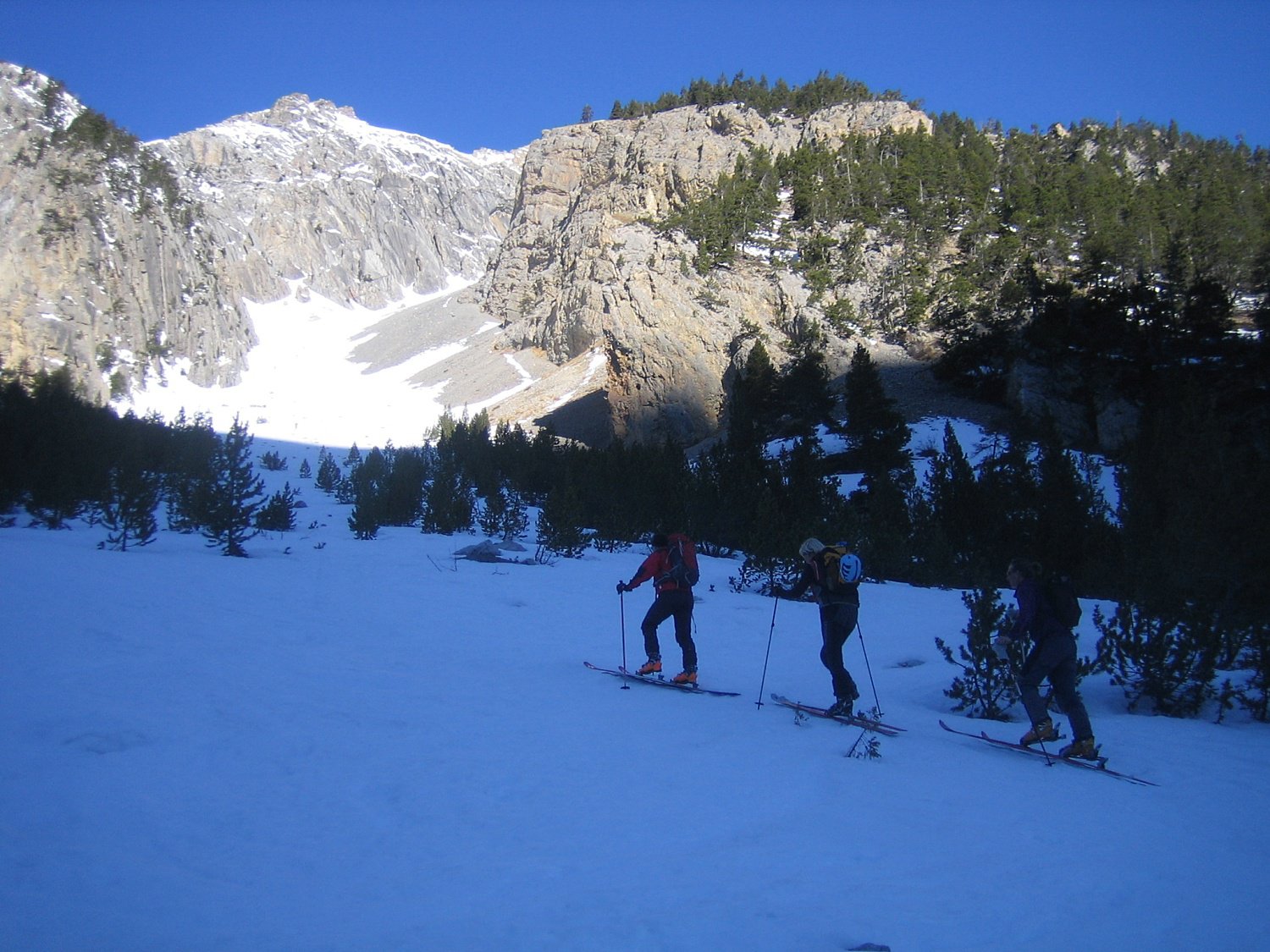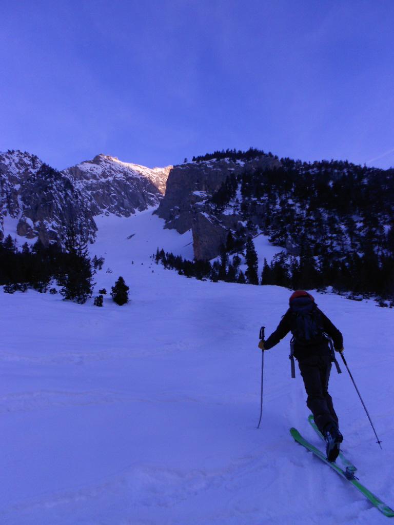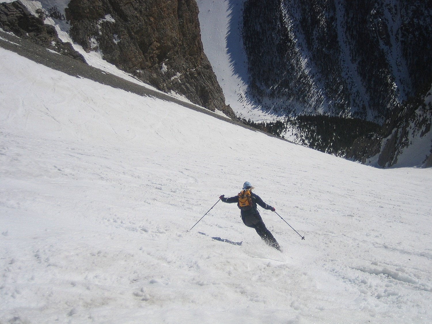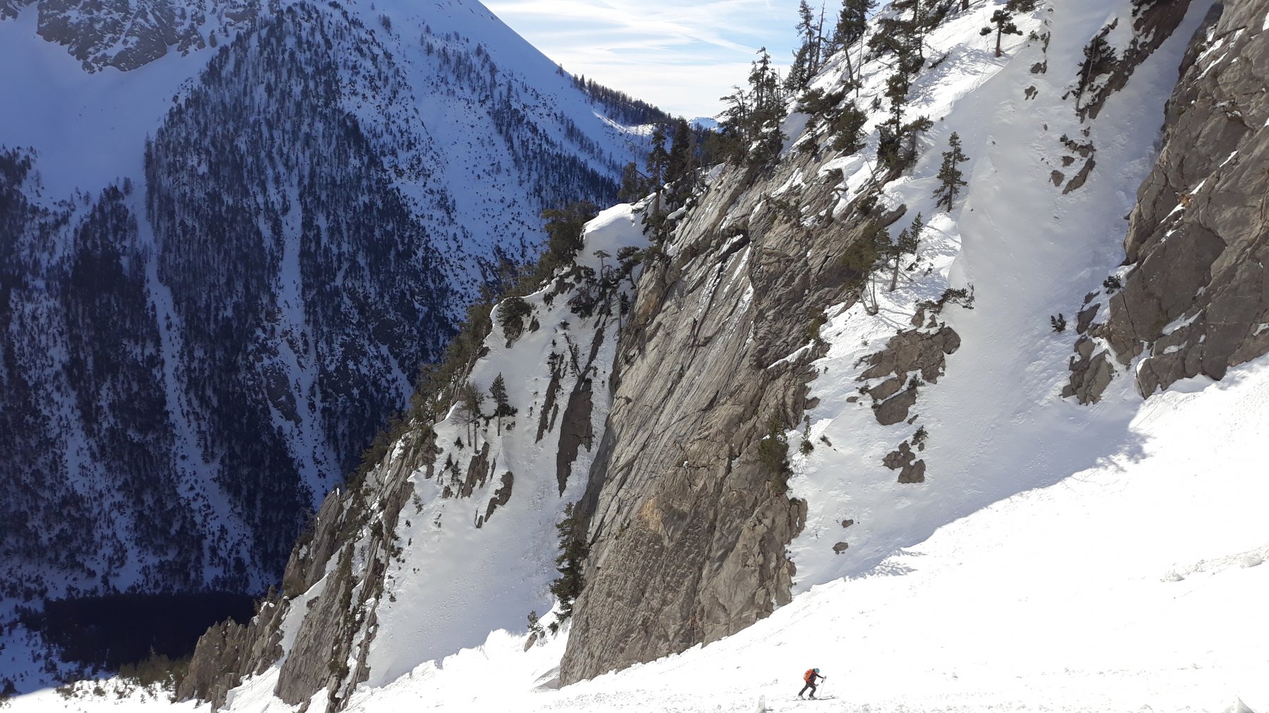 Risalire il canalone, dapprima inclinato intorno a 30°, ma che gradualmente diventa più ripido fino a sfiorare i 40° per un breve tratto, nella strettoia a 150 m. dall’uscita.