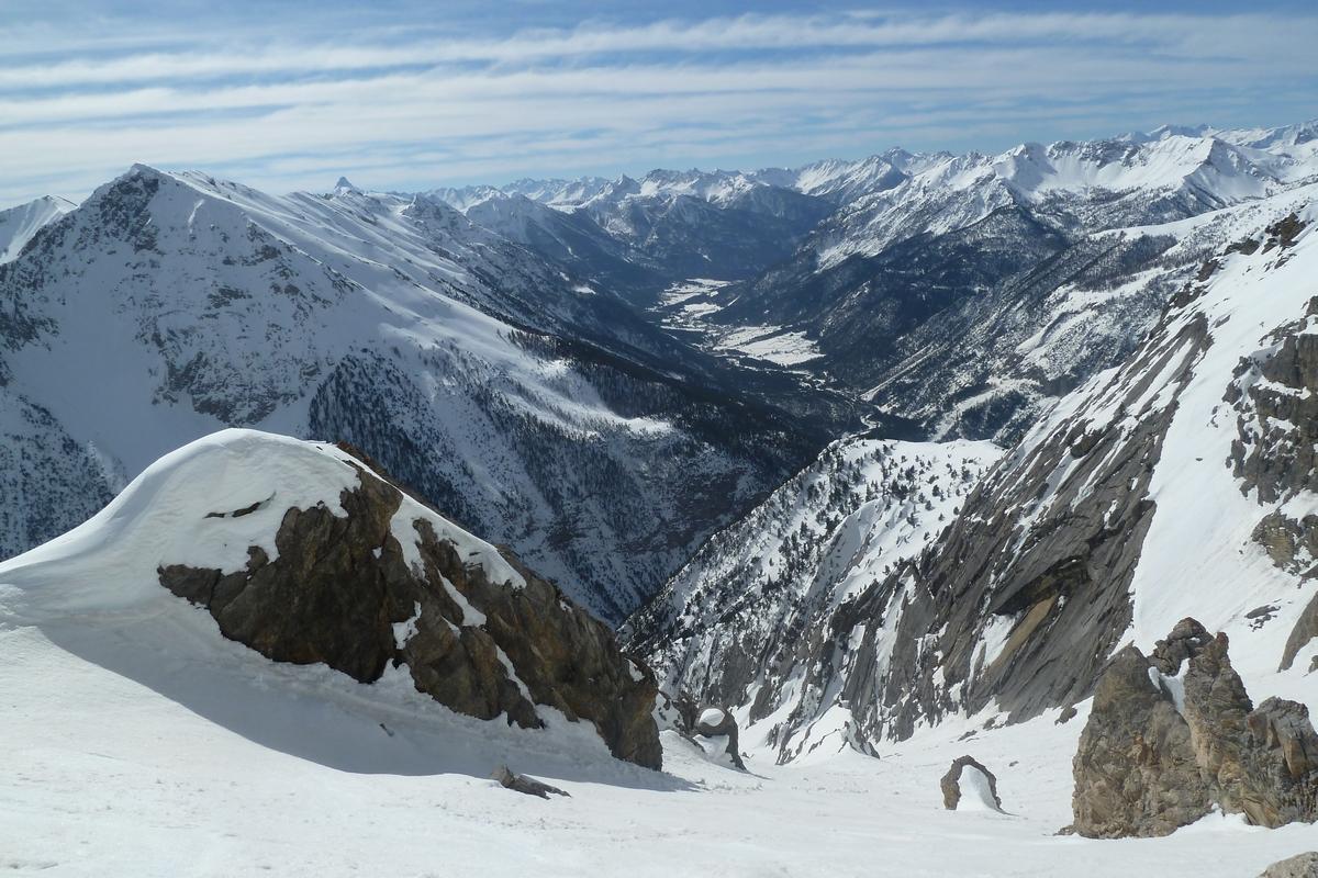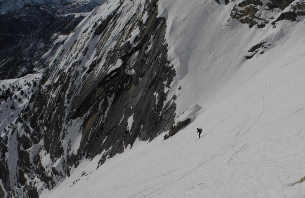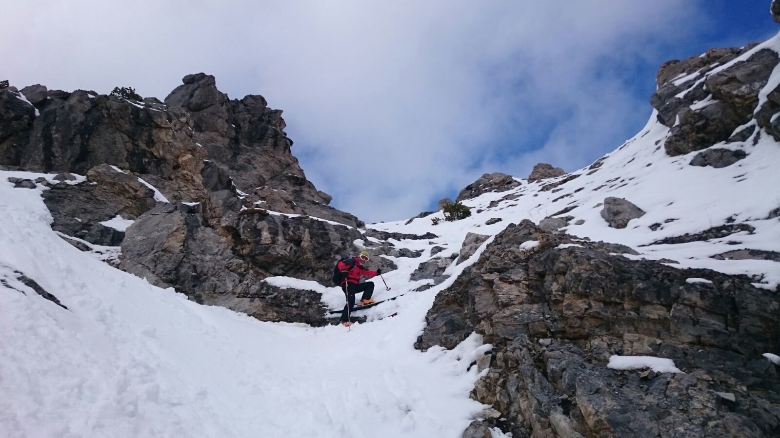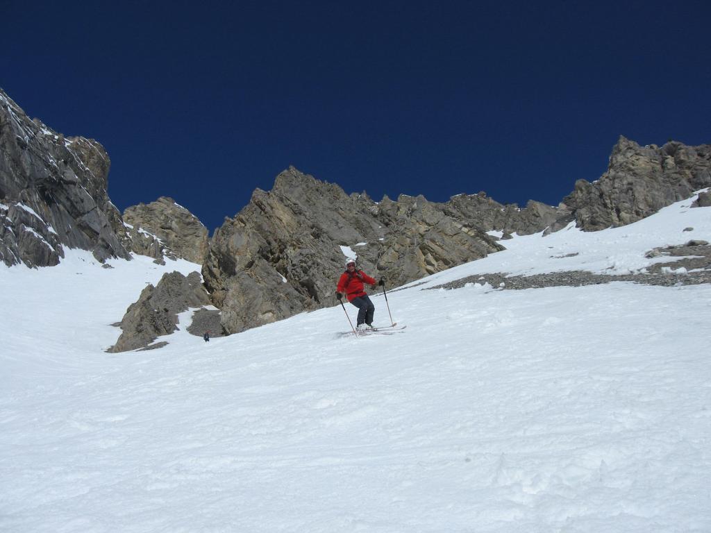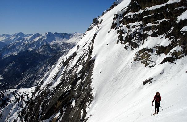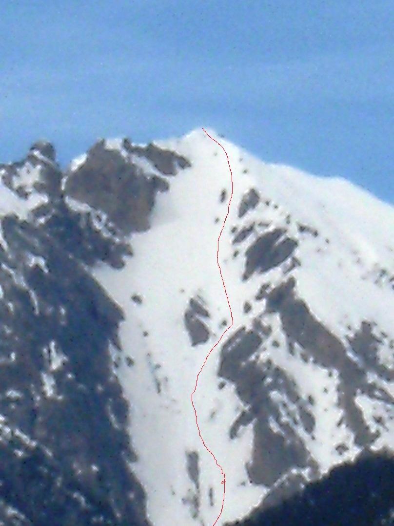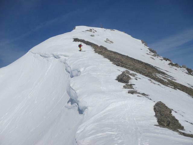Proseguire per l’ultimo ampio pendio a 35° fino all’uscita del canale, sulla cresta a breve distanza dalla vetta.